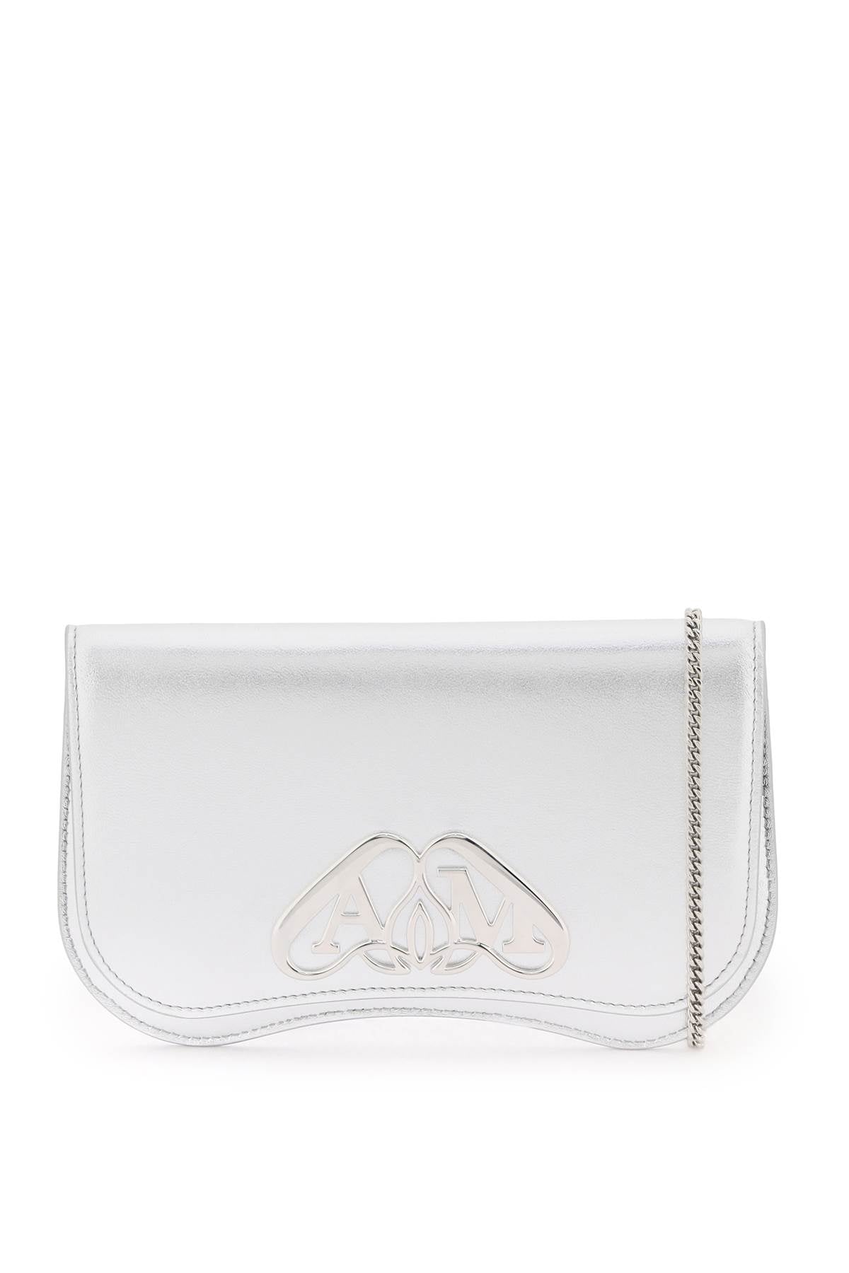 Alexander McQueen laminated leather pouch with silver metal Seal logo applied to the flap. Magentic closure, leather interior with one credit card slot and detachable chain strap. Accessory Length = 22 cm, Accessory Height = 12,5 cm,