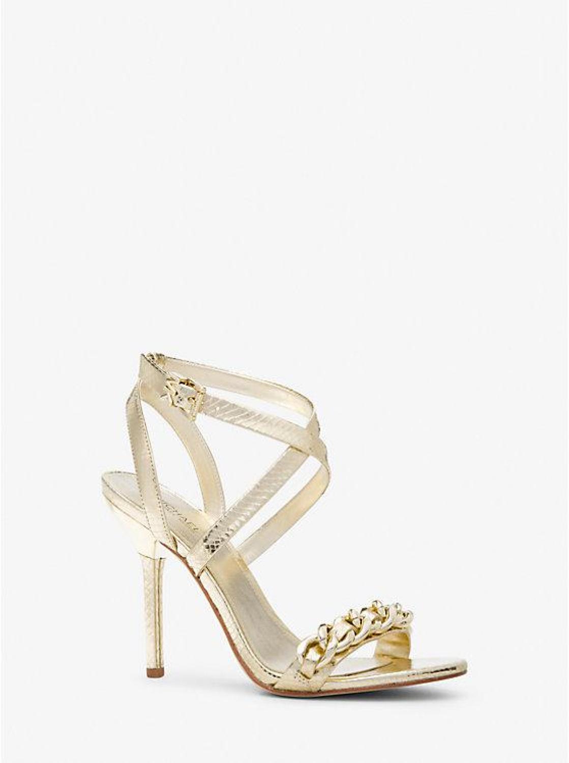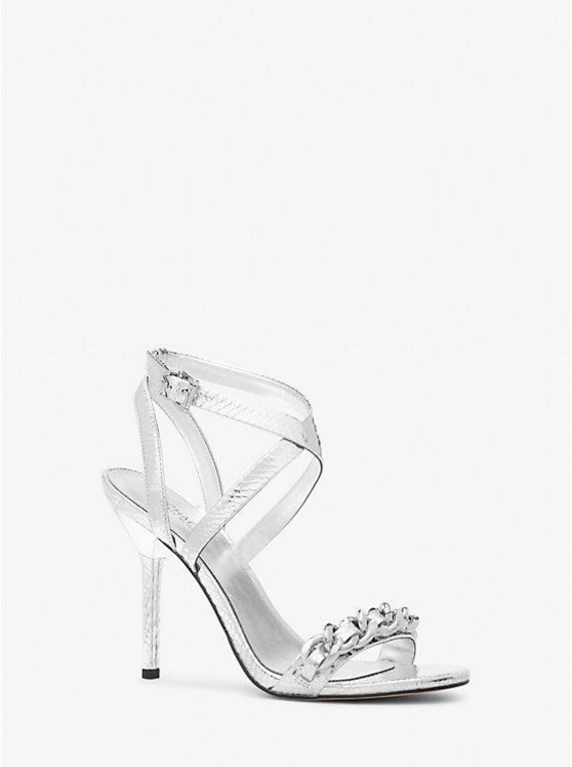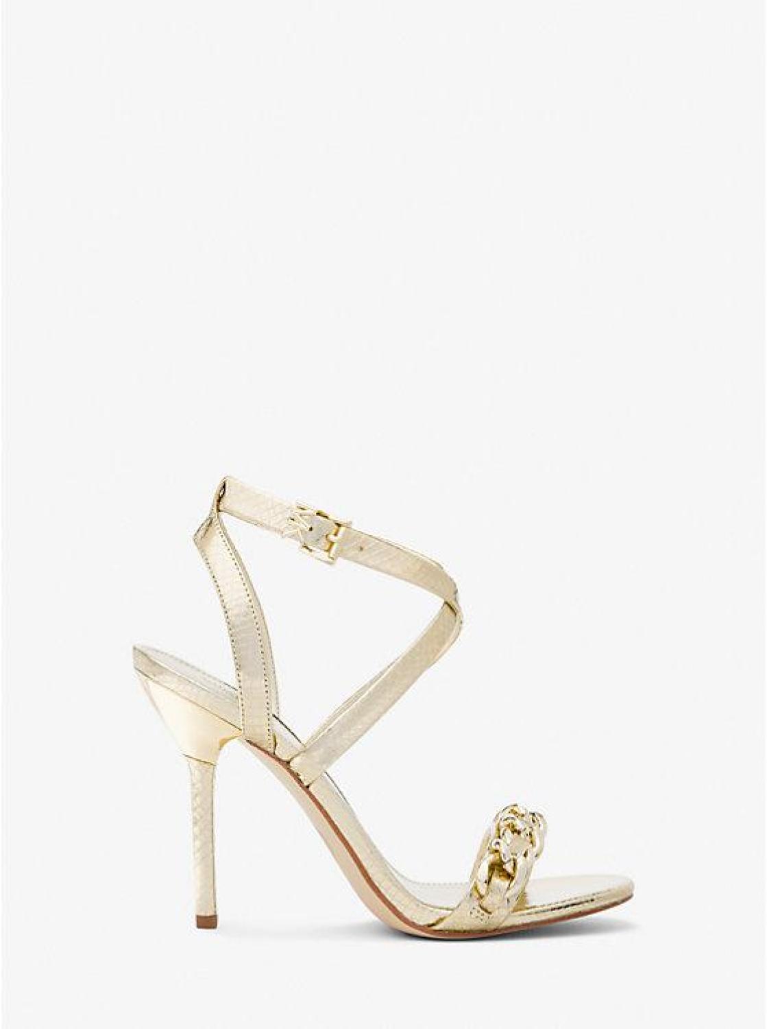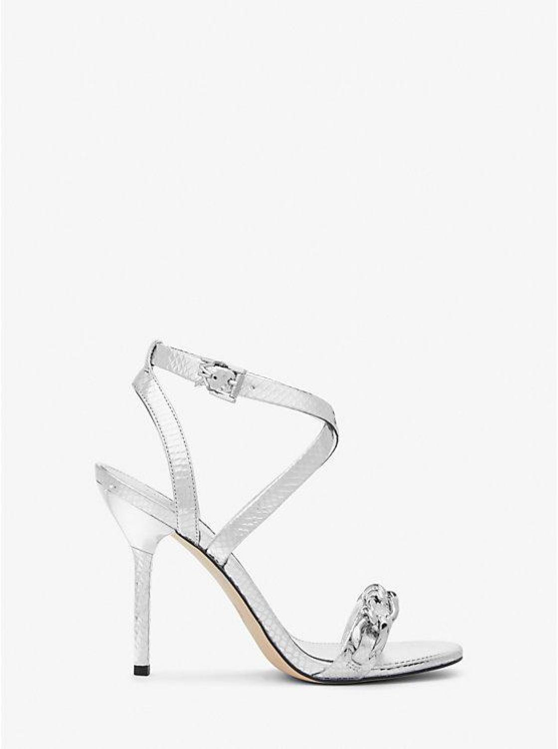 • From date nights to celebratory soirées, our Asha sandals will have you RSVP-ready. The snake-embossed leather and chain-link embellishments means they’ll instantly turn heads, while the galvanized stiletto heel adds soaring height. Wear yours with the season’s mini dresses.