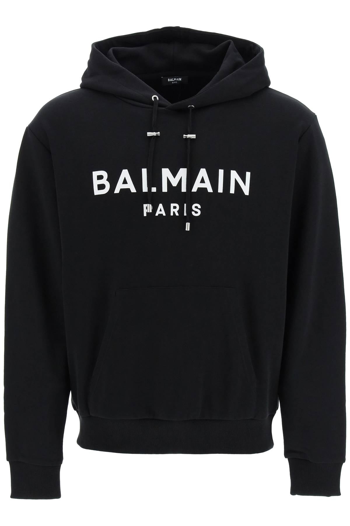 Balmain hoodie in loop-back cotton jersey, enriched by front contrasting logo print. Drawstring hood with branded stoppers, kangaroo pocket and ribbed trims. Relaxed fit. The model is 187 cm tall and wears a size L.
