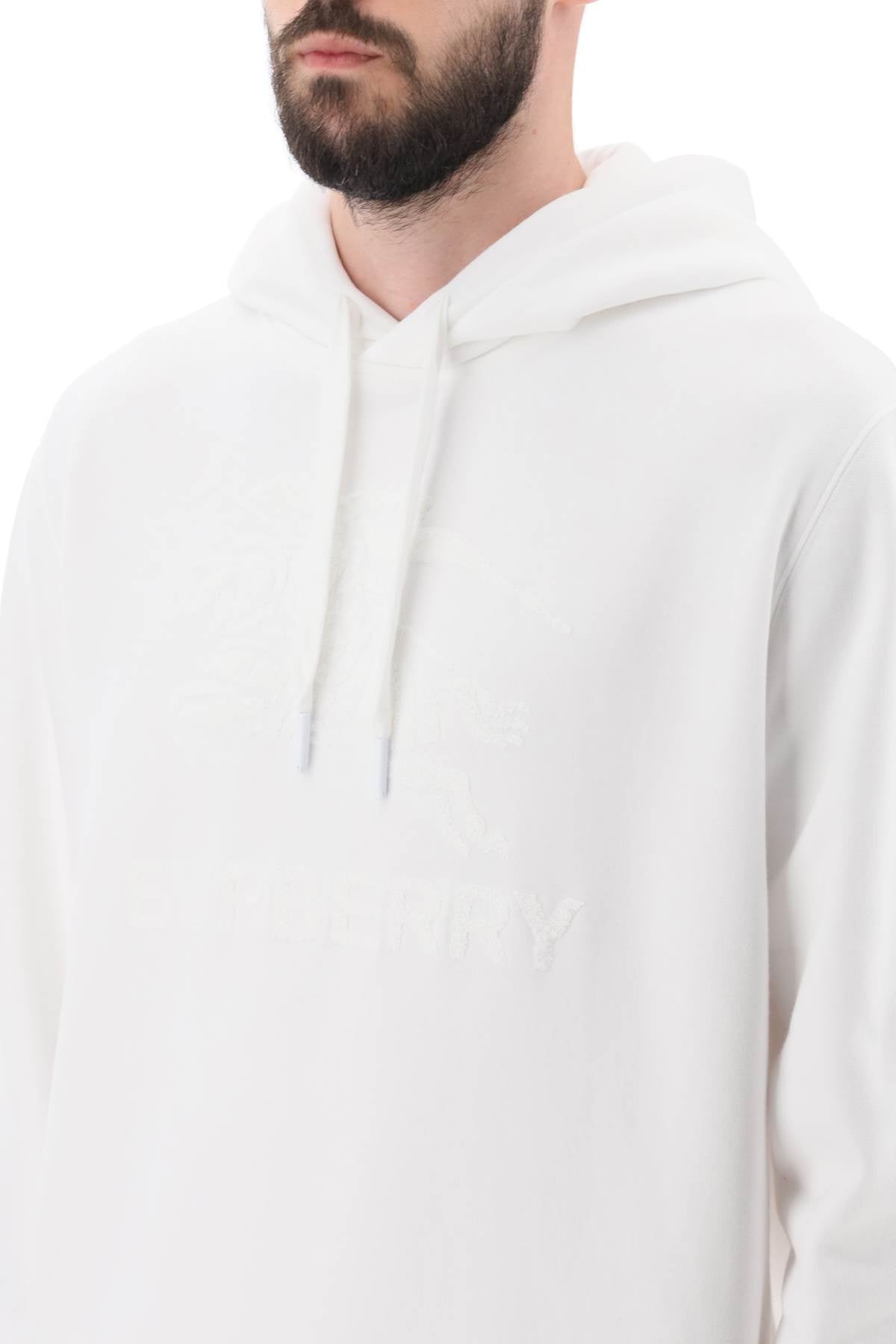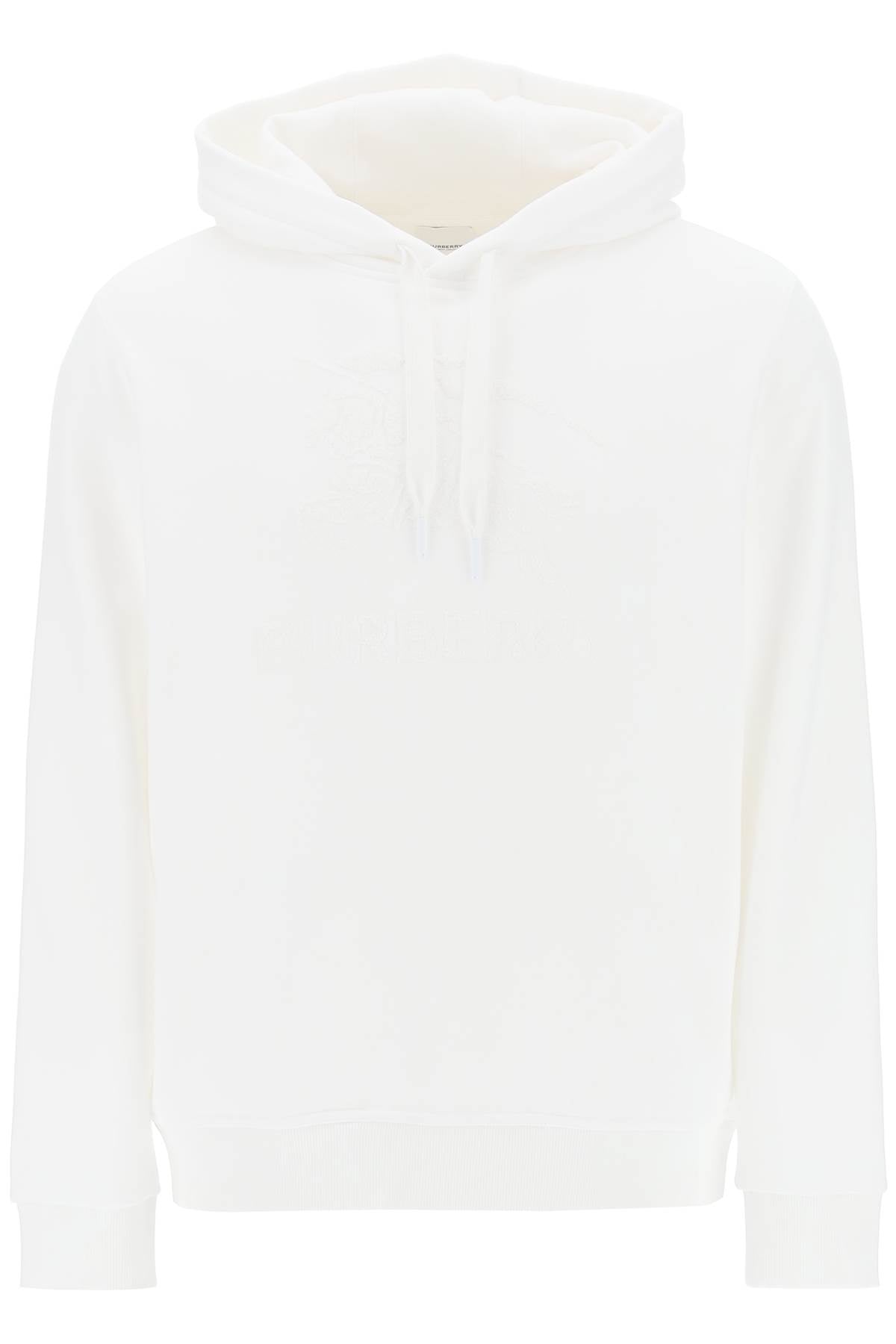 - Burberry sweatshirt crafted in pure cotton french terry with tonal EKD logo in terry cloth at chest. It features adjustable hood with drawstring, ribbed hem and cuffs. Relaxed fit. The model is 187 cm tall and wears size M.