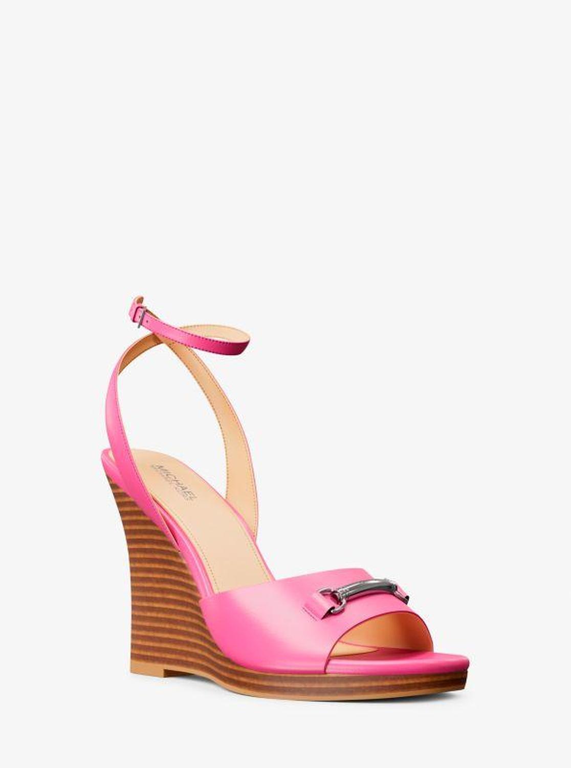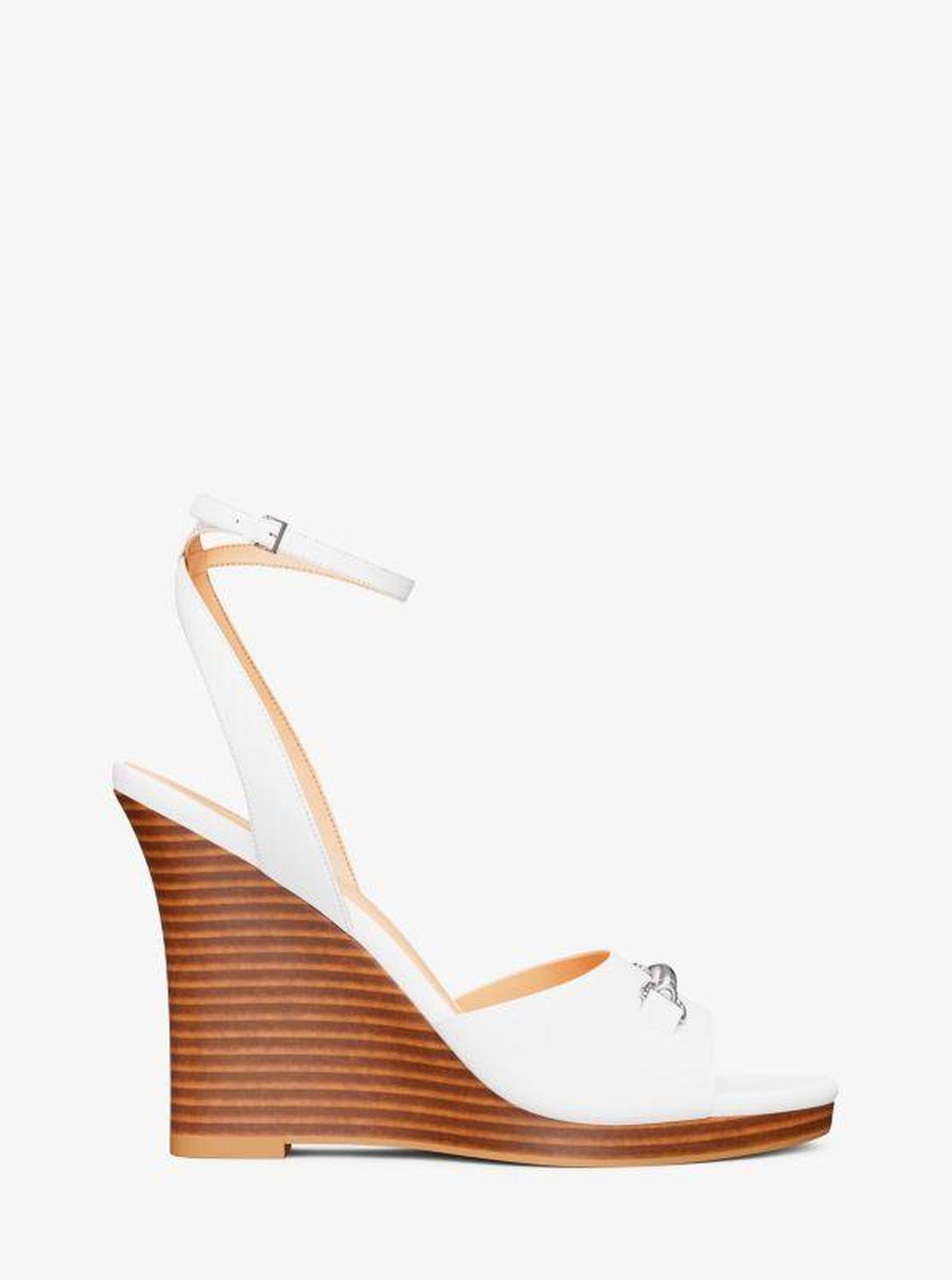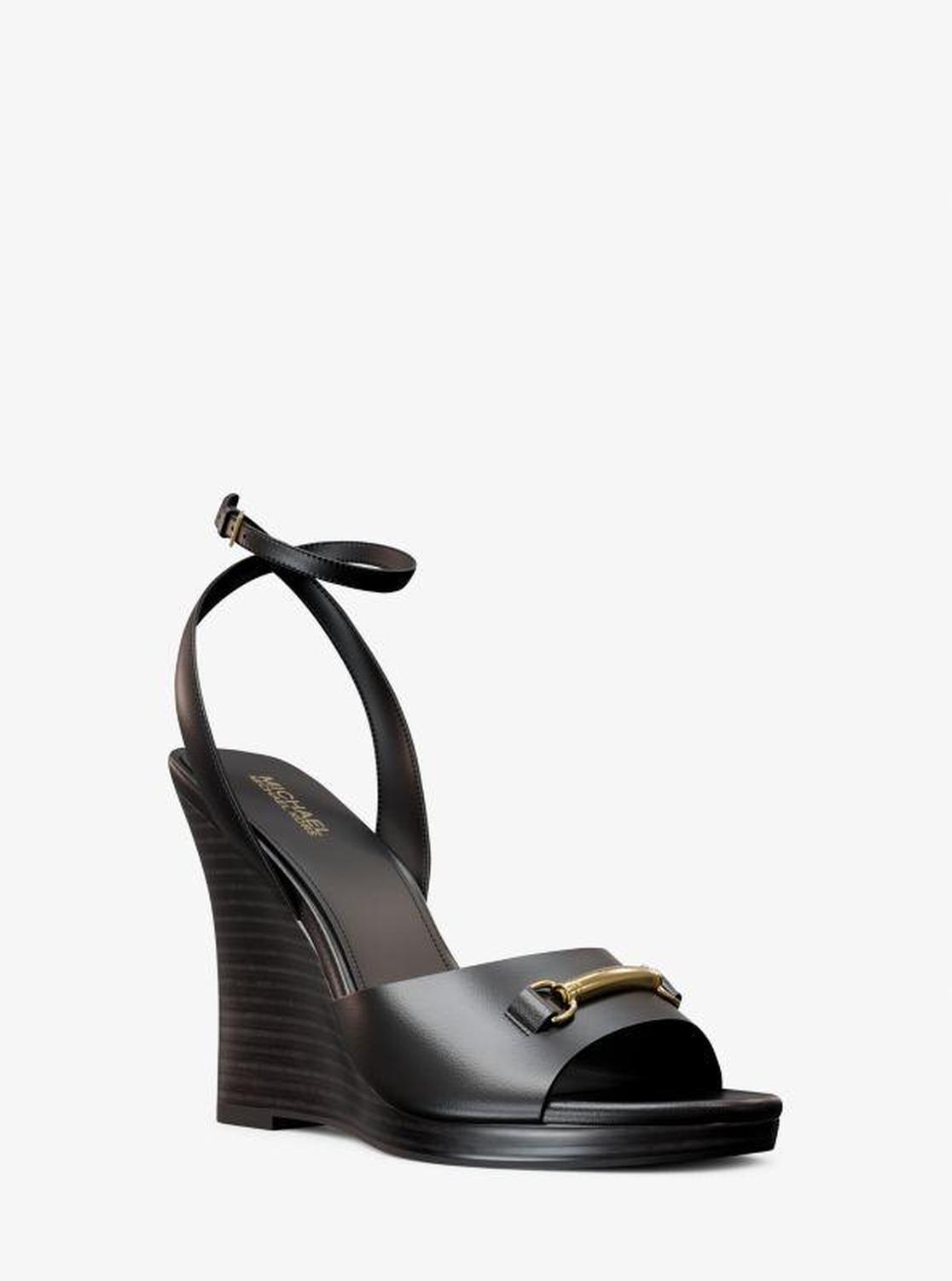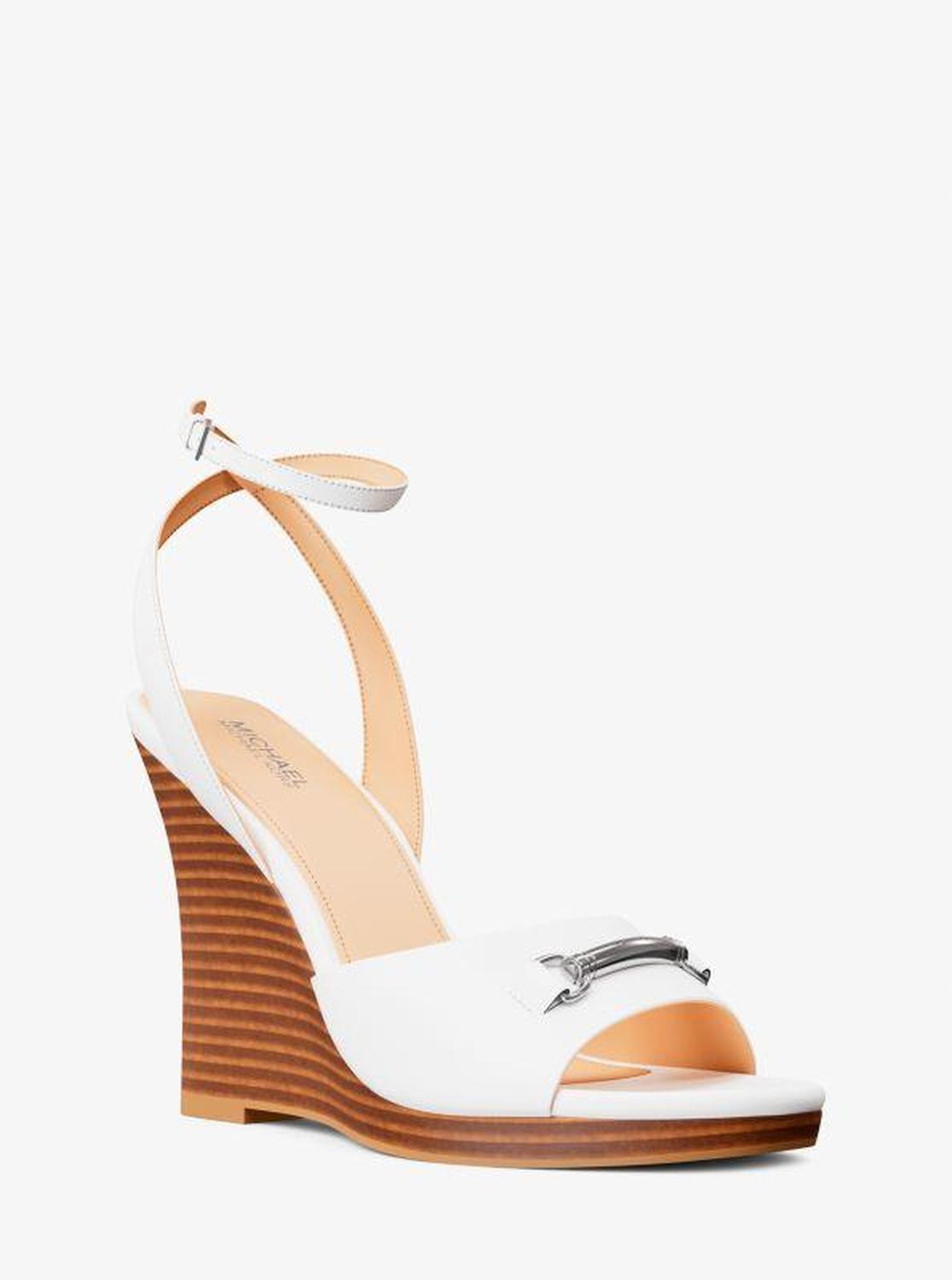Michael Kors—defining modern glamour since 1981. • Wedge sandal • Leather • Lining: polyurethane blend • Sole: rubber • Open toe • Buckle fastening • Heel height: 4.25” • Heel type: stacked • Imported • Wedge sandal • Leather • Lining: polyurethane blend • Sole: rubber • Open toe • Buckle fastening • Heel height: 4.25” • Heel type: stacked • Imported
