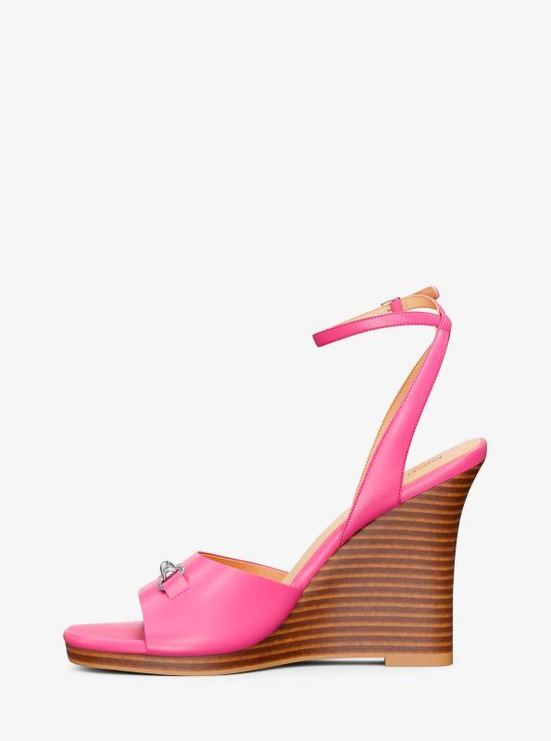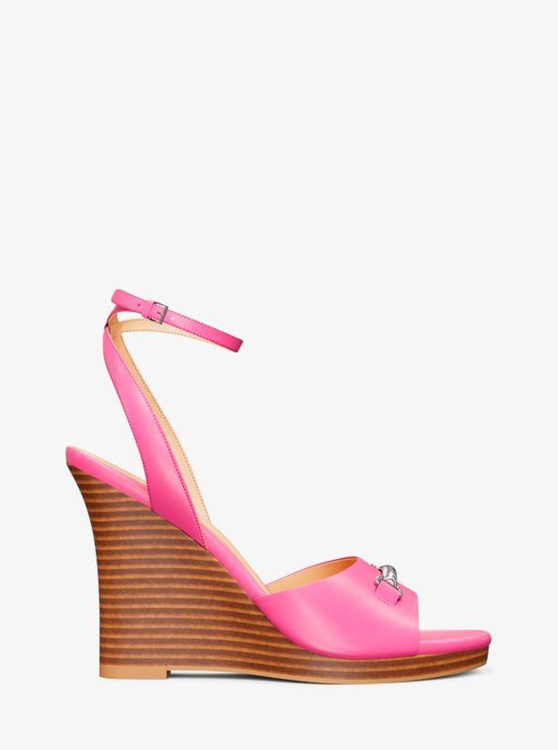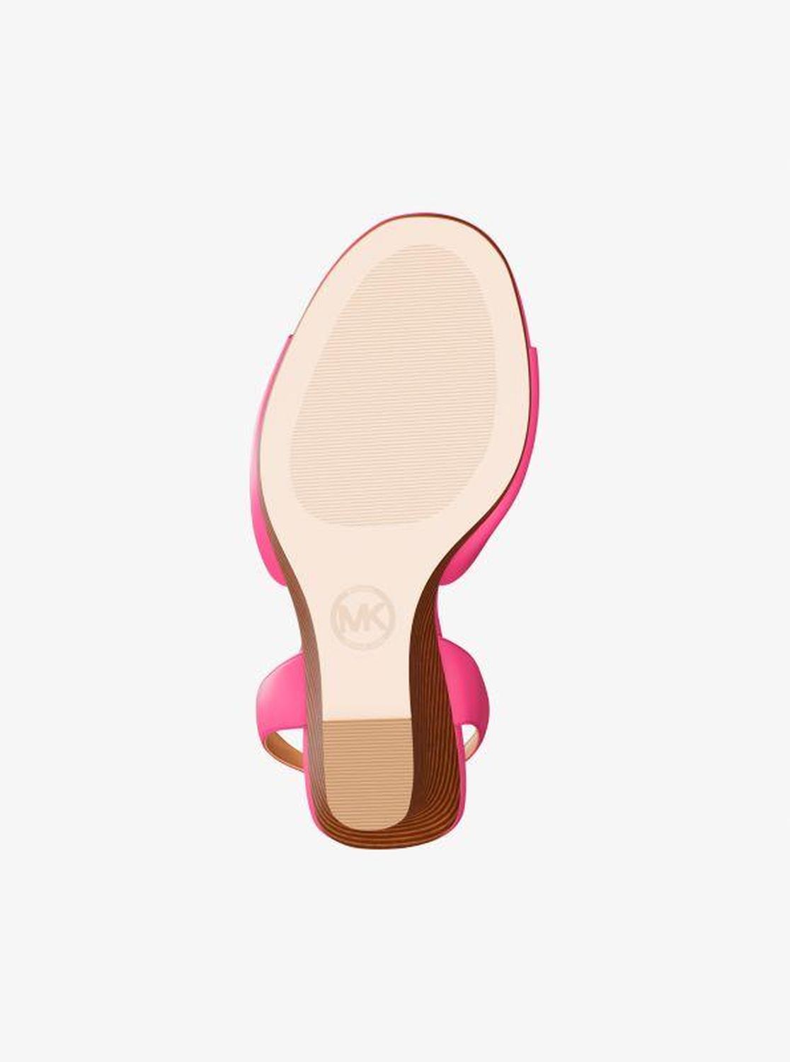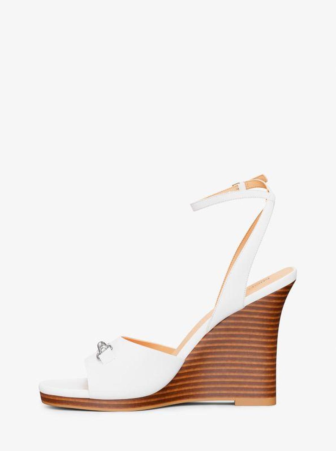 Michael Kors—defining modern glamour since 1981. • Wedge sandal • Leather • Lining: polyurethane blend • Sole: rubber • Open toe • Buckle fastening • Heel height: 4.25” • Heel type: stacked • Imported • Wedge sandal • Leather • Lining: polyurethane blend • Sole: rubber • Open toe • Buckle fastening • Heel height: 4.25” • Heel type: stacked • Imported