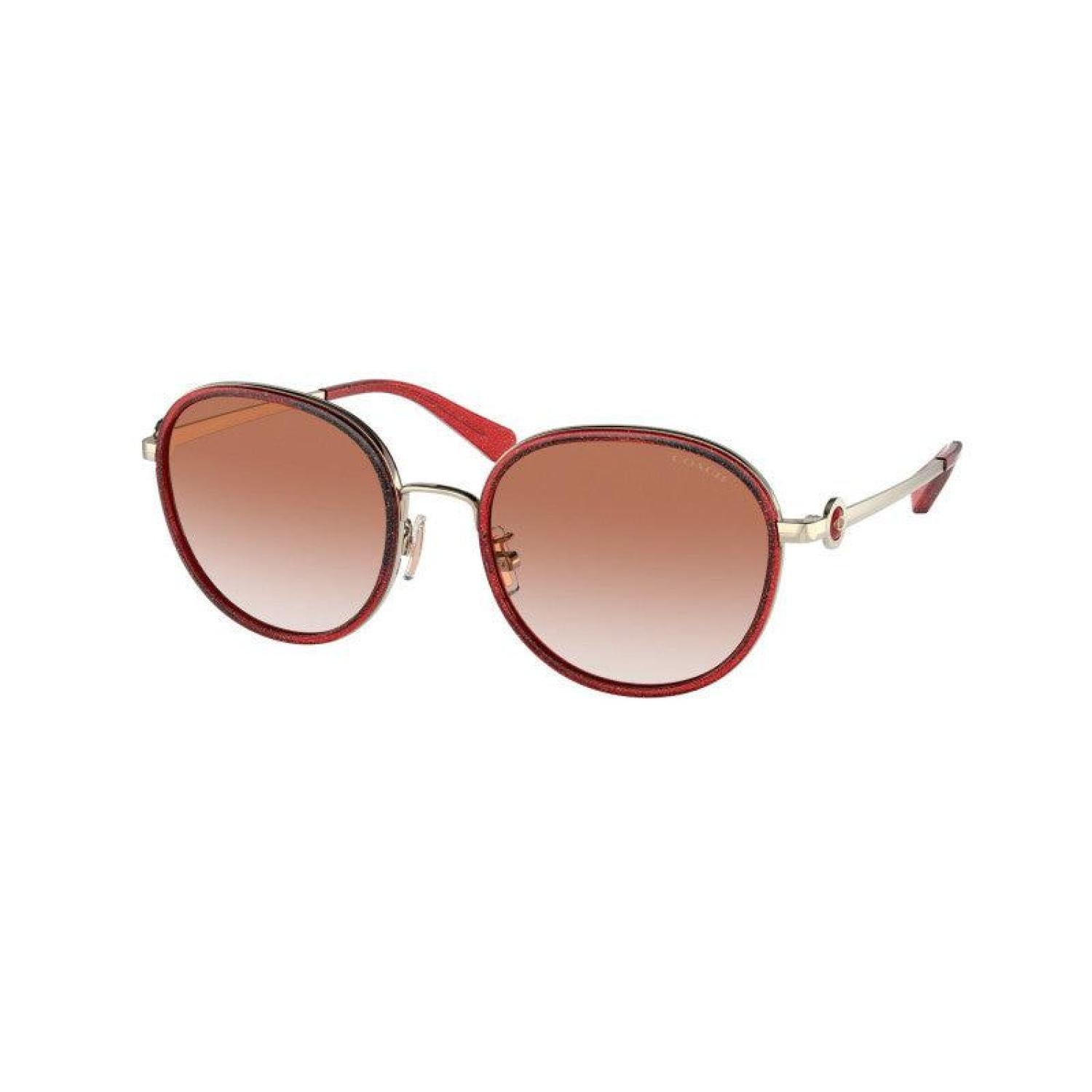 The Coach women's sunglasses measure at 54mm lens width, 19mm bridge width, and 140mm arm length. The frame is round-shaped transparent glitter red. The lenses are non-polarized burgundy. Made in China. (HC7129-554413-54)
