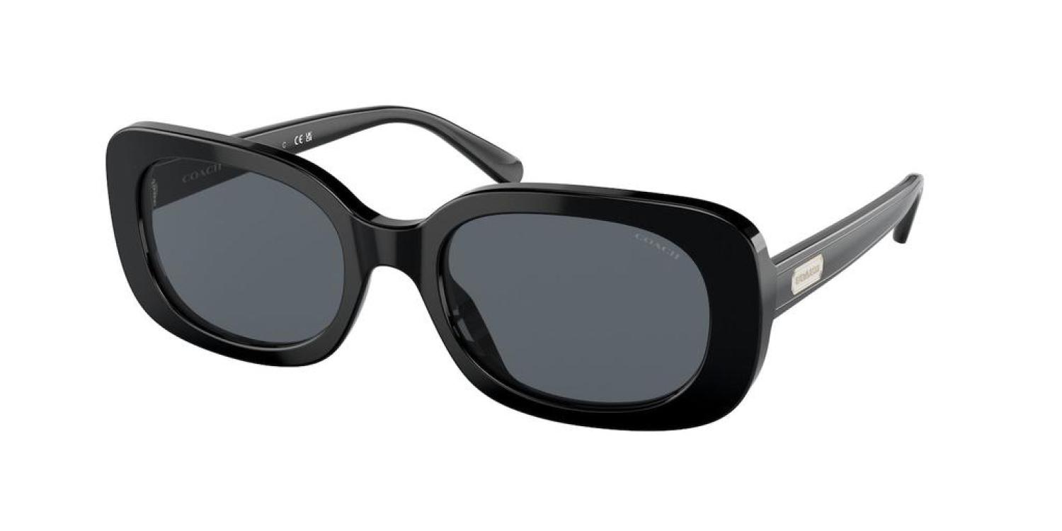 The Coach women's sunglasses measure at 56 mm lends width, 20 mm bridge width, and 145 mm arm length. The frame is oval-shaped black acetate. The lenses are dark blue solid. Made in China. (HC8358F-500280-56)