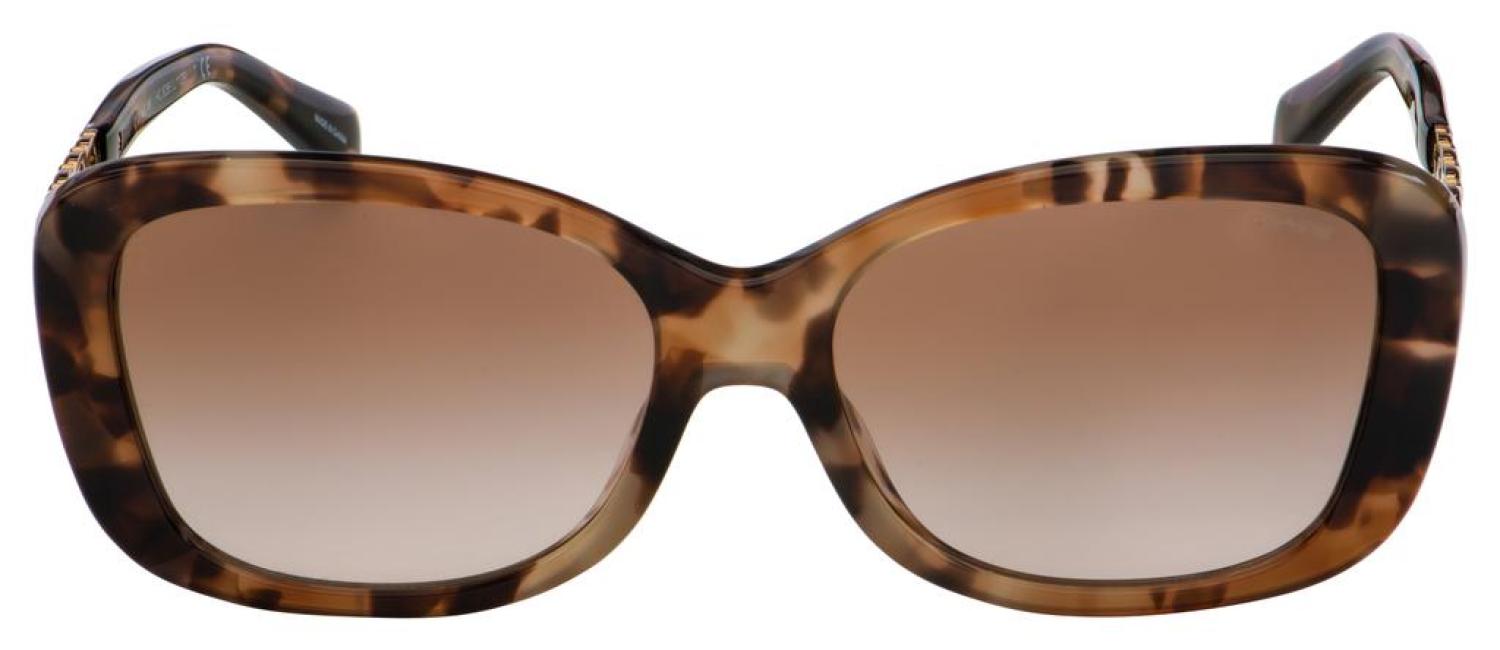 The Coach women's Sunglasses measure at a 57 mm lens width, 17 mm bridge width, and 140 mm arem length. The frame is rectangular-shaped pink tortoise pink tortoise. The lens is 100% UV protection non-polarized brown pink gradient. (HC8286-559013-57)