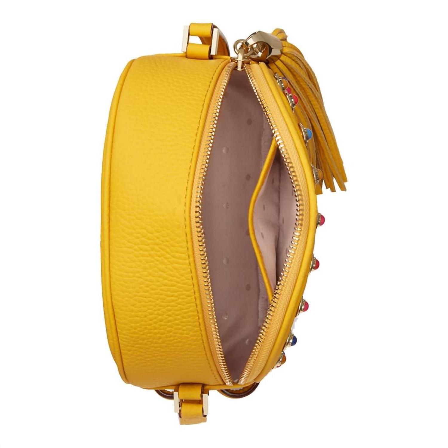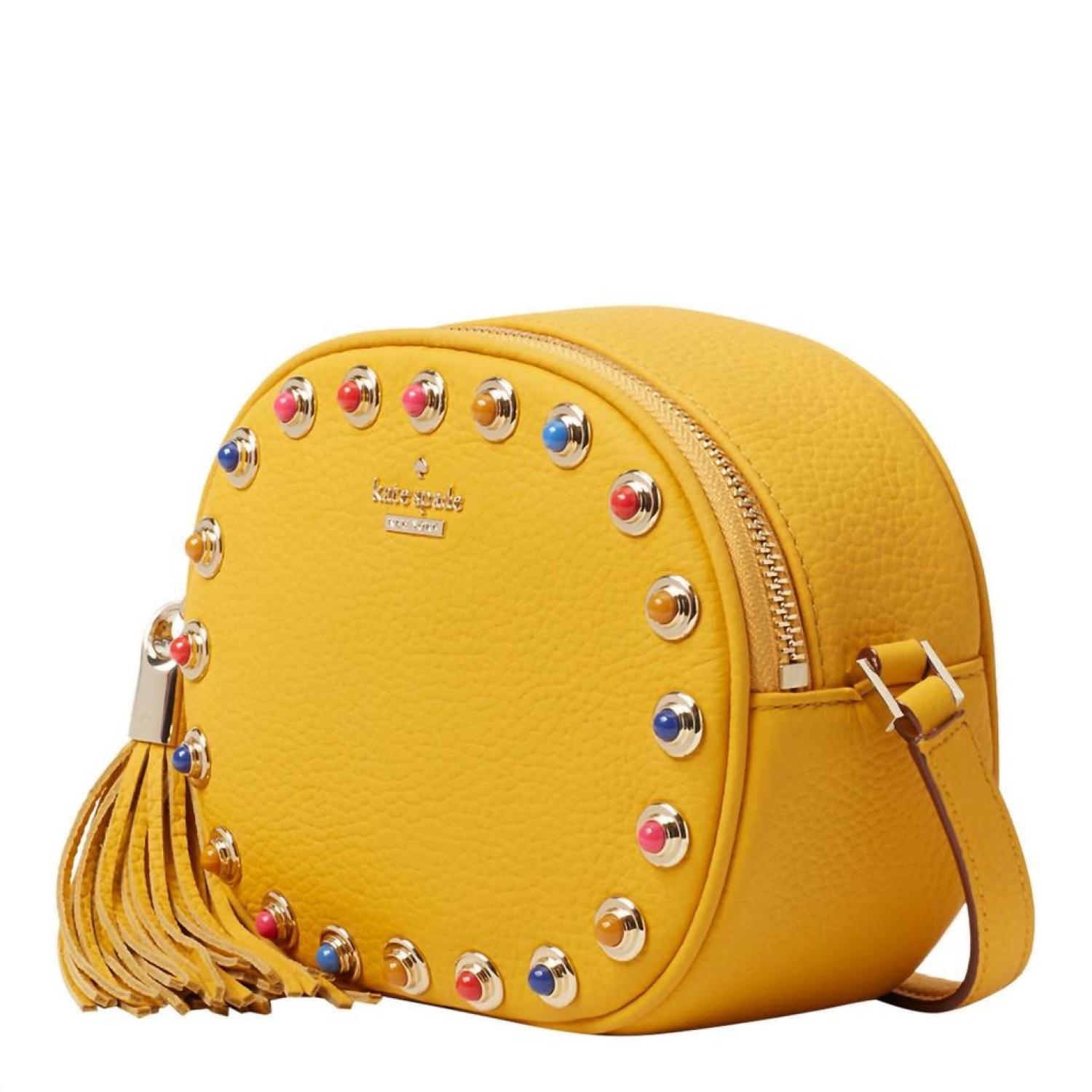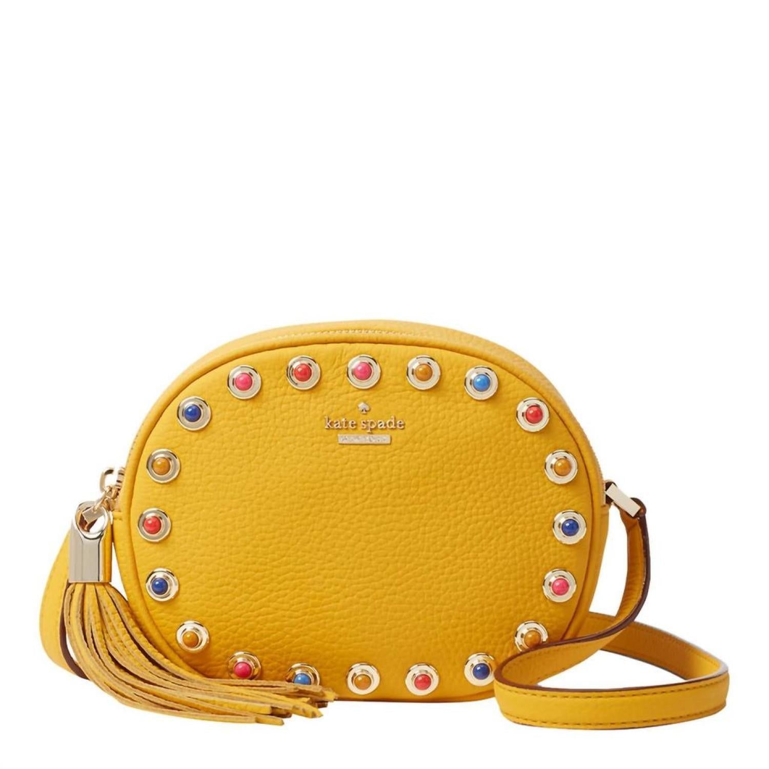 • This crossbody bag will be your go-to bag of the season.Pebbled leather crossbody bag. Golden hardware and cabochon stud trim. Removable, adjustable shoulder strap, 21.5" drop. Zip-around top closure; tassel pull. Metal logo letteringInterior, logo-jacquard lining; one slip pocket. Dimensions - 5.5"H x 7"W x 2.8"D