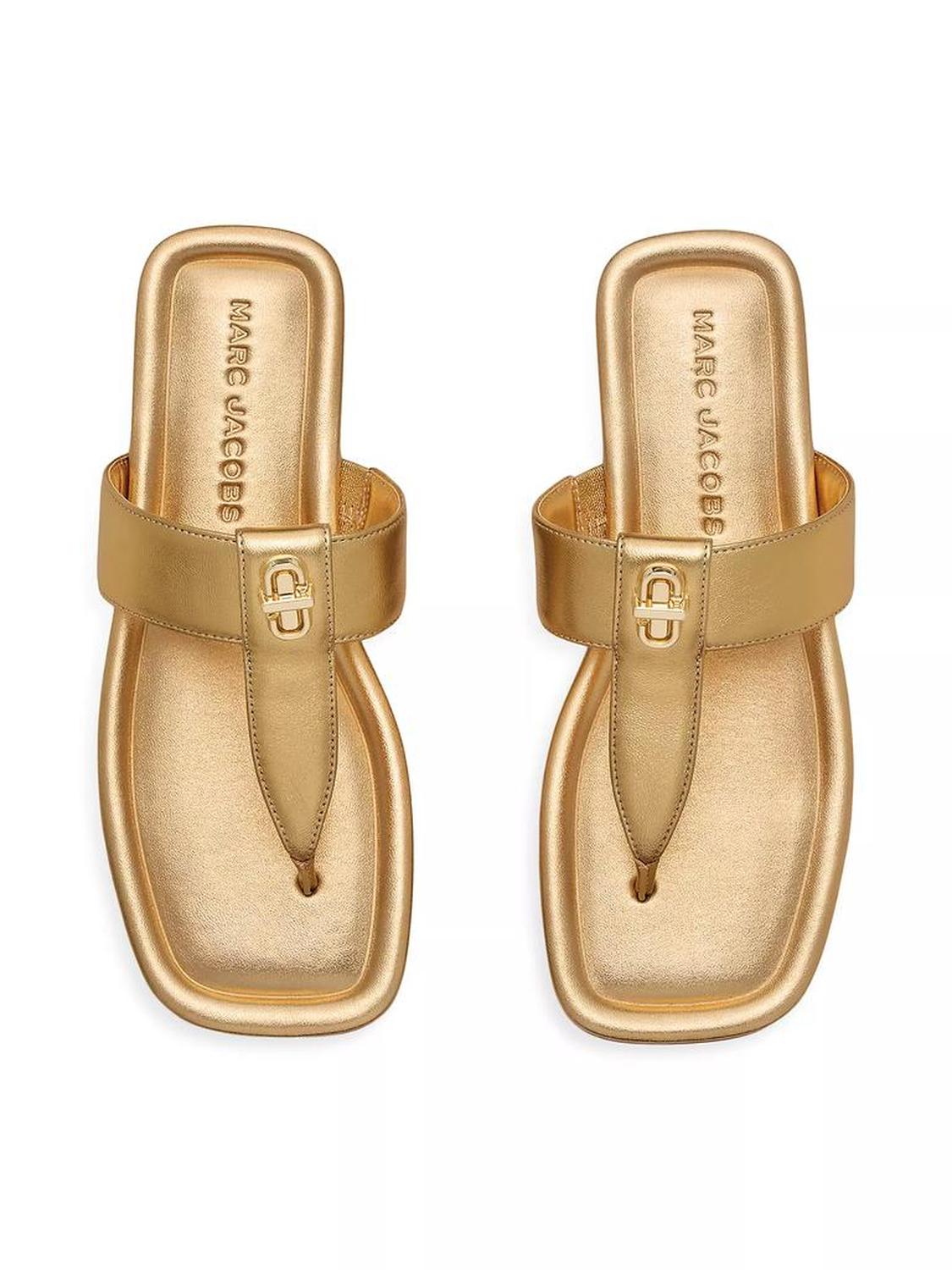 Crafted of metallic leather, Marc Jacobs' Dual T sandals showcase a T-shaped toe strap and slight heel at the sole. Open toe Slips on Leather upper Leather lining PU sole Imported Crafted of metallic leather, Marc Jacobs' Dual T sandals showcase a T-shaped toe strap and slight heel at the sole.Open toeSlips onLeather upperLeather liningPU soleImported