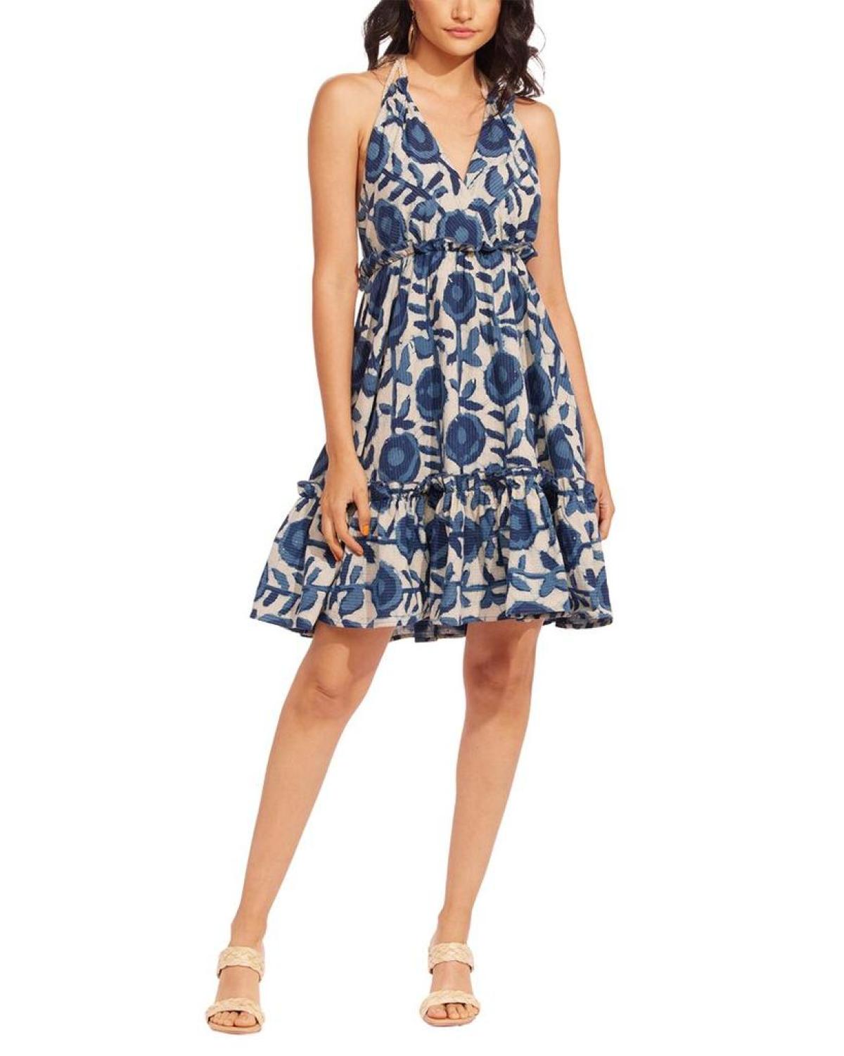 Introducing the stunning Eva Franco Trixie Mini Dress in the vibrant Contessa Bloom color/pattern. This fit and flare mini dress features a relaxed fit and halter neck ties in the back for a chic and stylish look. With a center back zipper, this dress is easy to slip into and offers a comfortable fit. Made from 100% cotton with a 100% polyester lining, this dress is perfect for any special occasion. Hand wash recommended. Proudly made in the USA.
