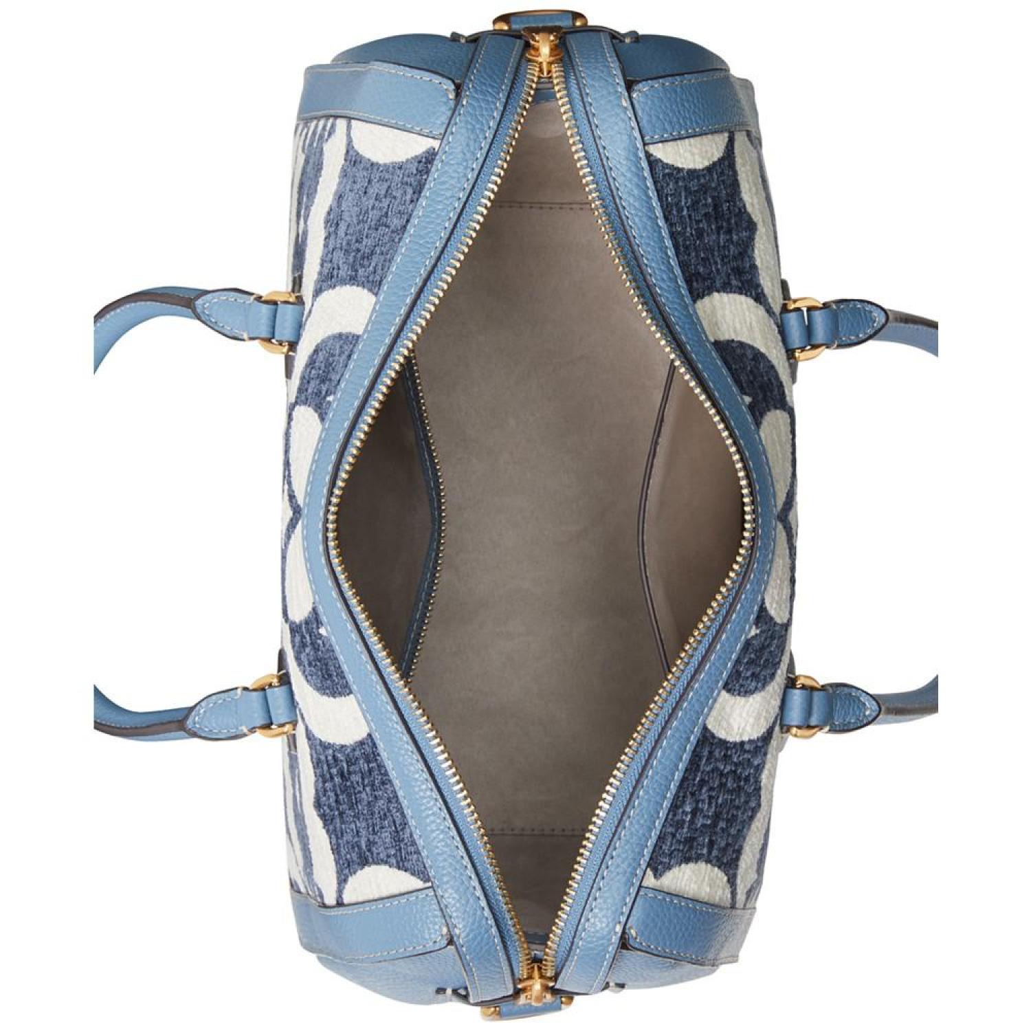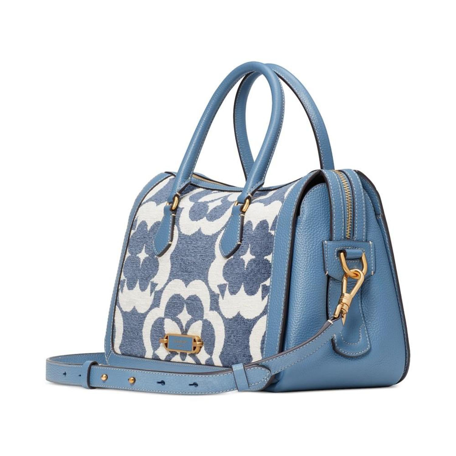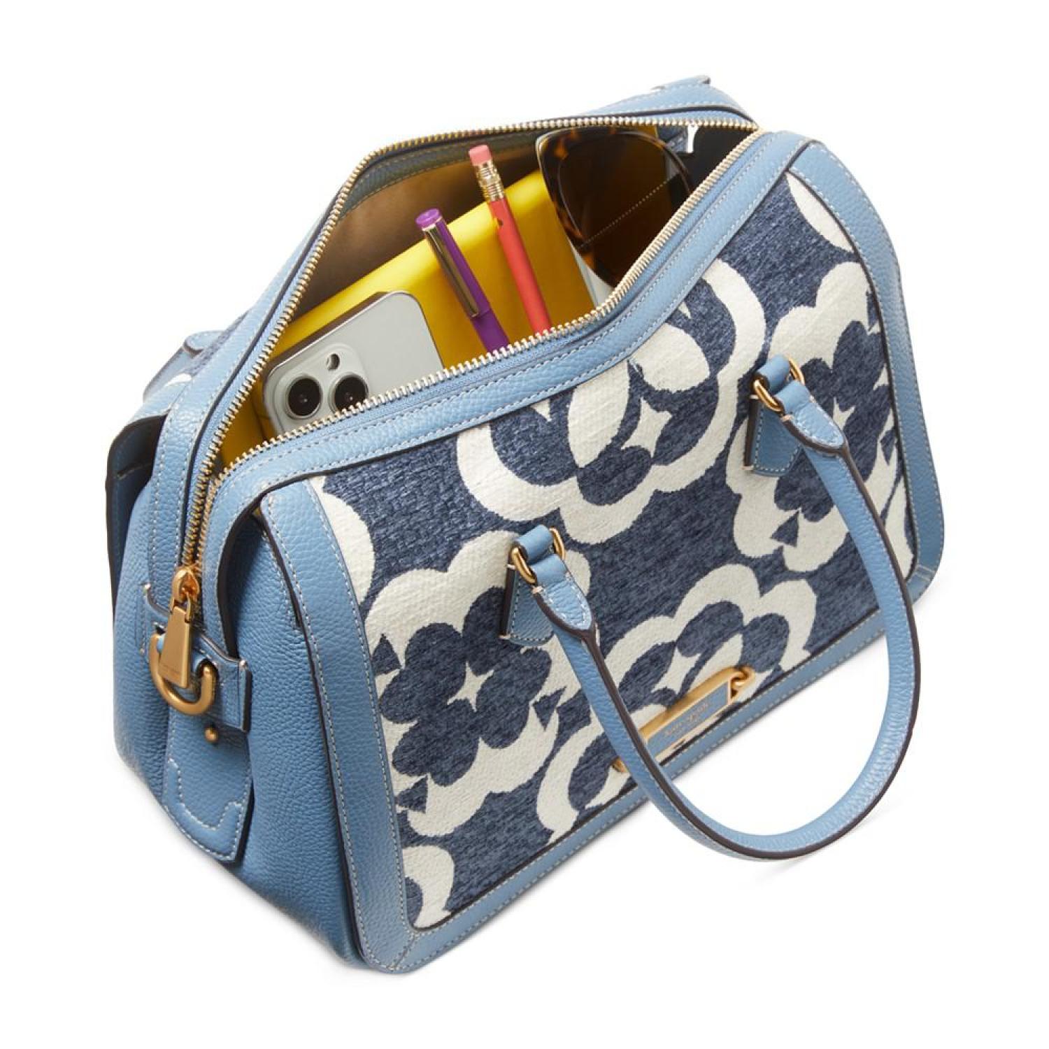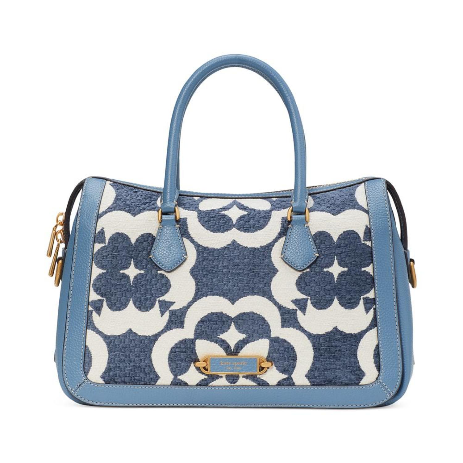 Stand out from the crowd with this chic Spade Flower monogram satchel by kate spade new york. Small sized bag; 11-3/4 "W x 7-7/8"H x 5-9/10"D (width is measured across the bottom of the bag) Silhouette is based off 5'9" model 5"L handle; 22"L removable, adjustable strap Zip-top closure Warm gold-tone hardware Interior zip & slip pockets Leather/chenille textile Spot clean Imported