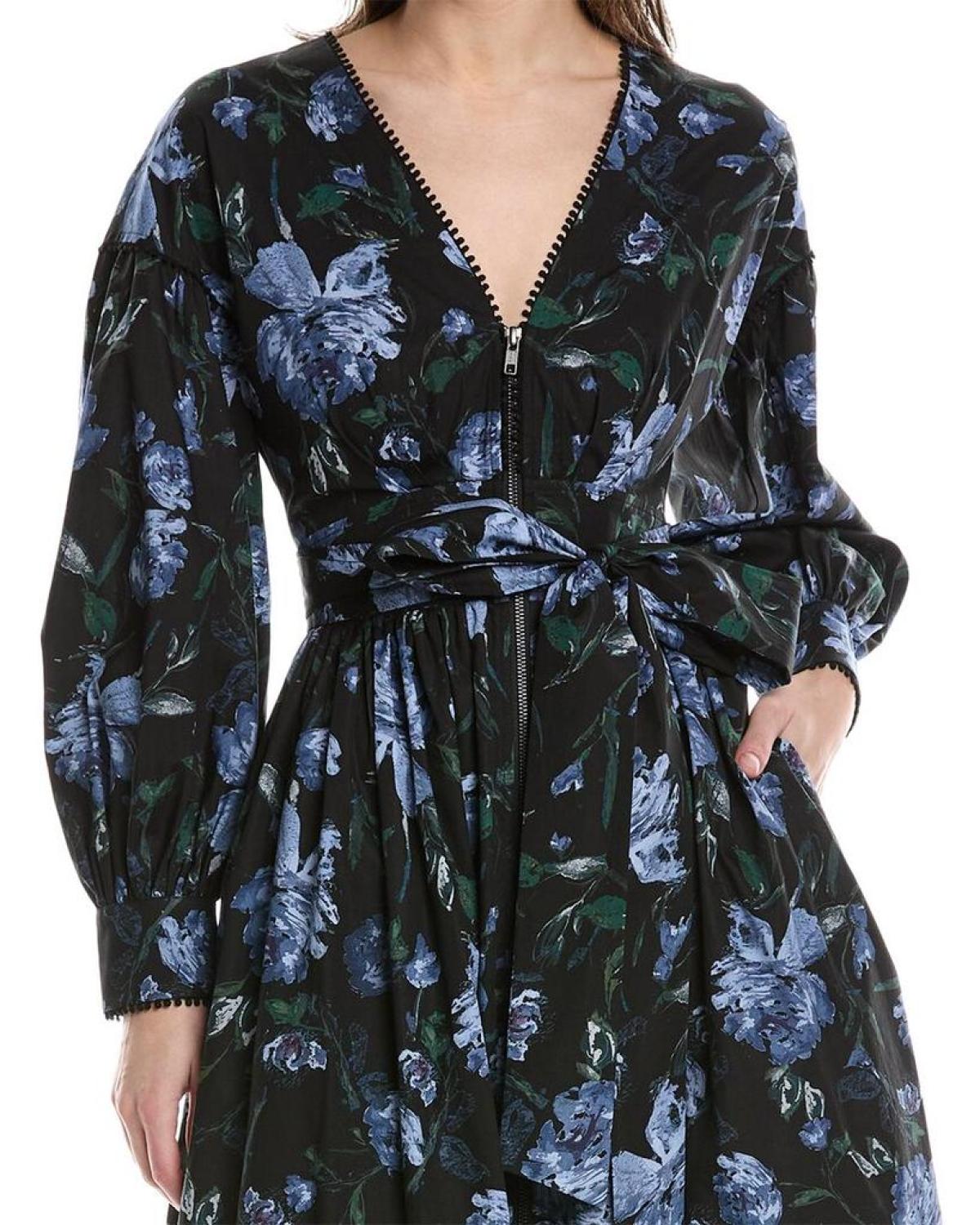 Introducing the stunning Marchesa Notte Indigo Midi Dress, perfect for any special occasion. This elegant dress features a storm blue and black poplin design with a sash at the waist, balloon sleeves, and convenient side seam pockets. With a front zipper for easy wear, this dress is approximately 55 inches from shoulder to hem. Made from 100% cotton, this dress is dry clean only and imported. Whether you're attending a formal event or a cocktail party, this dress is sure to make a statement. Shop now for your next evening out!
