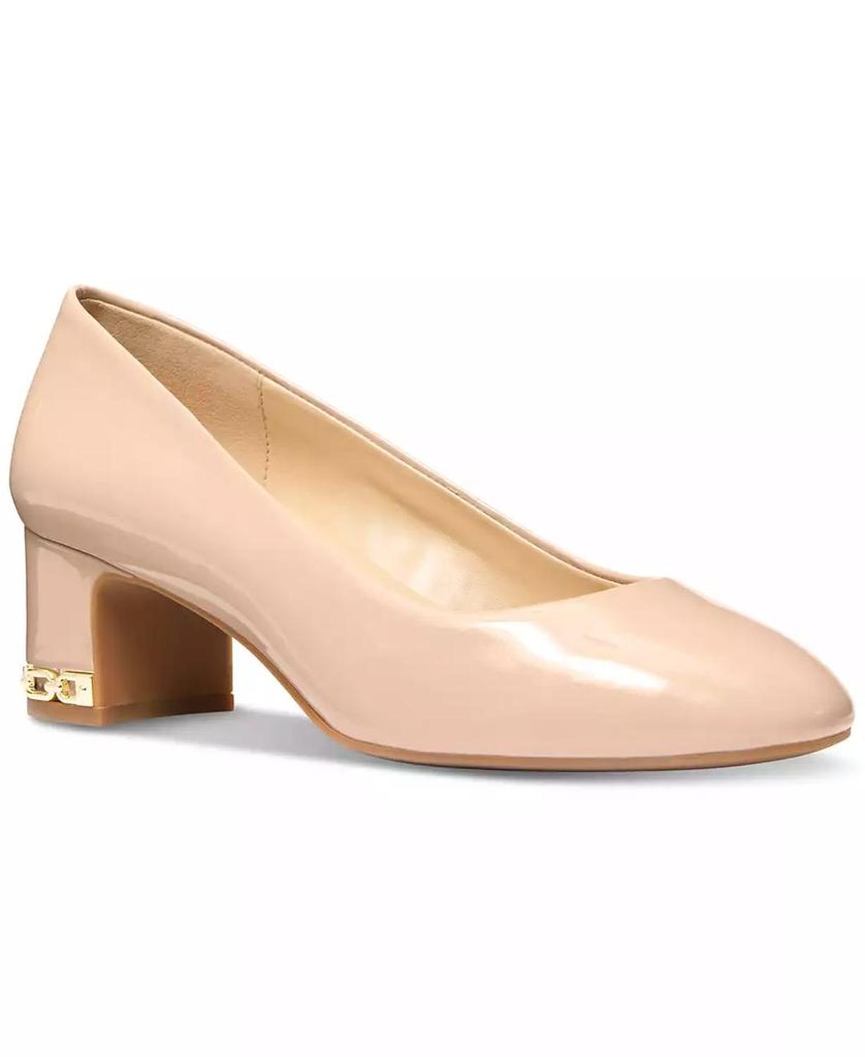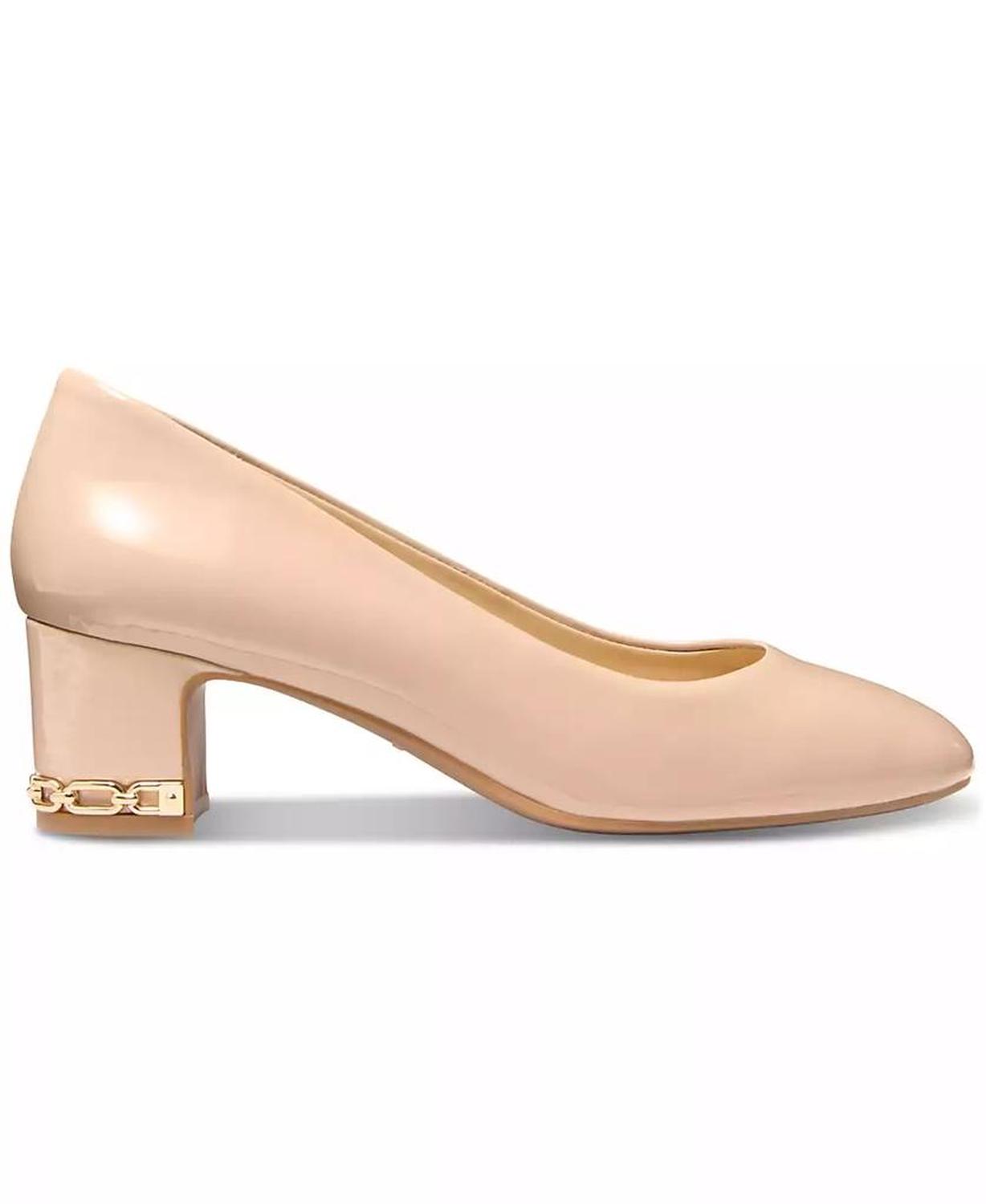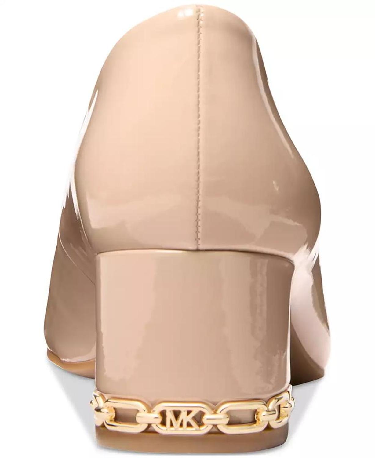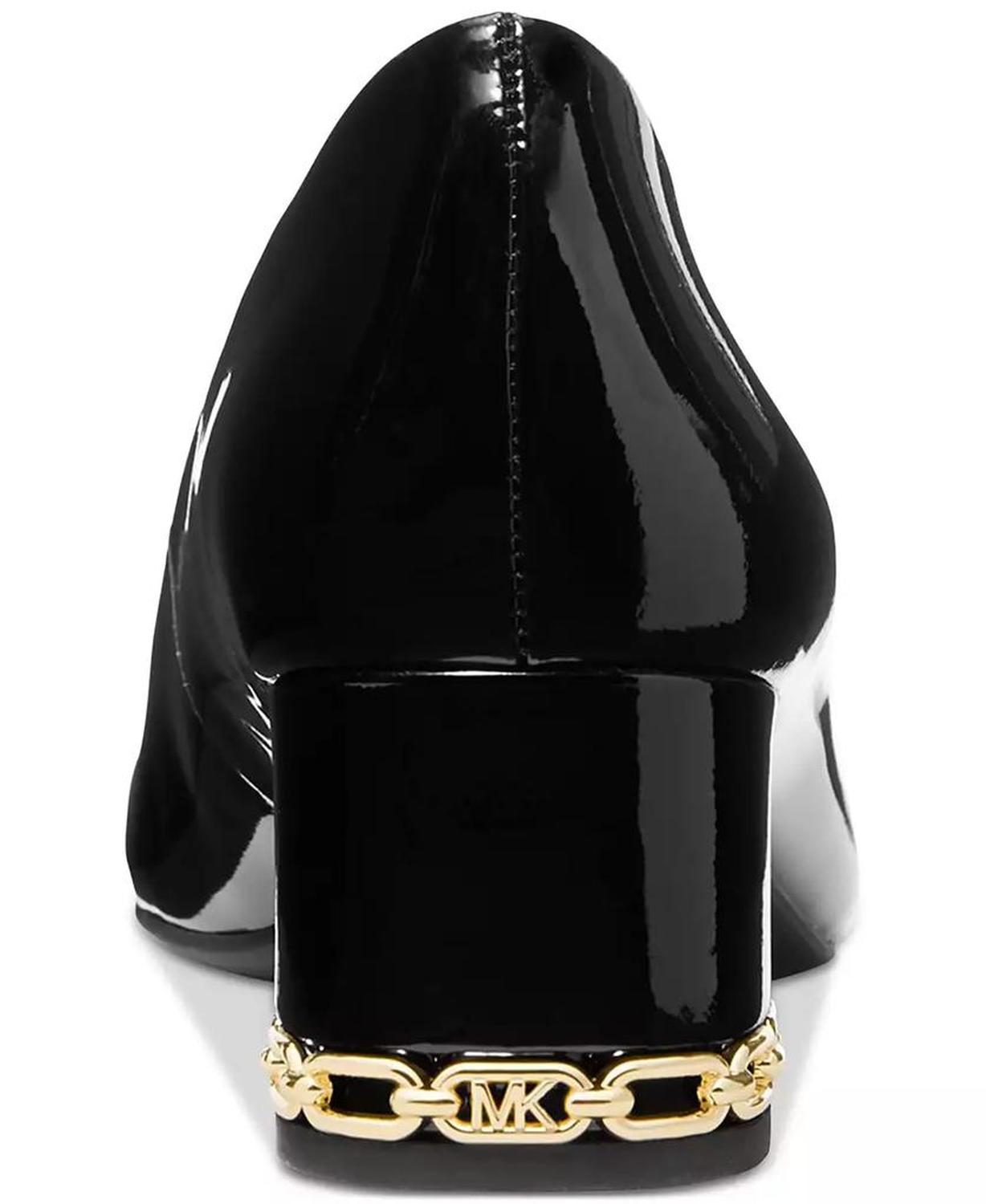 A staple to pair with everything from tailored skirts to cropped slacks, the MICHAEL Michael Kors June pumps slip on with subtle chain detailing at chunky heels. Wrapped heel: 2" Almond toe Slip on Logo detailing; embellishment at heel Upper: 100% leather; lining: 100% manmade; sole: 100% rubber Imported