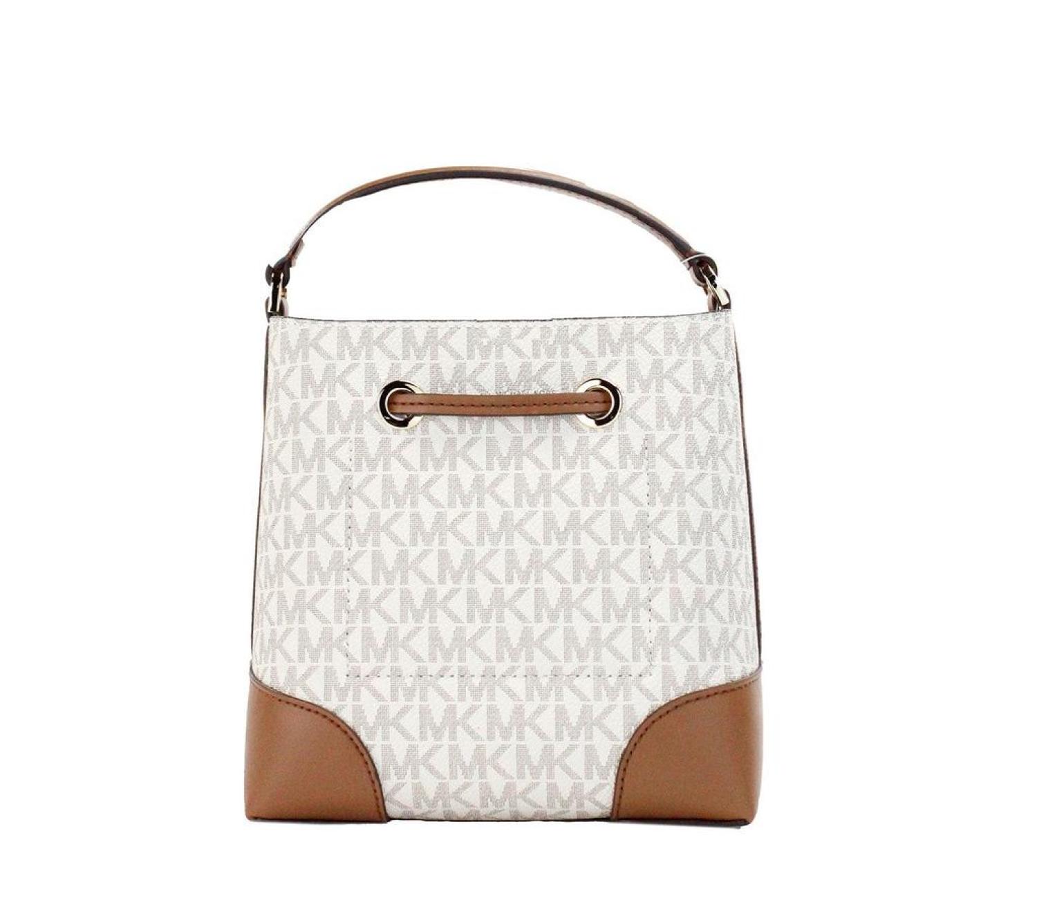 Style - Michael Kors Mercer Small Bucket Drawstring Handbag (Vanilla Signature)Material - Signature PVC with Smooth Leather Handle/DrawstringFeatures - Front MK Logo Plate Accent, Drawstring Closure, Adjustable/Detachable Crossbody StrapMeasures - 17.78 cm H x 19.05 cm W x 10.16 cm D