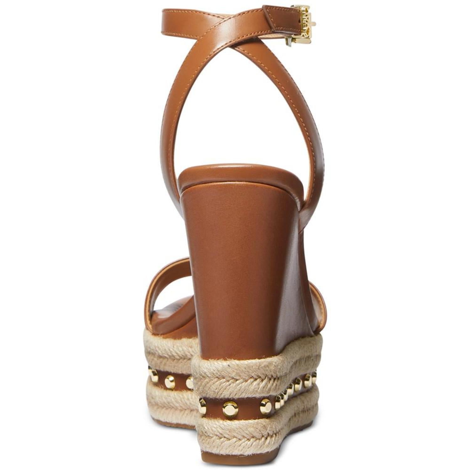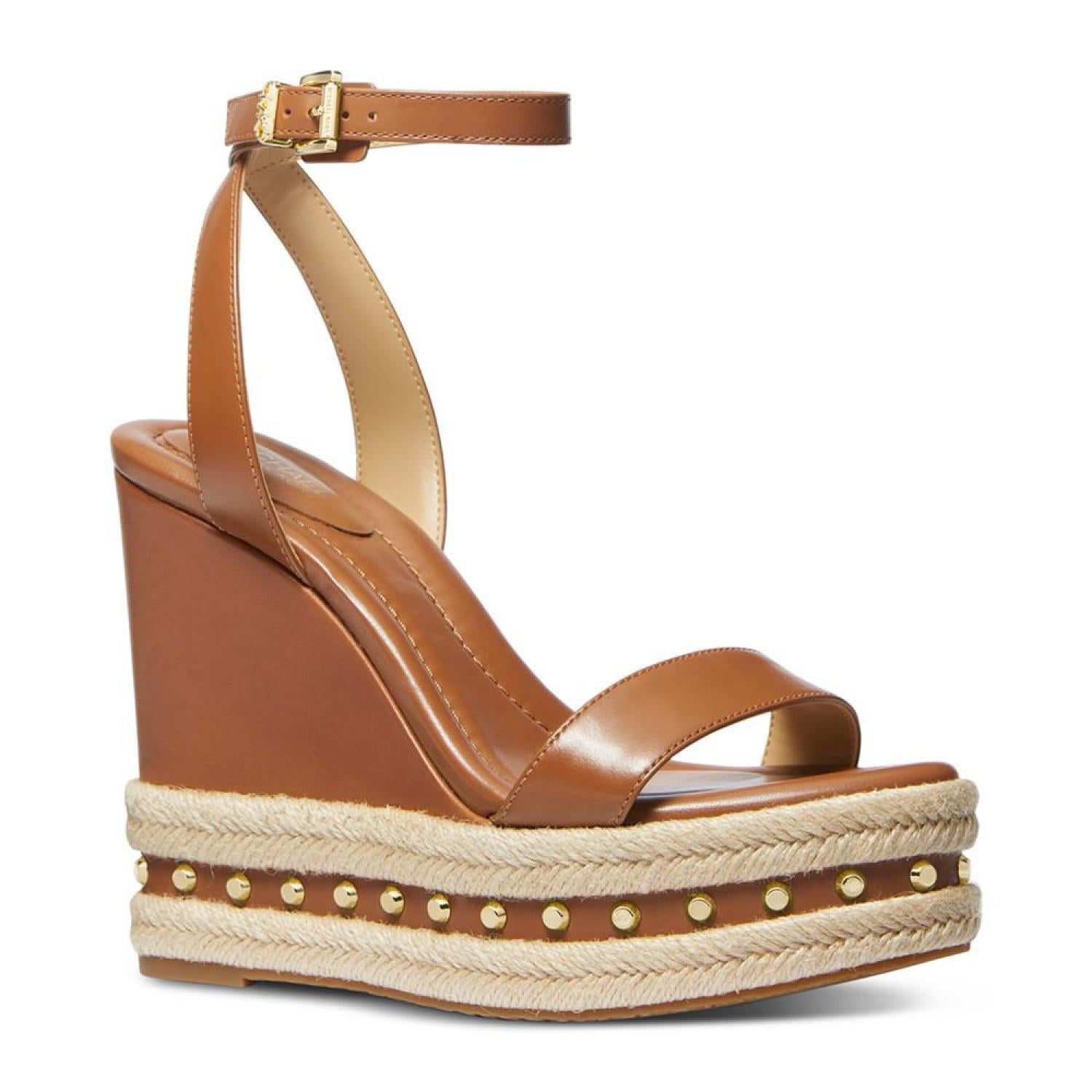 Perched on espadrille platforms, the Leighton sandals from MICHAEL Michael Kors take any look to the next level in a strappy silhouette with a breezy finish. 5" wedge heel; 1-1/5" espadrille platform Open toe Buckled ankle strap Leather upper; manmade lining; rubber sole Imported