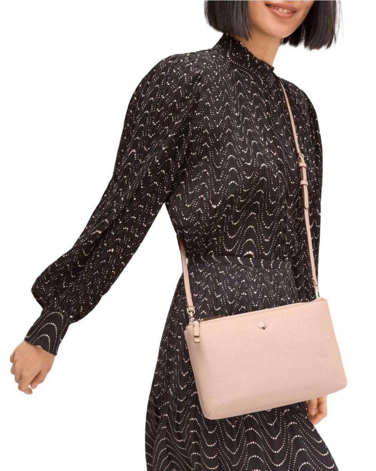 The crossbody bag is a trend that is here to stay and we especially love this style.Pebbled leather. Spade floral jacquard lining. Enamel spade. Crossbody bag with double zipper closure. Optional (and adjustable) shoulder strap. Size - 6"h x 10"w x 1"d