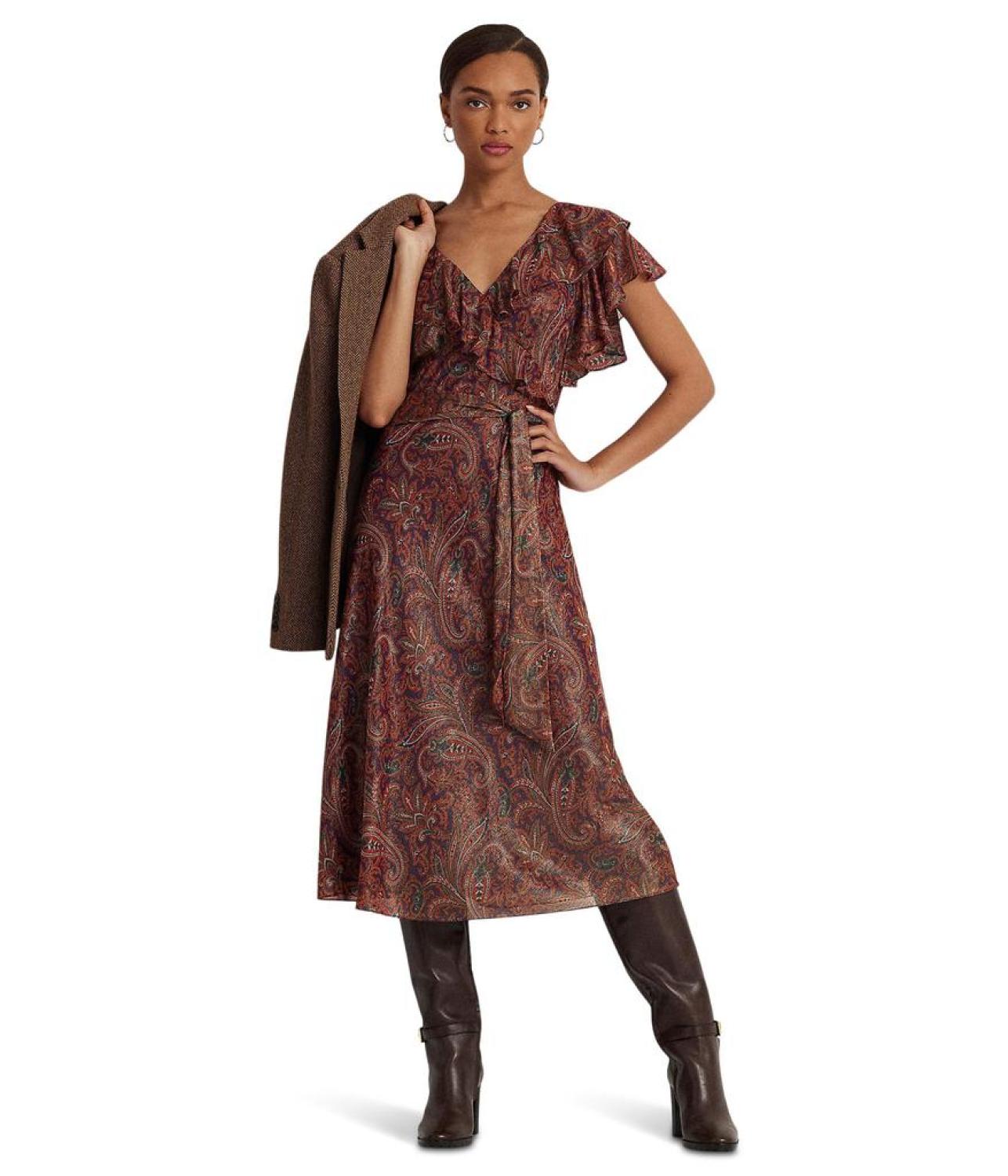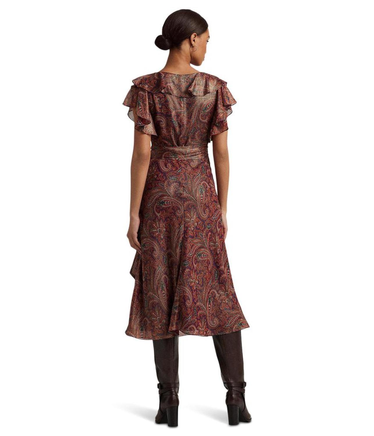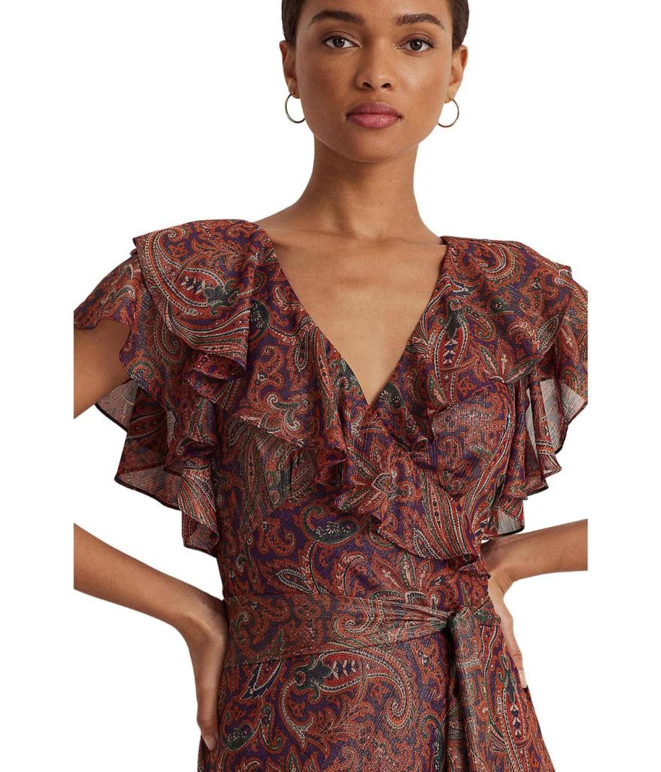 Look pretty everyday by dancing around in the lovely and lightweight LAUREN Ralph Lauren® Print Ruffle-Trim Metallic Chiffon Dress with an iconic empire waist and short flutter sleeves.