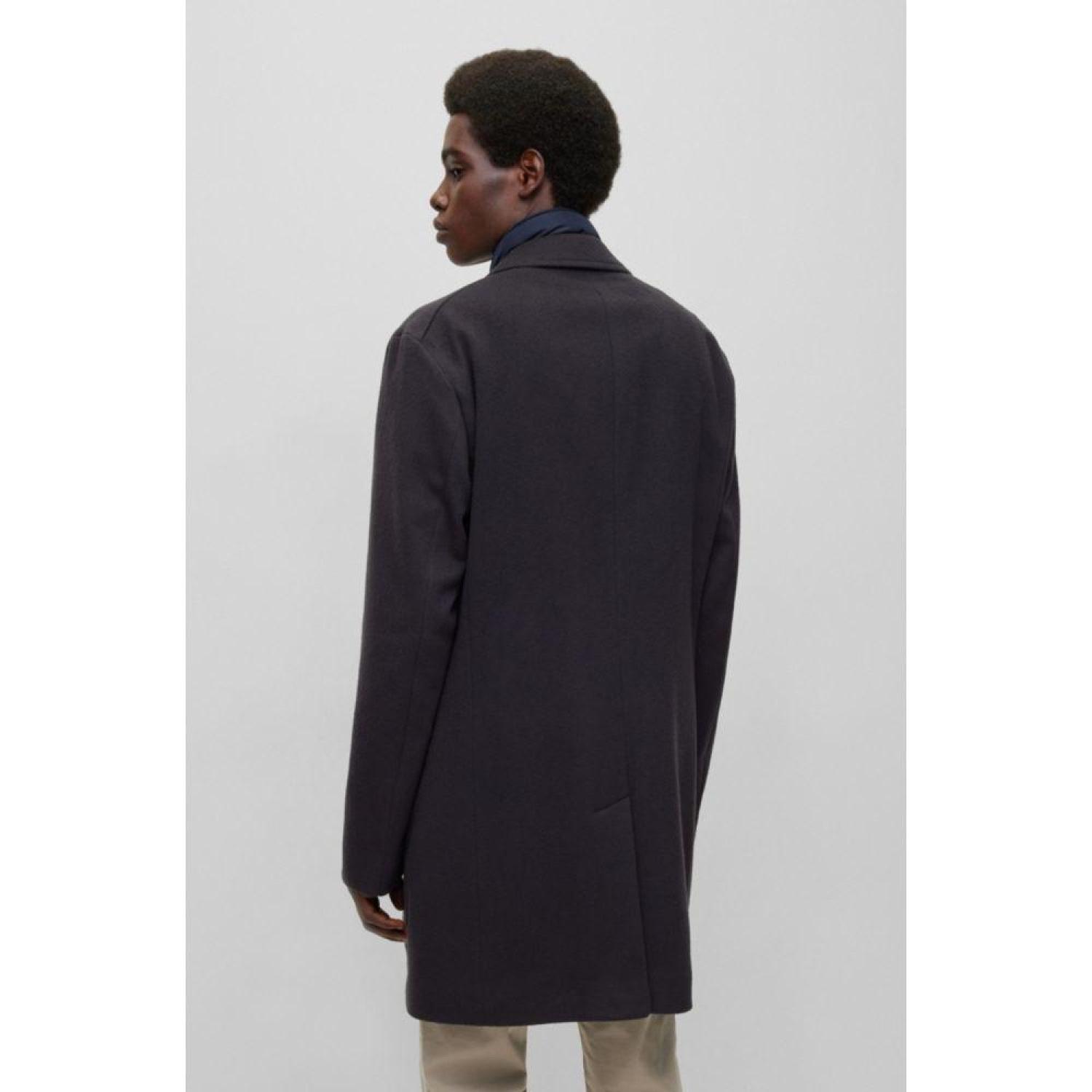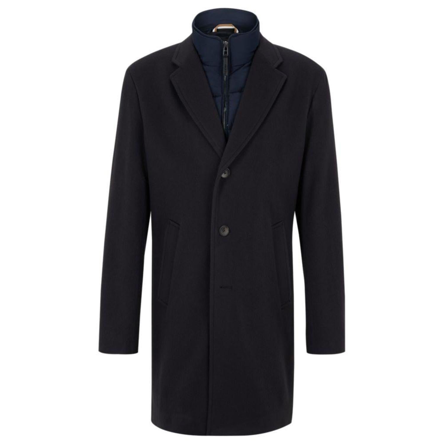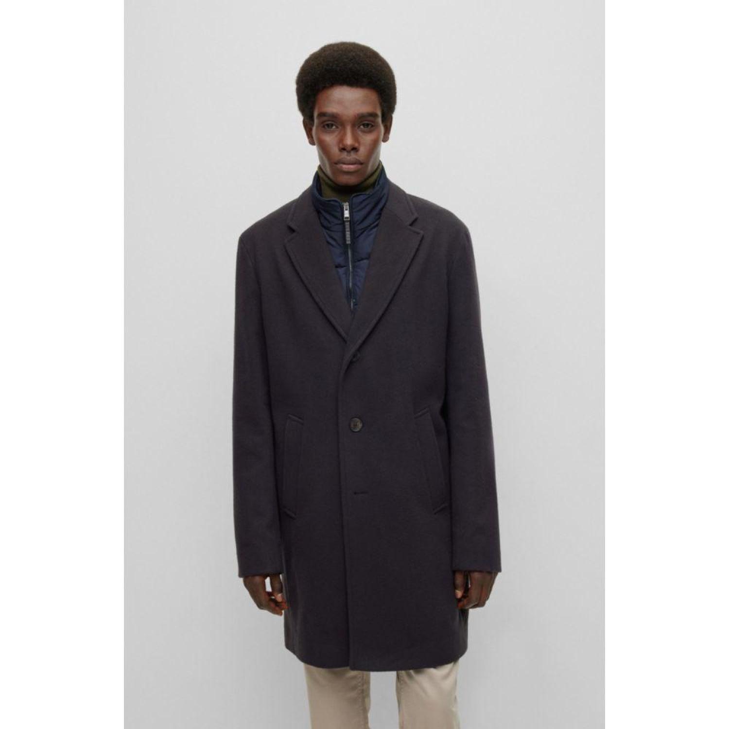An adaptable coat by BOSS Menswear. Offered in a slim fit for a sleek silhouette, this button-up coat is delivered with a zip-up inner featuring lightweight padding. The wool-blend fabric has a solid weave for versatile styling.