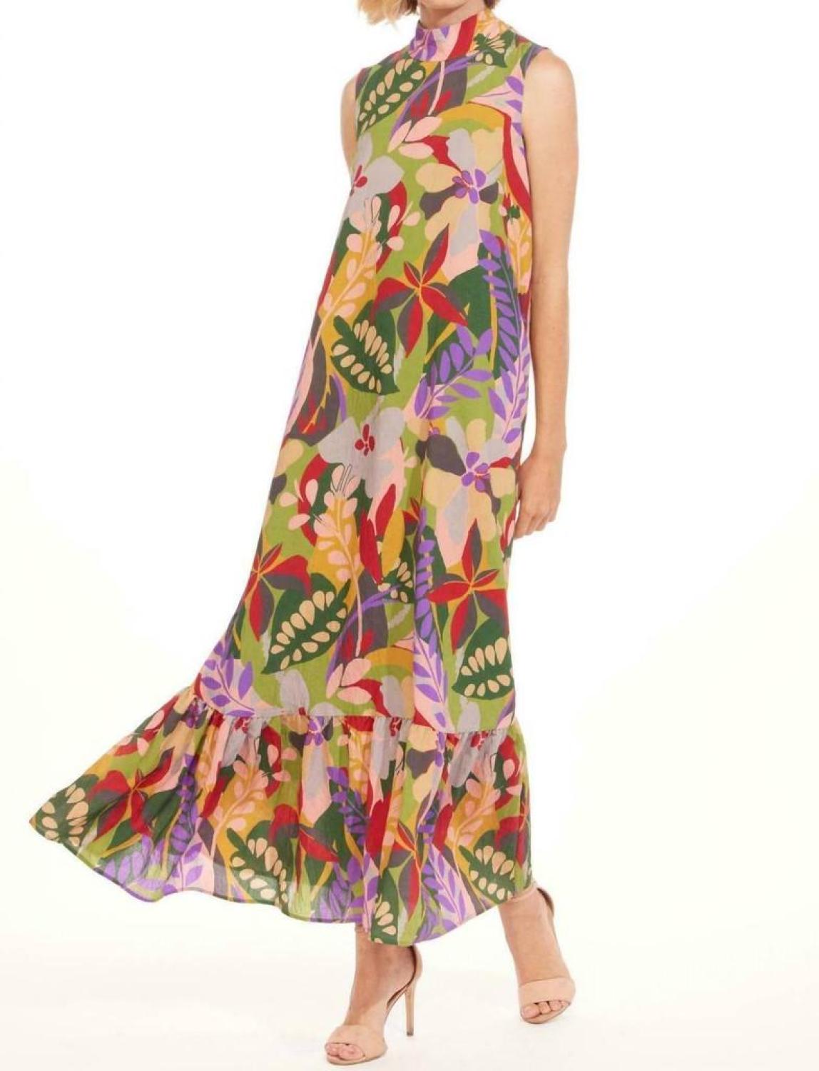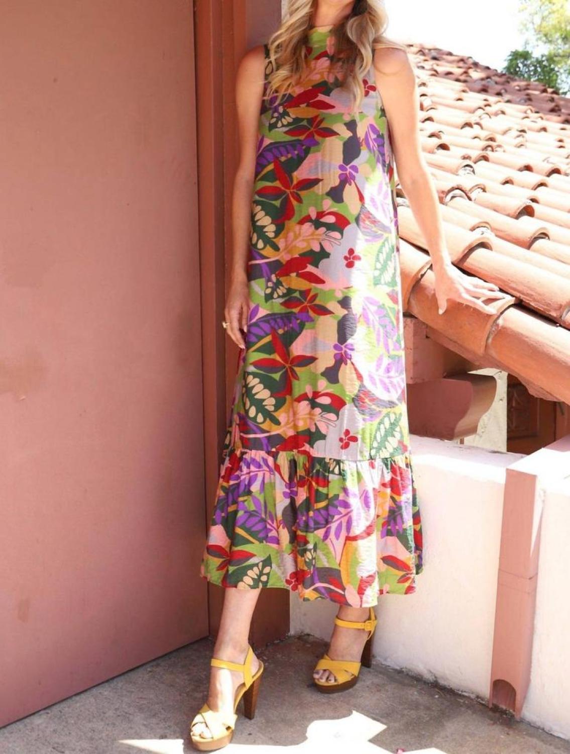 A maxi dress that is just as cute as it is comfortable.If vacation was embodied into a fabric, it would be jungle safari! The Terry Dress has a wide banded neckline that ties into long scarf in the back. The A-line, maxi style has a ruffled hem. It's easy-breezy and elegant in the same breath. 70% Viscose 30% Nylon. Lining - 100% Polyester