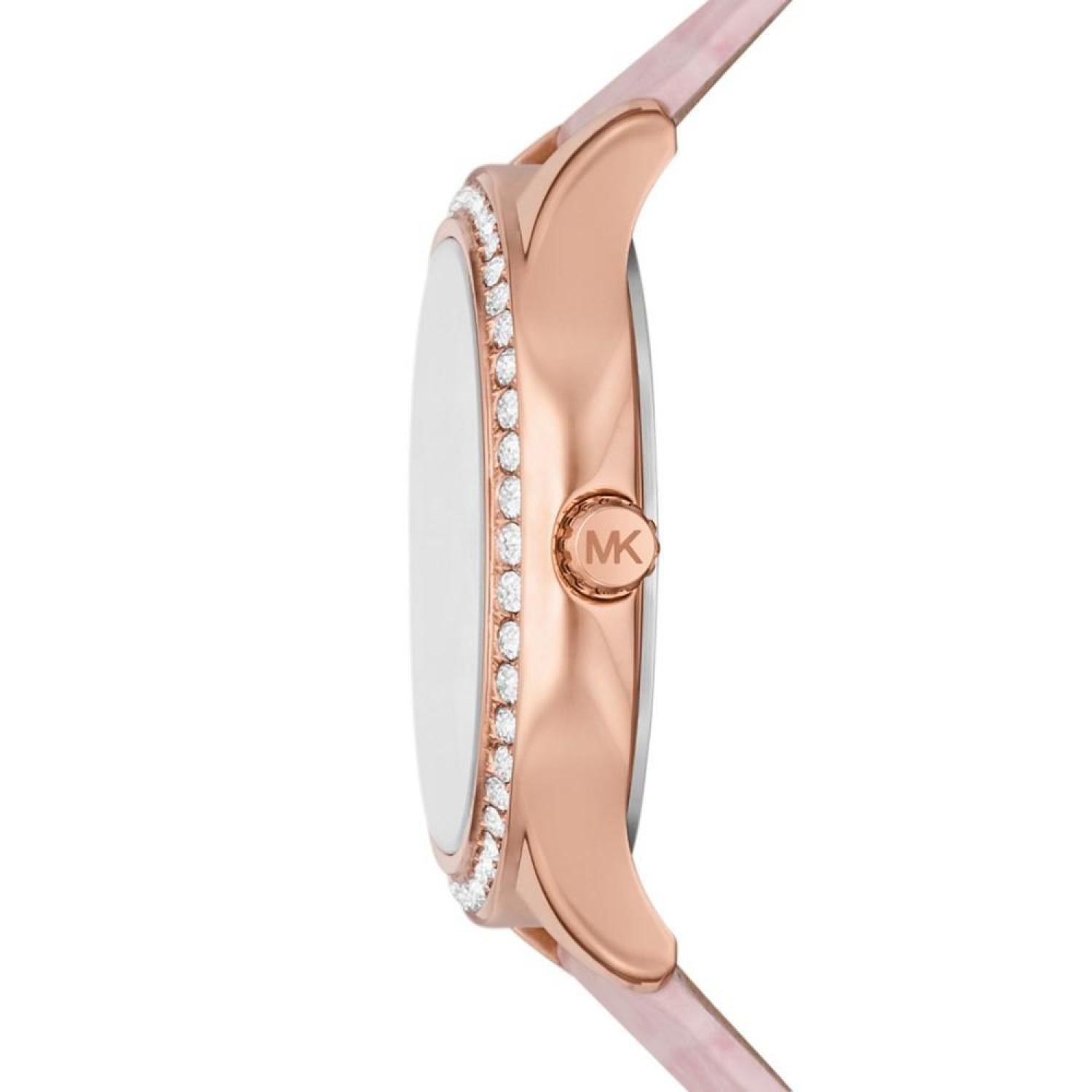 Movement- quartz, three hand, dial- mother of pearl, with rose gold-tone markers