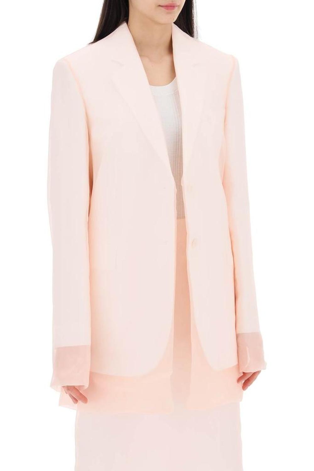 The Sportmax Acacia Blazer is characterized by an oversized fit with padded shoulders and a double-layered structure. The single-breasted construction features non-functional pockets and buttons covered in pure silk organza, with oversized lengths at the bottom and cuffs that completely cover the garment. The inner lining has a small pocket. The model is 177 cm tall and wears size IT 38.