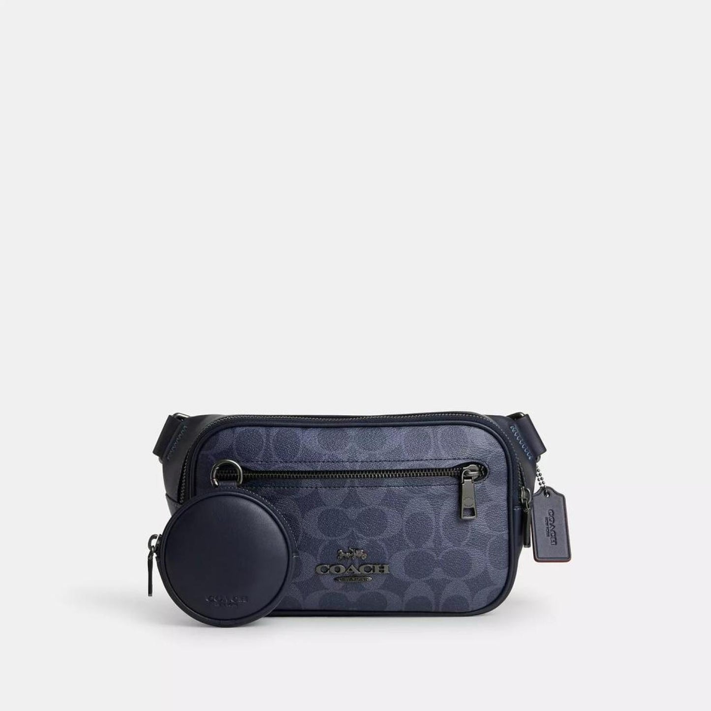 • Signature denim and smooth calf leather Belt bag - Inside multifunction pocket Zip closure fabric lining Outside zip pocket Adjustable strap with 48 length for wear at waist 11 1/4 (L) x 5 1/2 (H) x 2 1/4 (W) Removable round coin case - Zip closure fabric lining Attached hinged D-ring 3 1/2 (L) x 3 1/2 (W) x 1 (W) Style No. CU551 | Coach Outlet Elias Belt Bag In Signature Denim - Blue