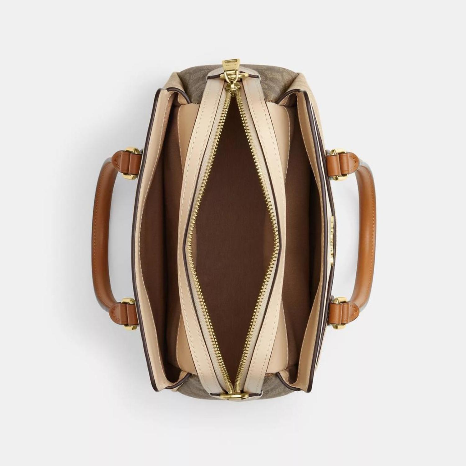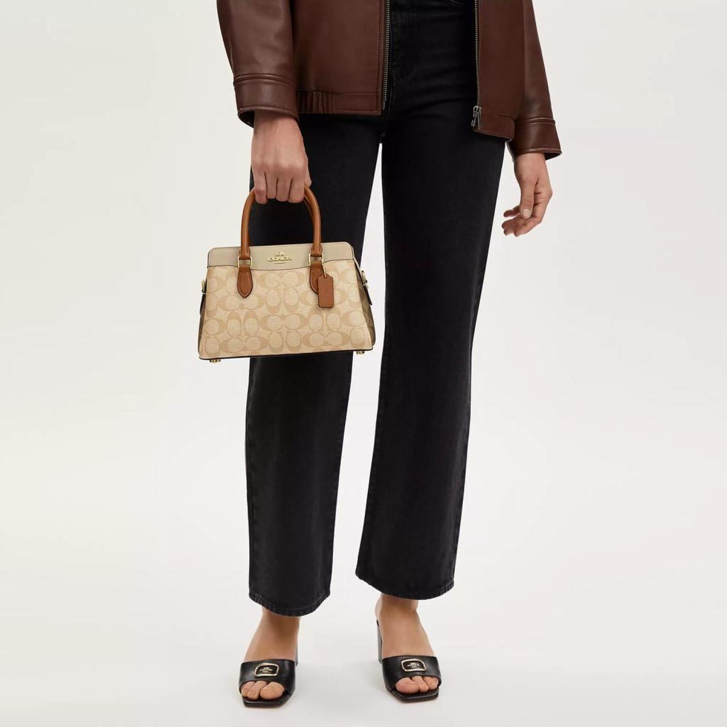 Signature coated canvas and smooth leather Inside multifunction pocket Zip closure fabric lining Side slip compartments Handles with 4 drop Outside open pockets Detachable strap with 21 1/2 drop for shoulder or crossbody wear Four protective feet at base 10 1/4 (L) x 6 3/4 (H) x 4 1/4 (W) Style No. CS553 | Coach Outlet Mini Darcie Carryall In Blocked Signature Canvas - Brown