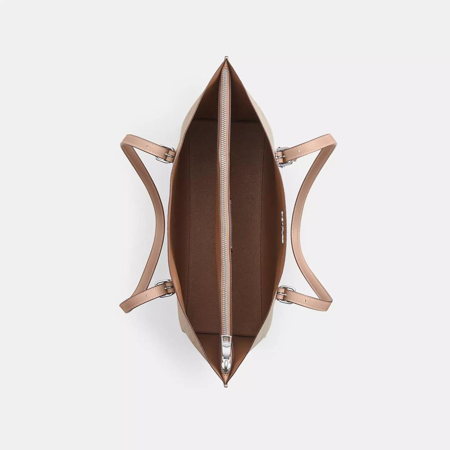 Signature coated canvas Trim partially made with recycled leather fiber layer Inside multifunction pocket Zip-top closure fabric lining Side open compartments Handles with 10 1/4 drop 13 1/4 (L) x 11 (H) x 5 (W) Style No. CV967 | Coach Outlet Mollie Tote Bag In Signature Canvas - Beige