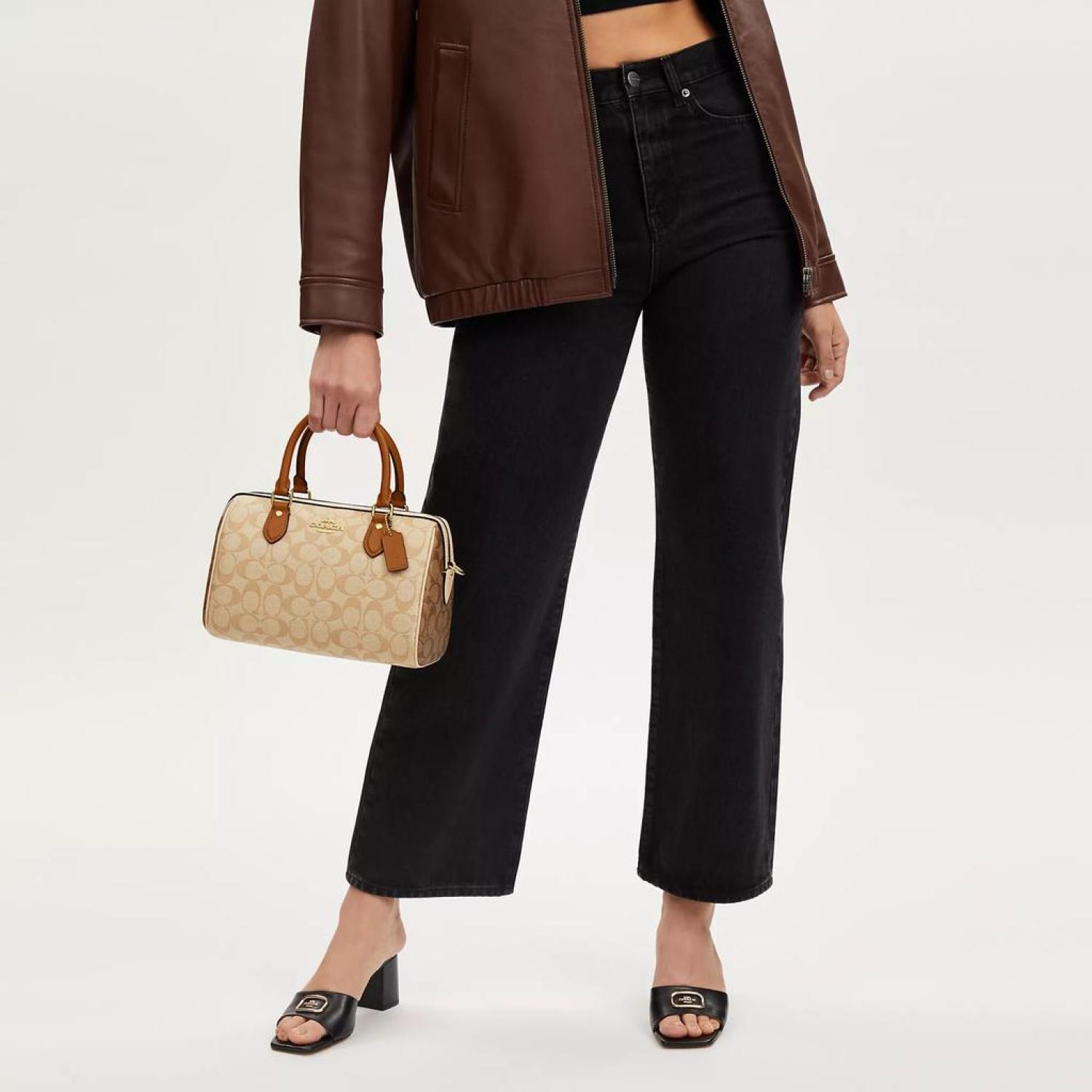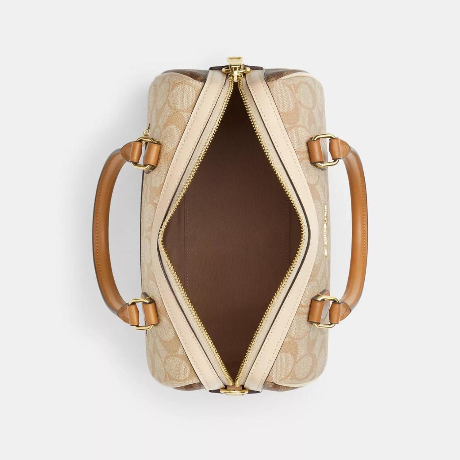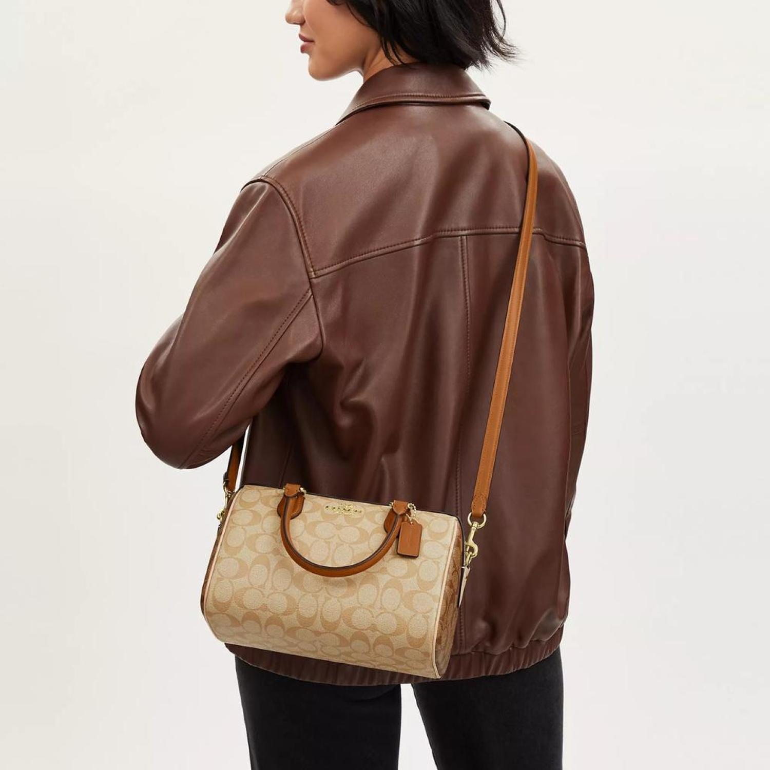Signature coated canvas and recycled leather Inside zip and multifunction pockets Zip closure fabric lining Handles with 4 1/4 drop Outside zip pocket Detachable strap with 23 drop for shoulder or crossbody wear Four protective feet at base 10 (L) x 6 1/2 (H) x 5 1/2 (W) Style No. CS185 | Coach Outlet Rowan Satchel In Blocked Signature Canvas - Brown