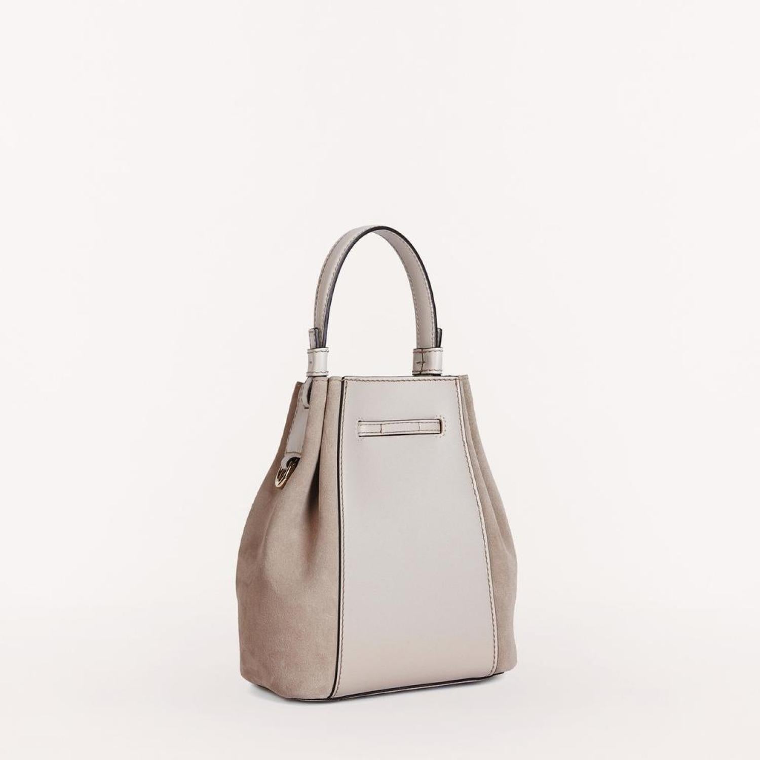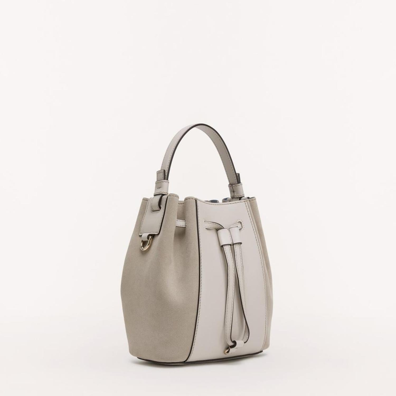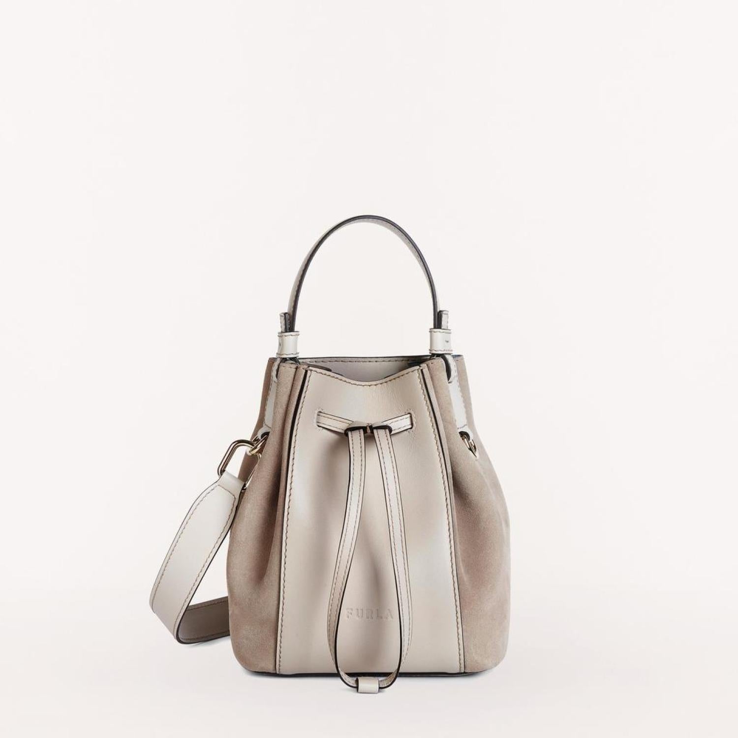 Furla Miastella is a small bucket bag made from a combination of soft Roma calfskin and suede. The accessory has a top handle and can be worn as a handbag or as a crossbody bag thanks to its comfortable, adjustable and removable leather strap. A versatile and modern accessory ideal for enhancing your look. - Drawstring closure - Inner pocket- Inner tag with Furla Arch logo- Furla logo engraved on the front- Galvanised gold finishes Dimensions 7.48 x 8.86 x 4.33 (w x h x d)