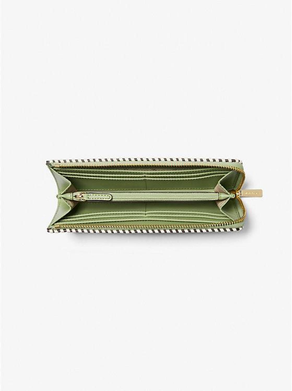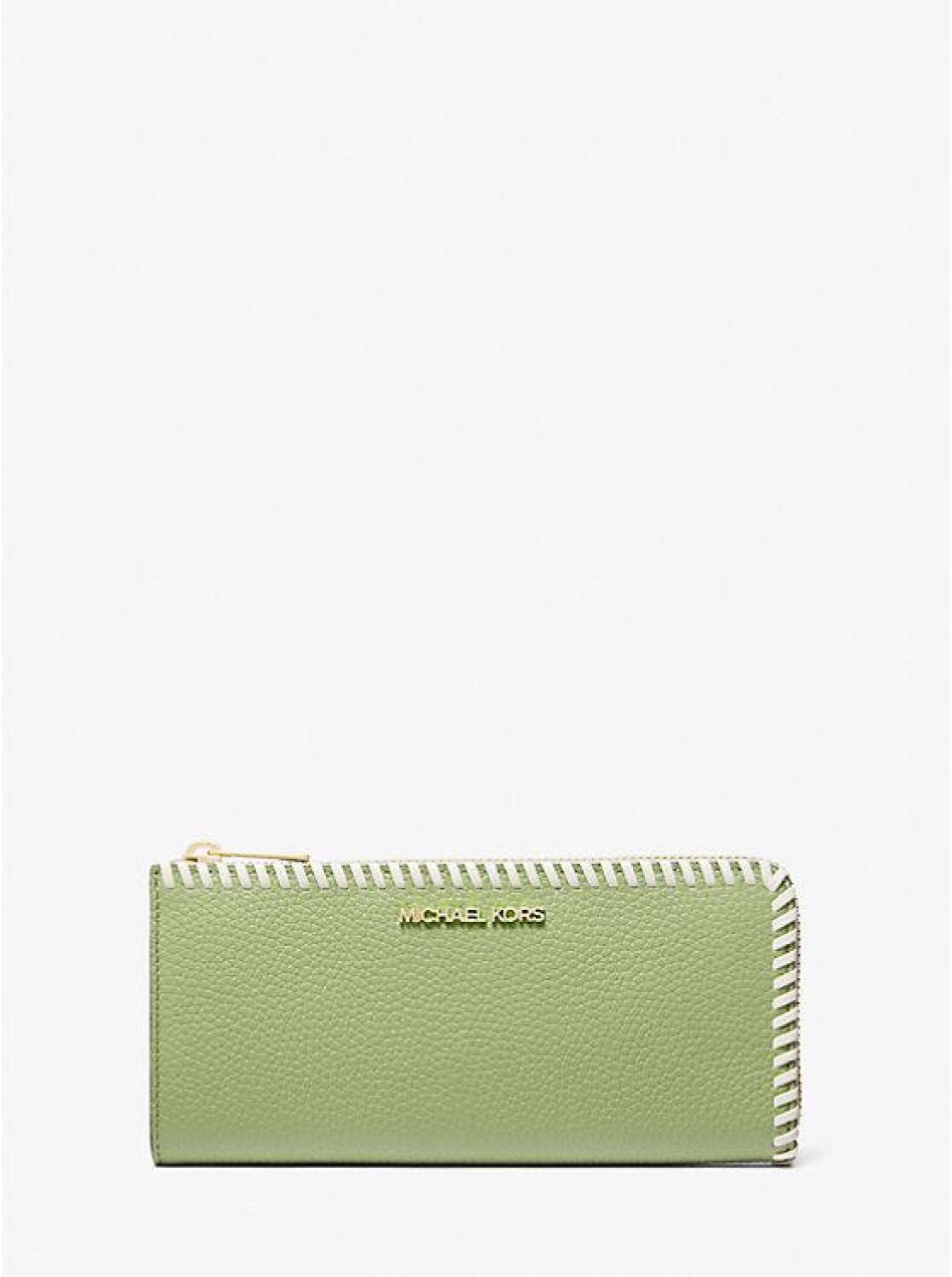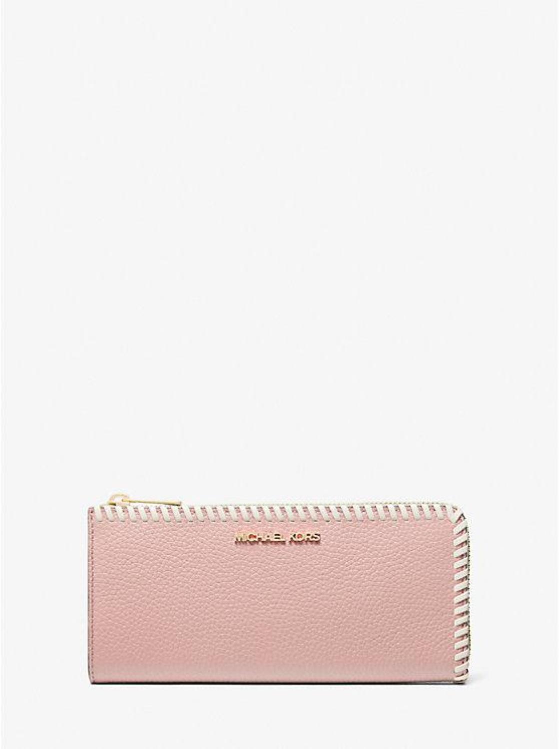 A compact accessory with outsize style, this eye-catching wallet is perfect for days that require on-the-go ease. Crafted from rich pebbled leather with whipstitched trim, its slim silhouette partially unzips to reveal multiple card slots and a sleek center compartment. Slip it into the coordinating tote. • Wallet • Pebbled leather • 100% leather • Gold-tone hardware • 8"W X 4"H X 0.5"D • Interior details: center zip pocket, 8 card slots • Lining: 100% polyester • Zip fastening • Imported • Wallet • Pebbled leather • 100% leather • Gold-tone hardware • 8"W X 4"H X 0.5"D • Interior details: center zip pocket, 8 card slots • Lining: 100% polyester • Zip fastening • Imported