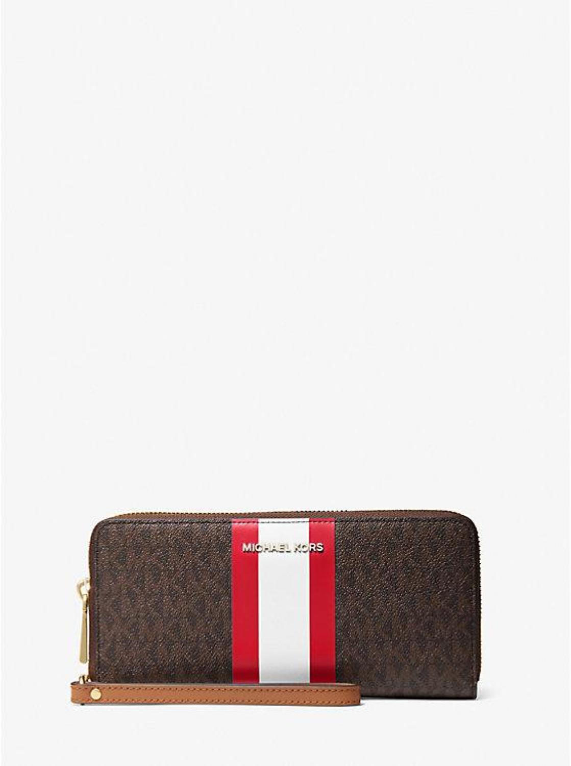 Constructed from Signature-print canvas with eye-catching center stripes, this sleek wallet is the perfect all-in-one accessory. It features a dedicated pocket for your phone and a wealth of card slots for easy organization. A must-have when traveling or commuting, it can easily be tucked into your carryall or worn as a wristlet. • Wallet • Logo-print canvas • 69% coated canvas/17% polyester/13% cotton/1% polyurethane • Trim: 100% leather • Gold-tone hardware • 8.25”W X 4” H X 1”D • Handle drop 7” • Interior details: 17 card slots, 5 slip pockets, zip pouch, phone pocket • Lining: 100% polyester • Zip fastening • Imported • Wallet • Logo-print canvas • 69% coated canvas/17% polyester/13% cotton/1% polyurethane • Trim: 100% leather • Gold-tone hardware • 8.25”W X 4” H X 1”D • Handle drop 7” • Interior details: 17 card slots, 5 slip pockets, zip pouch, phone pocket • Lining: 100% polyester • Zip fastening • Imported
