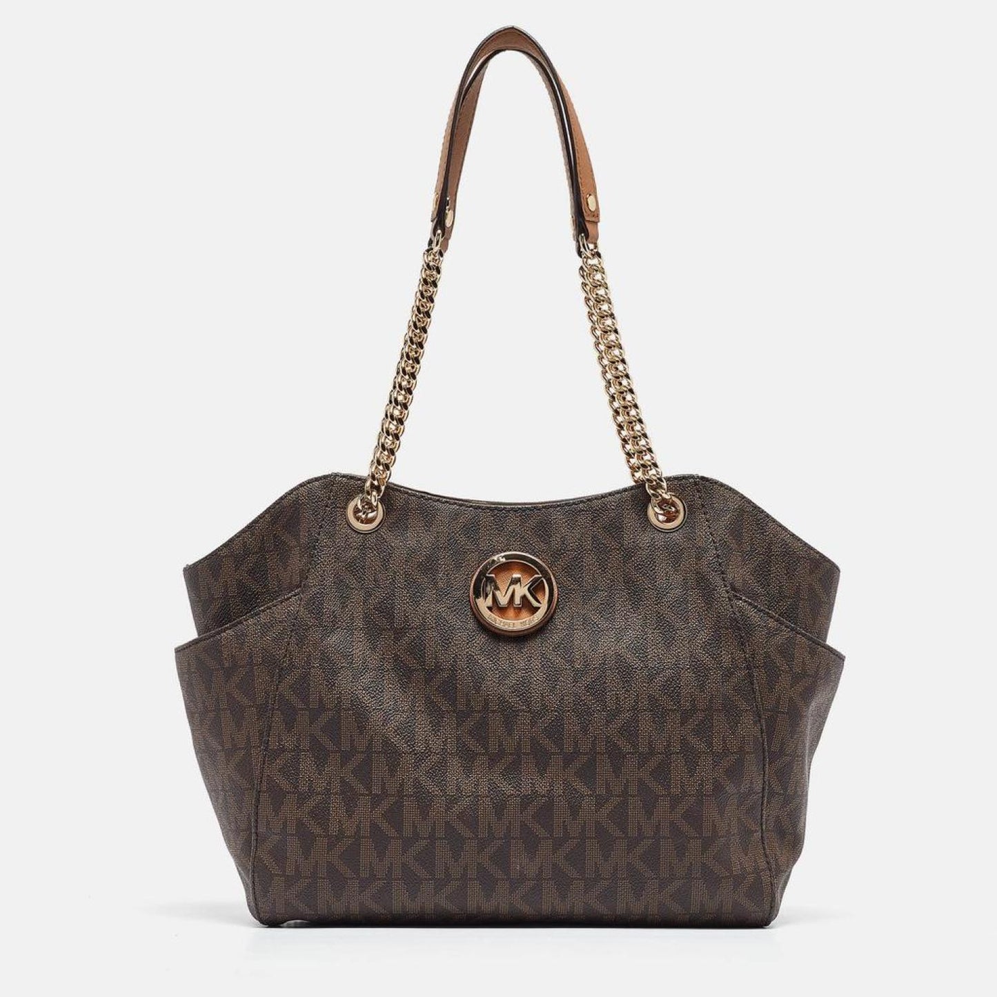 Michael Kors Brown Signature Coated Canvas And Leather Jet Set Travel Chain Bag