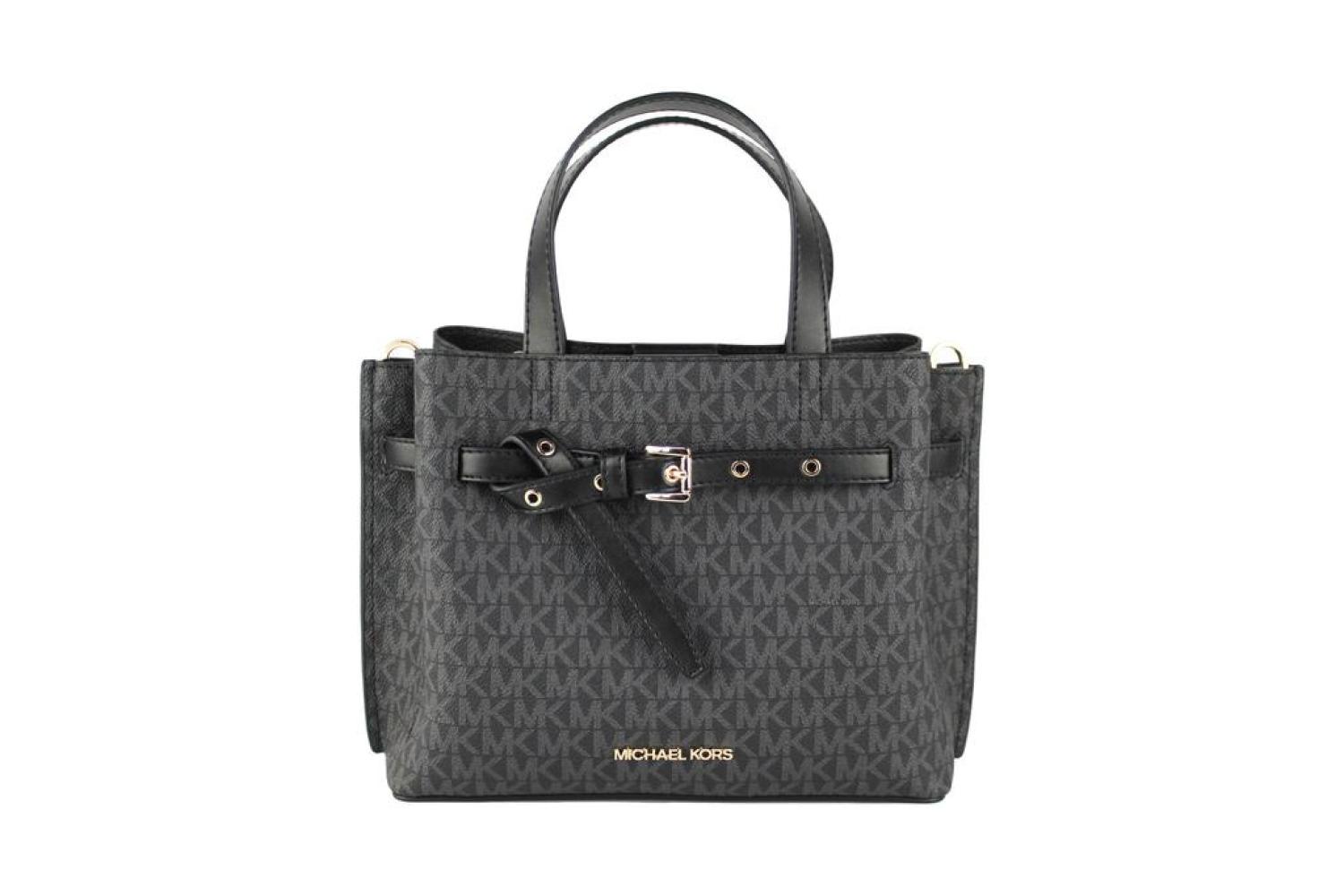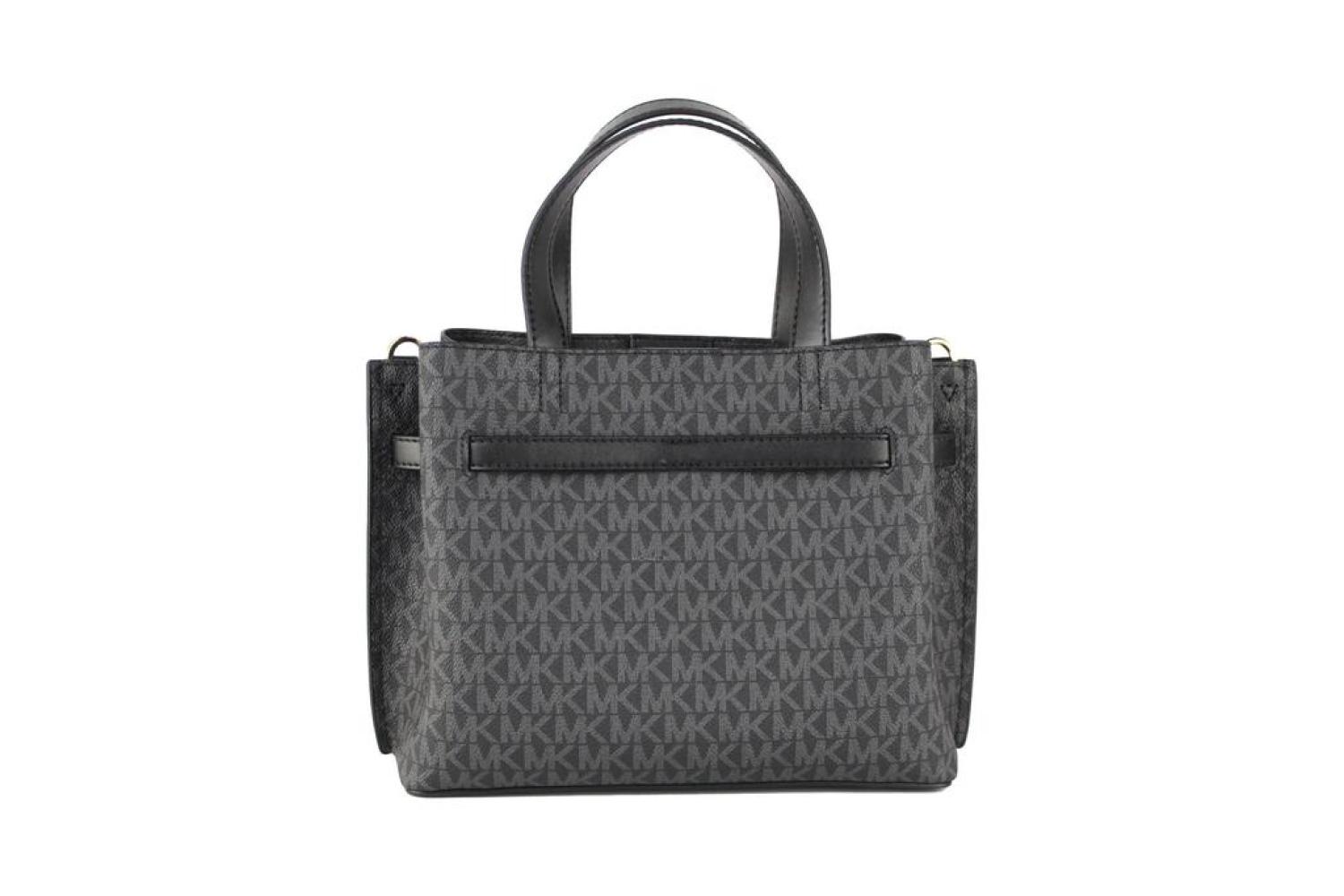 Style - Michael Kors Emilia Small Satchel Bag (Black)Material - Signature PVCFeatures - 3 Main Compartments, Inner Zip and Slip Pockets, Adjustable/Detachable Crossbody Strap, Zip and Magnetic Snap ClosureMeasures - 27.30 cm W x 20.32 cm H x 12.7 cm D