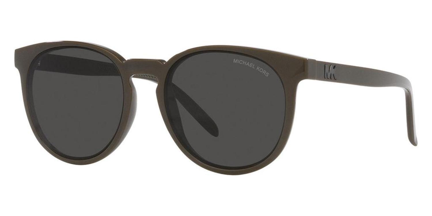 The Michael Kors men's Sunglasses measure at 54 mm lens width, 19 mm bridge width, and 145 mm arm length. The frame is round-shaped olive plastic. The lenses are non-polarized dark grey solid. Made in China (MK2187-377787)