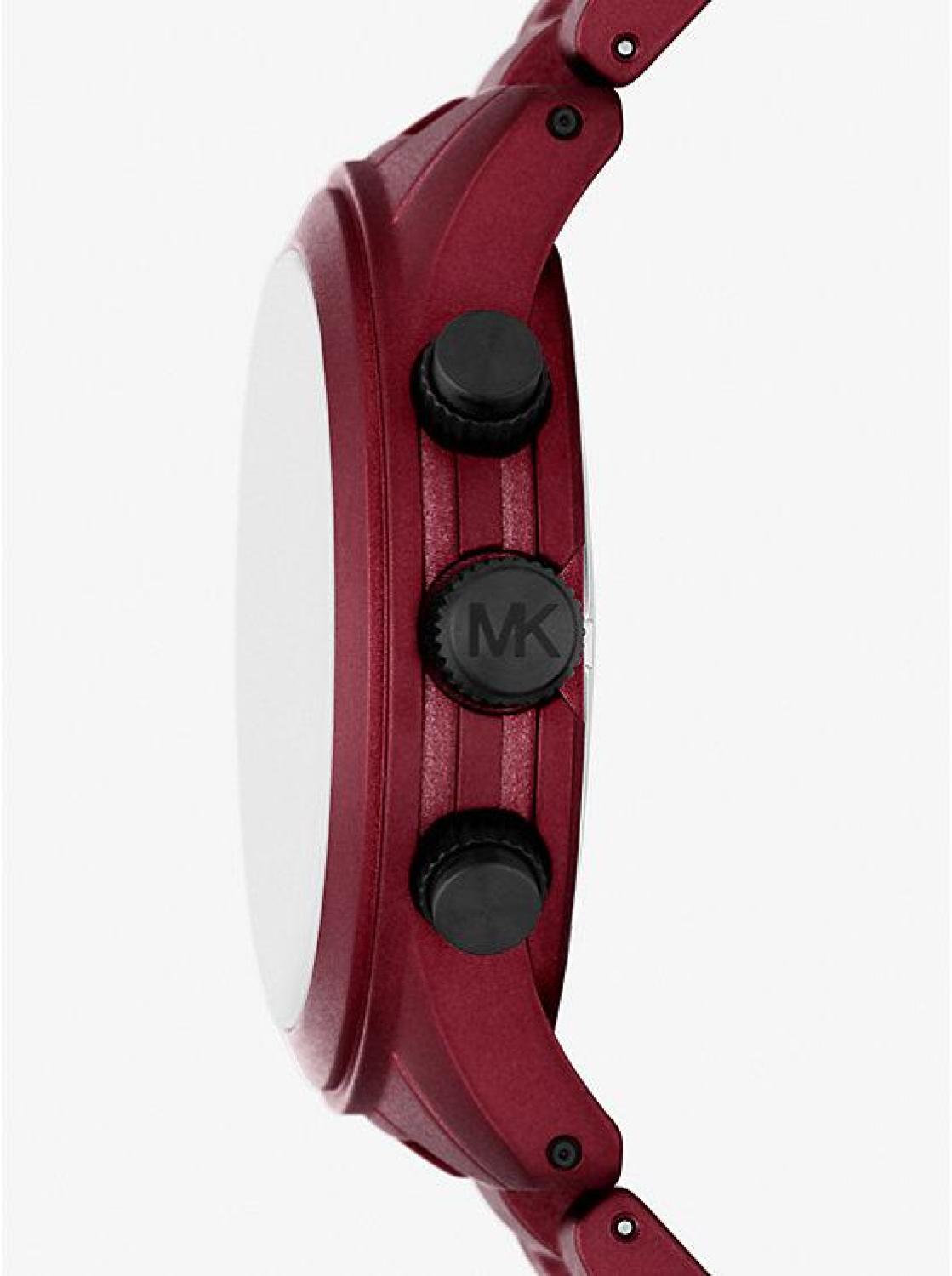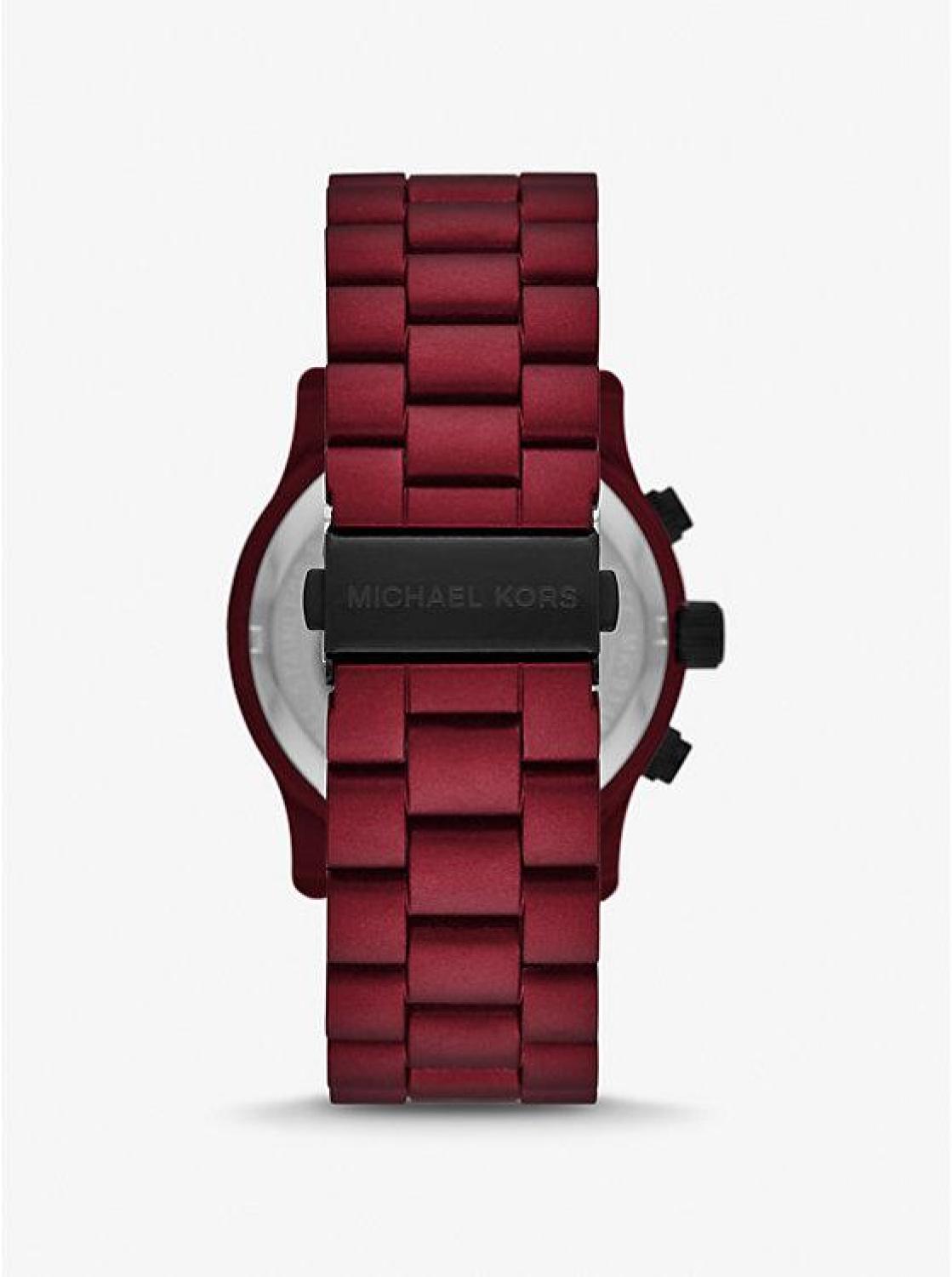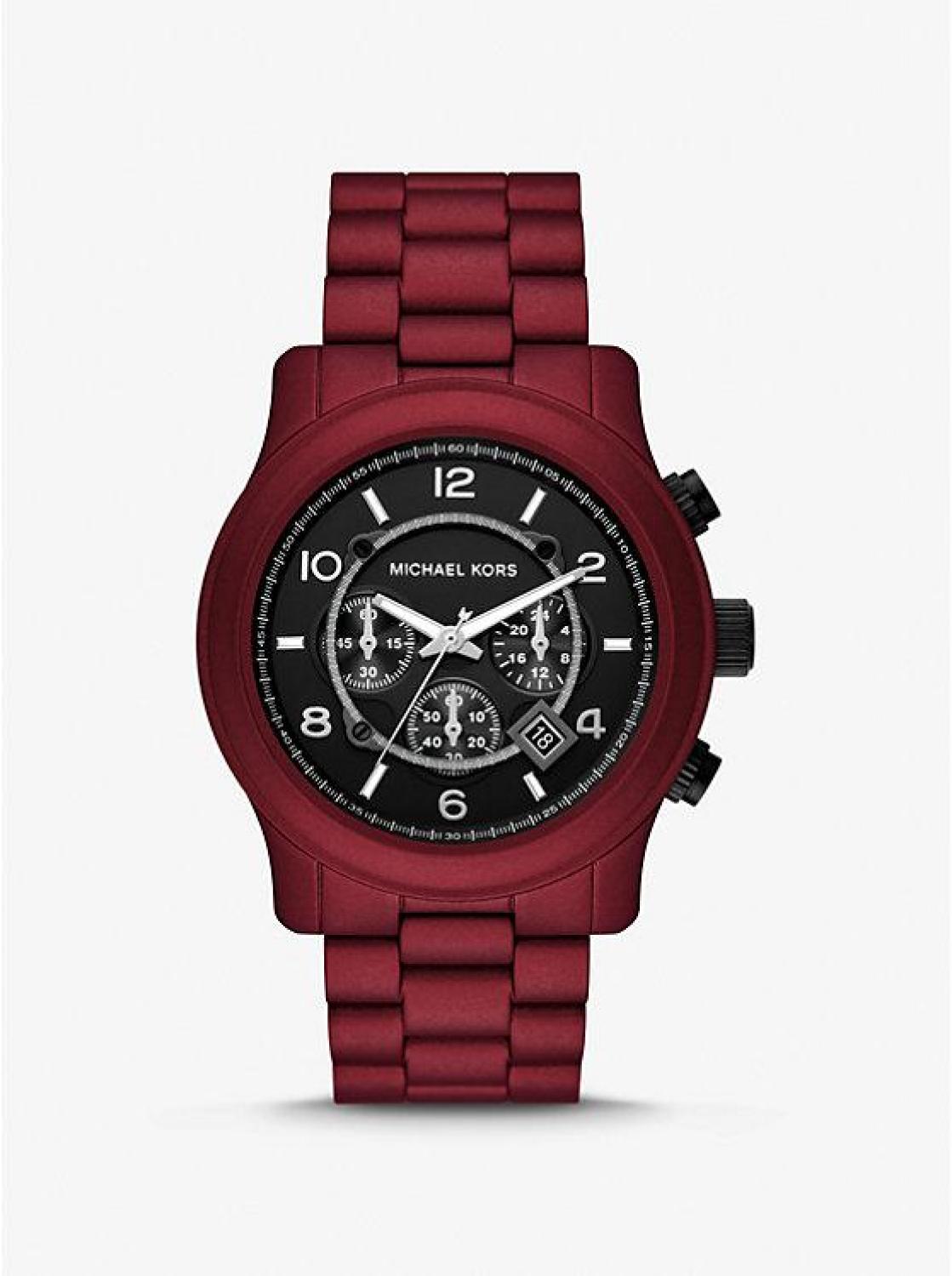 • A perennial favorite, our Runway watch is updated with a sunken black dial for a refined, versatile finish. This ultra-sleek style is crafted from red-coated stainless steel with a polished bracelet strap, and features chronograph details for precise timekeeping.