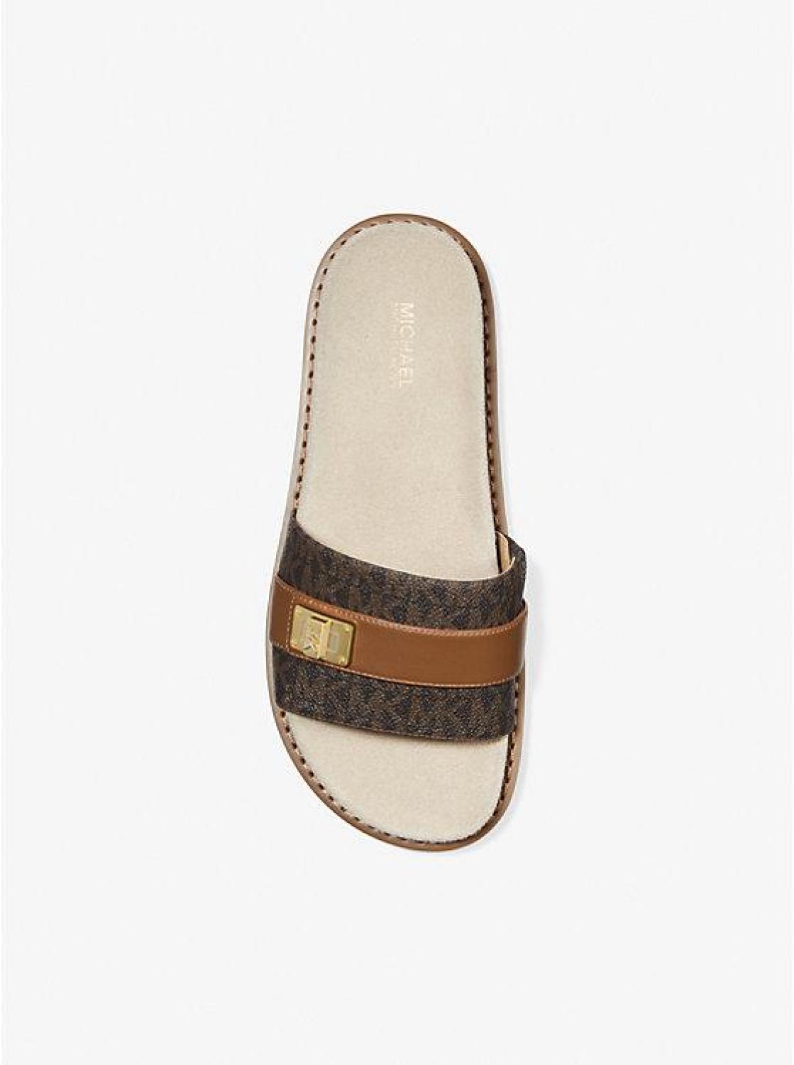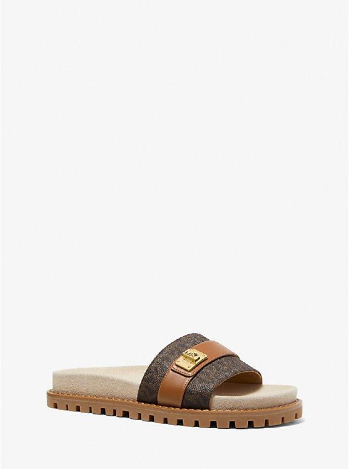 Embrace a casual-chic mood in the Padma slide sandals. The durable coated canvas features our timeless take on our “MK” initials, while a smooth band across the upper is finished with our turn-lock logo hardware. Wear them out to lunch with a tank top and Bermuda shorts.