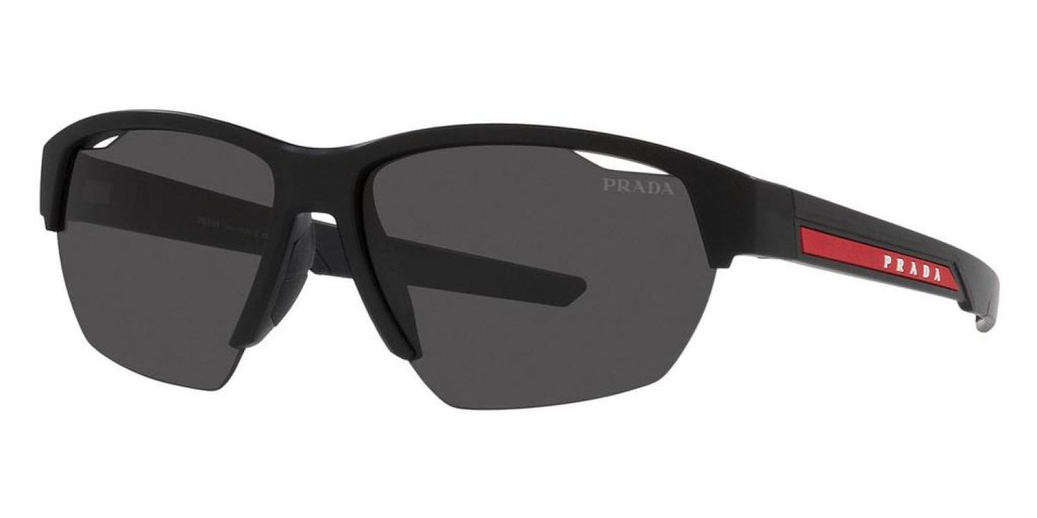Prada Men's Sunglasses. Dimensions - 64 mm x 15 mm x 140 mm. Matte Black Irregular Plastic frame, Dark Grey lenses. 100% UV Protection, Non-Polarized. Made in Italy (PS-03YS-1BO06F-64)