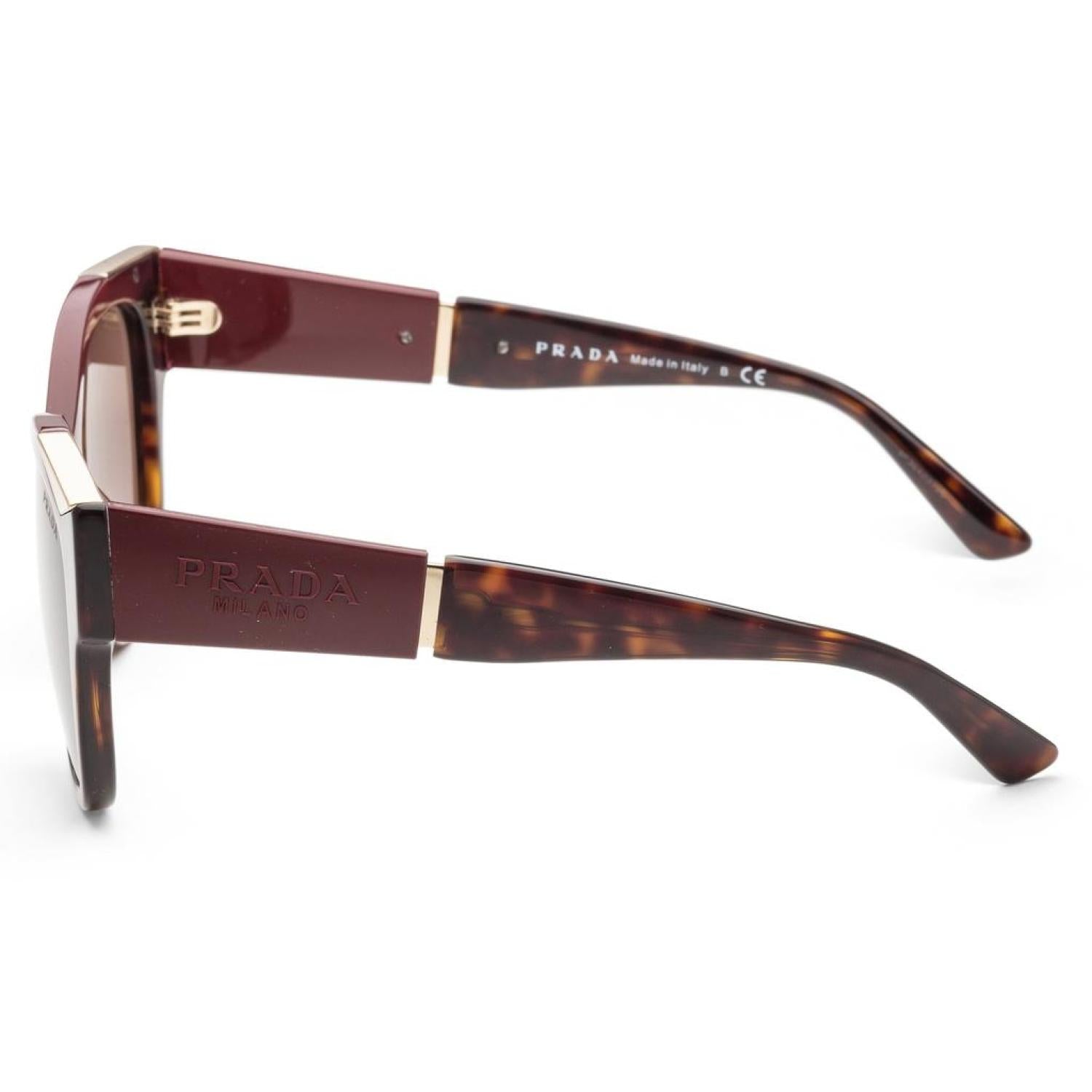 The Prada women's Sunglasses measure at 54 mm lens width, 19 mm bridge width, and 140 mm arm length. The frame is pillow-shaped cherry/dark havana acetate. The lenses are non-polarized dark brown. Made in Italy (PR02WS-07C0D1-54)