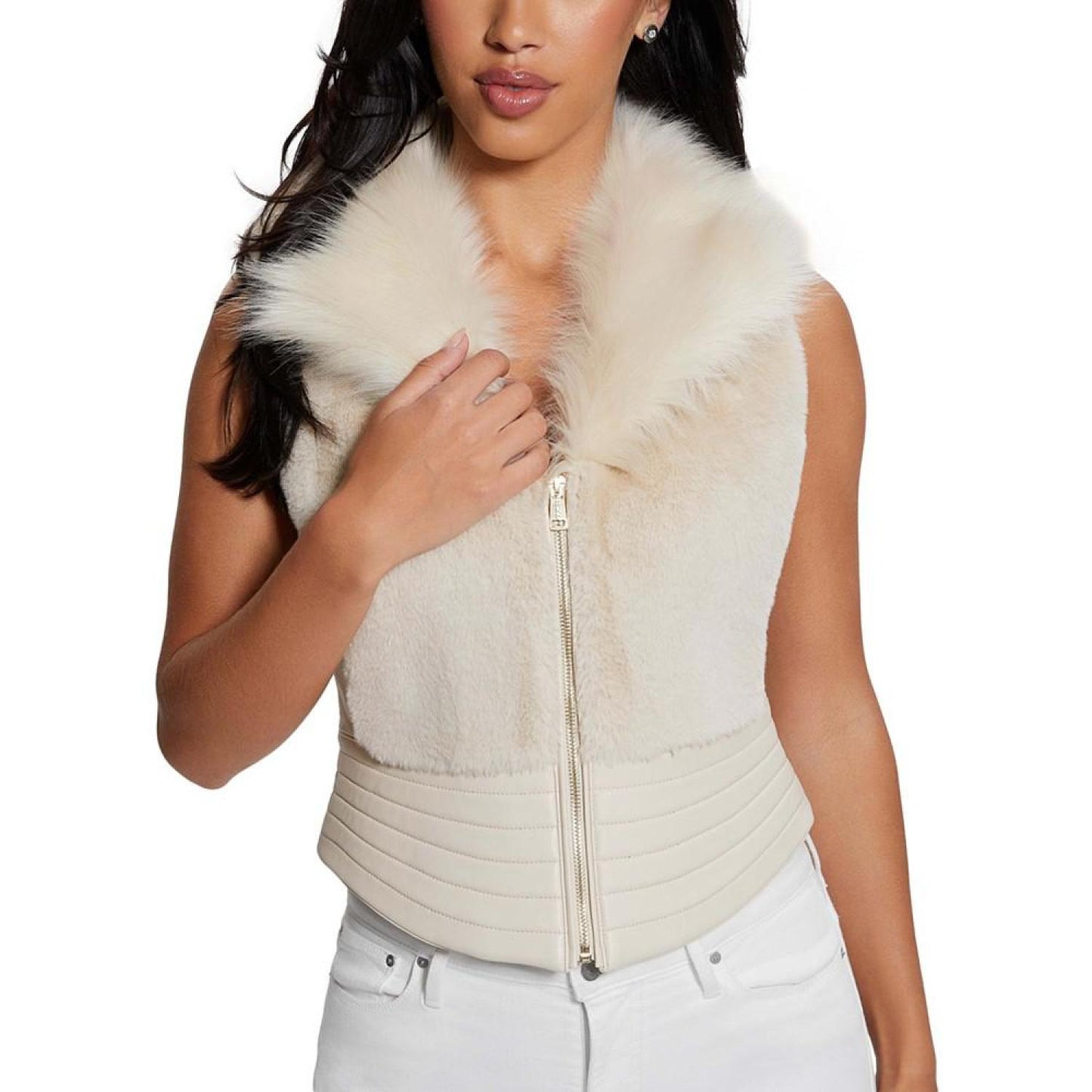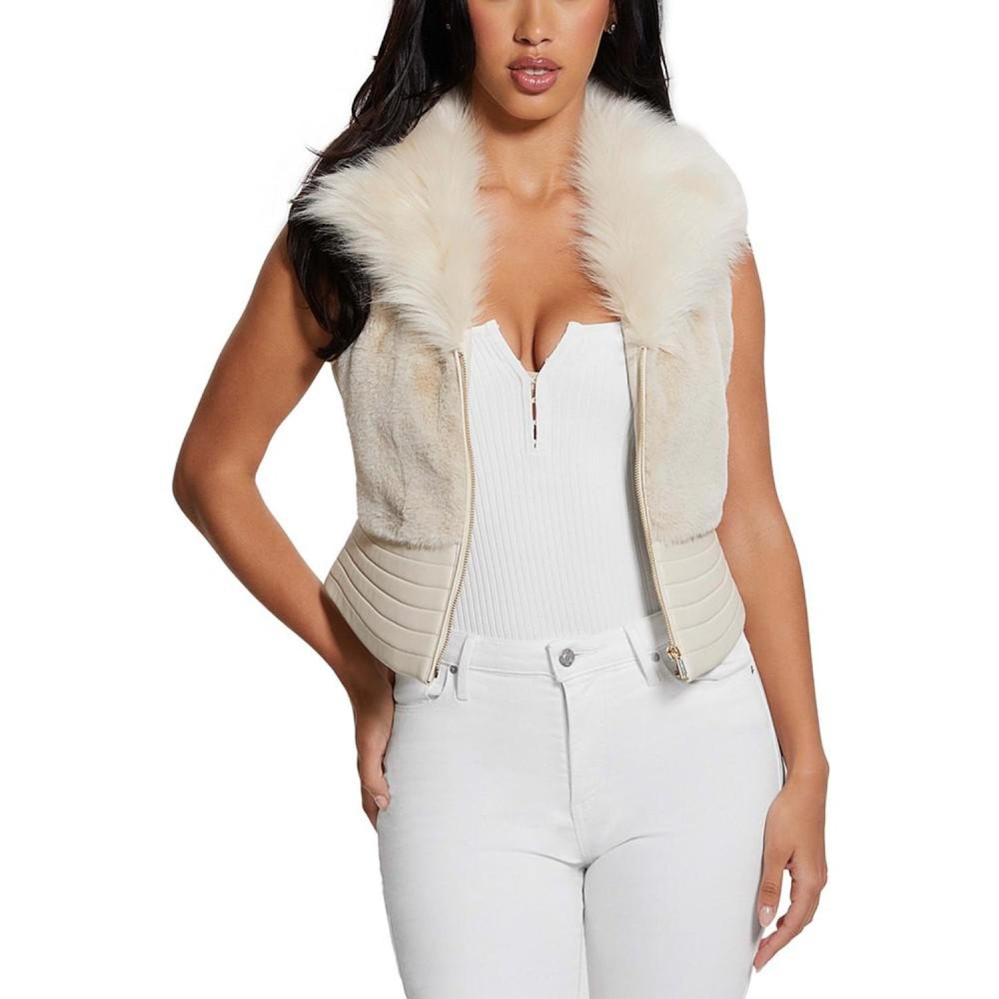 • Faux fur and faux leather combine in an outfit-making zip-front vest from GUESS.