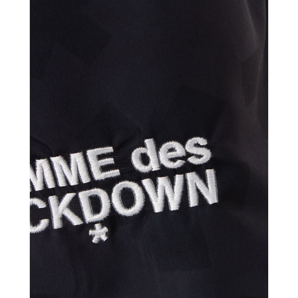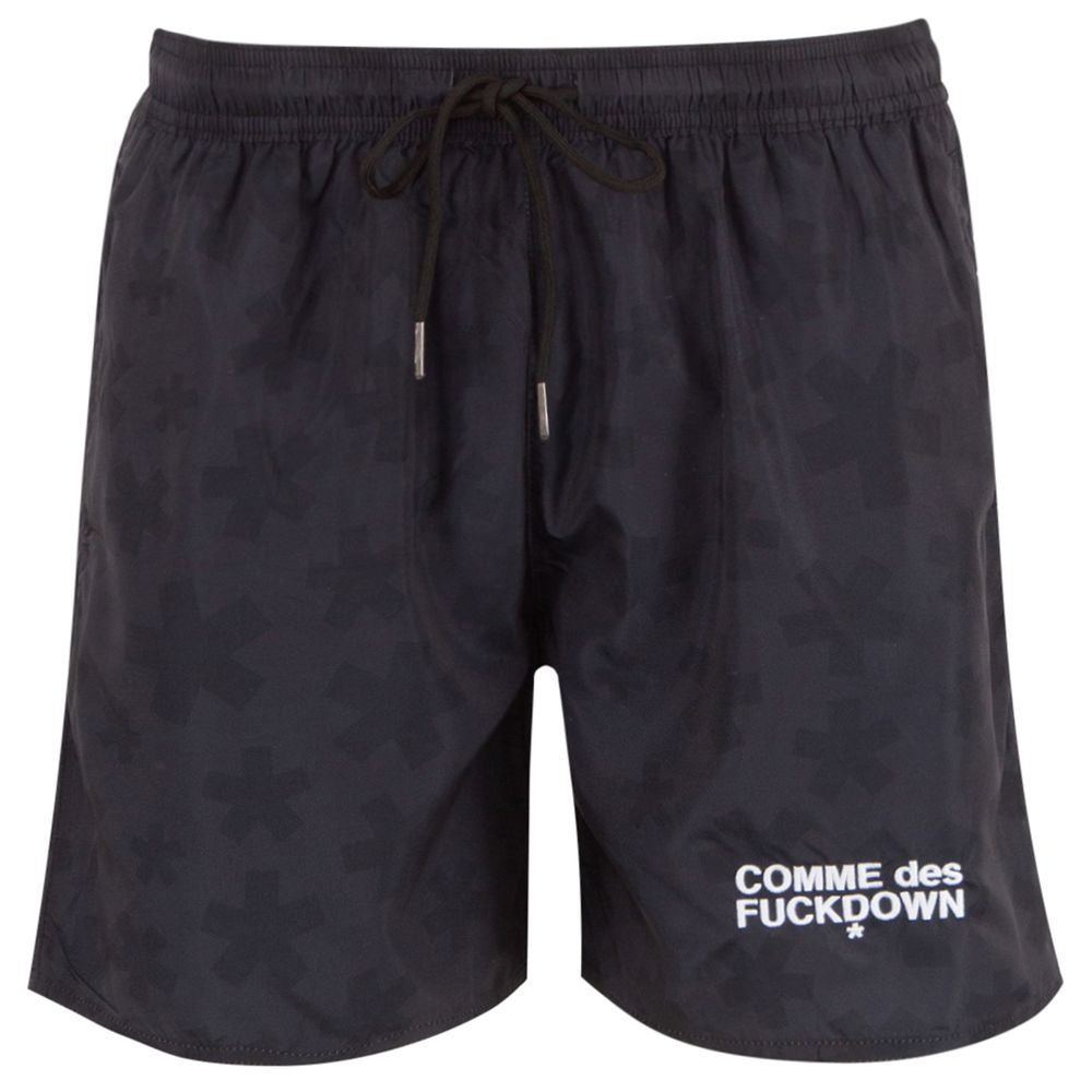 Comme des Fuckdown men’s Bermuda shorts with drawstring waist and two side pockets, all-over logo print and embroidered logo at the bottom
