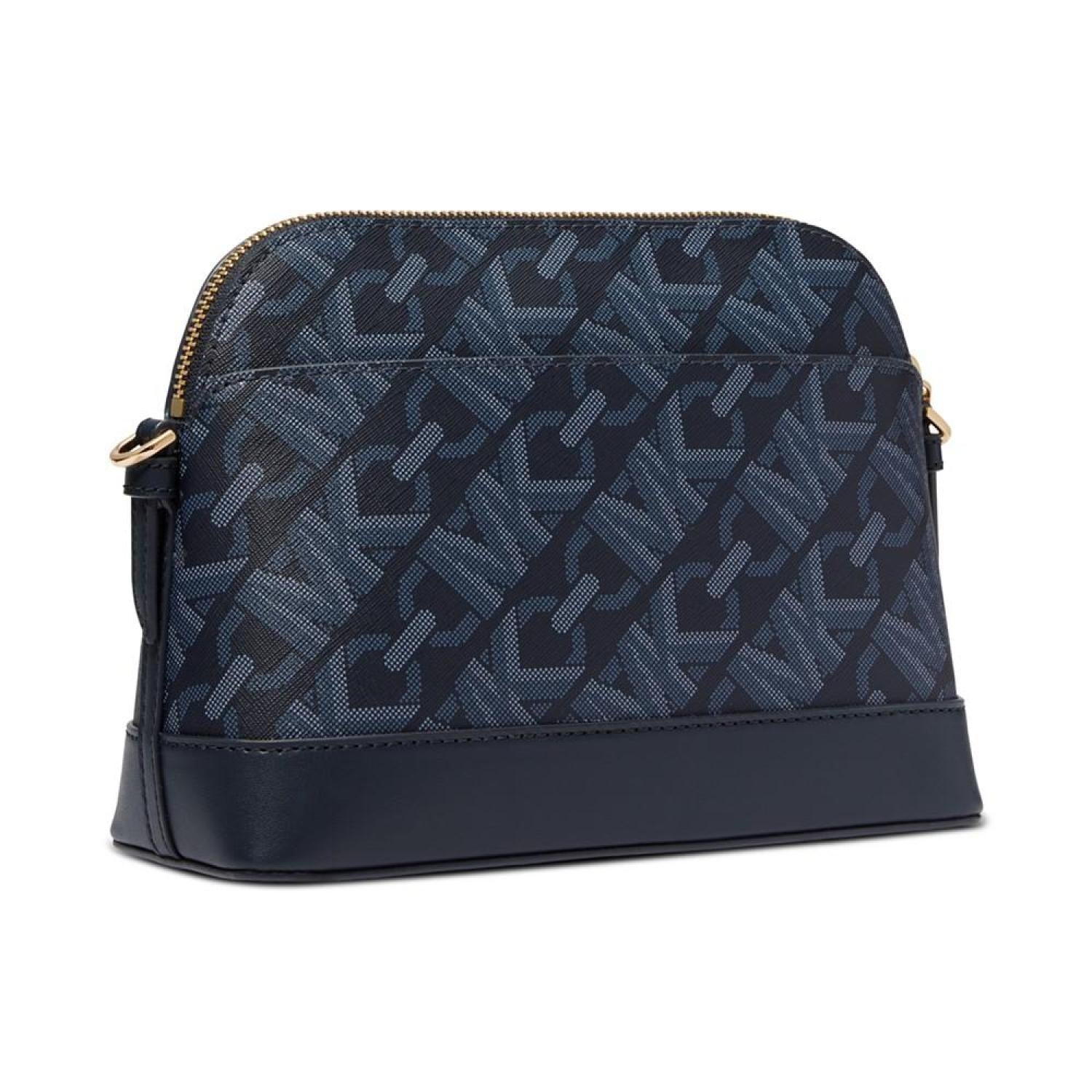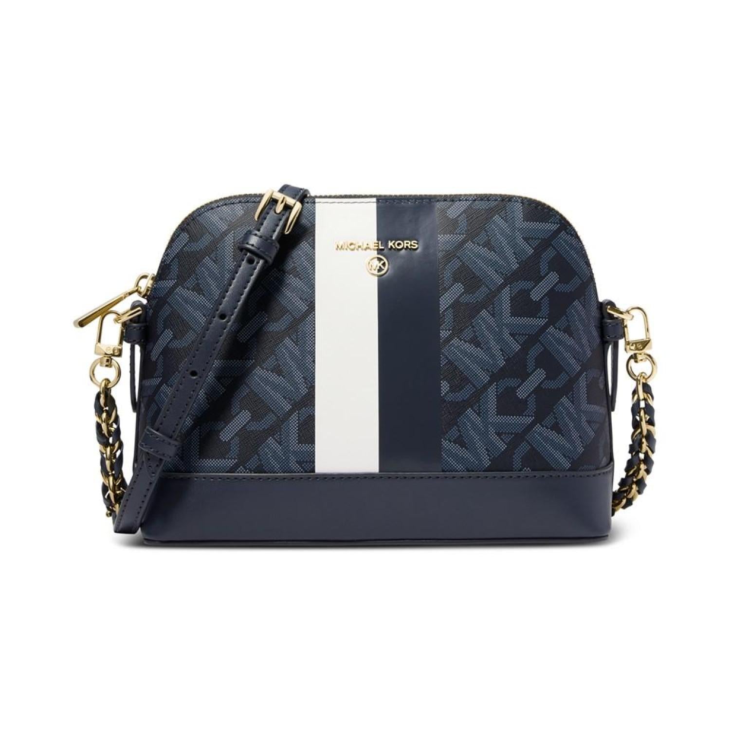 Featuring a classic dome shape, this crossbody by MICHAEL Michael Kors showcases iconic monogram and shiny hardware. The adjustable strap allows you to achieve the perfect fit while the exterior slip pocket is the ideal home for the necessities you need quickly within reach. Small sized bag; 9"W x 7"H x 3-1/2"D (width is measured across the bottom of handbag); 0.82 lbs. approx. weight Silhouette is based off 5'9" model 24"L adjustable crossbody strap Zippered closure Hardware tone varies by color, metal logo at front & exterior back slip pocket Interior zip & slip pockets PVC, polyester, cotton; lining: polyester; trim: polyurethane, cotton, polyester Spot clean Imported