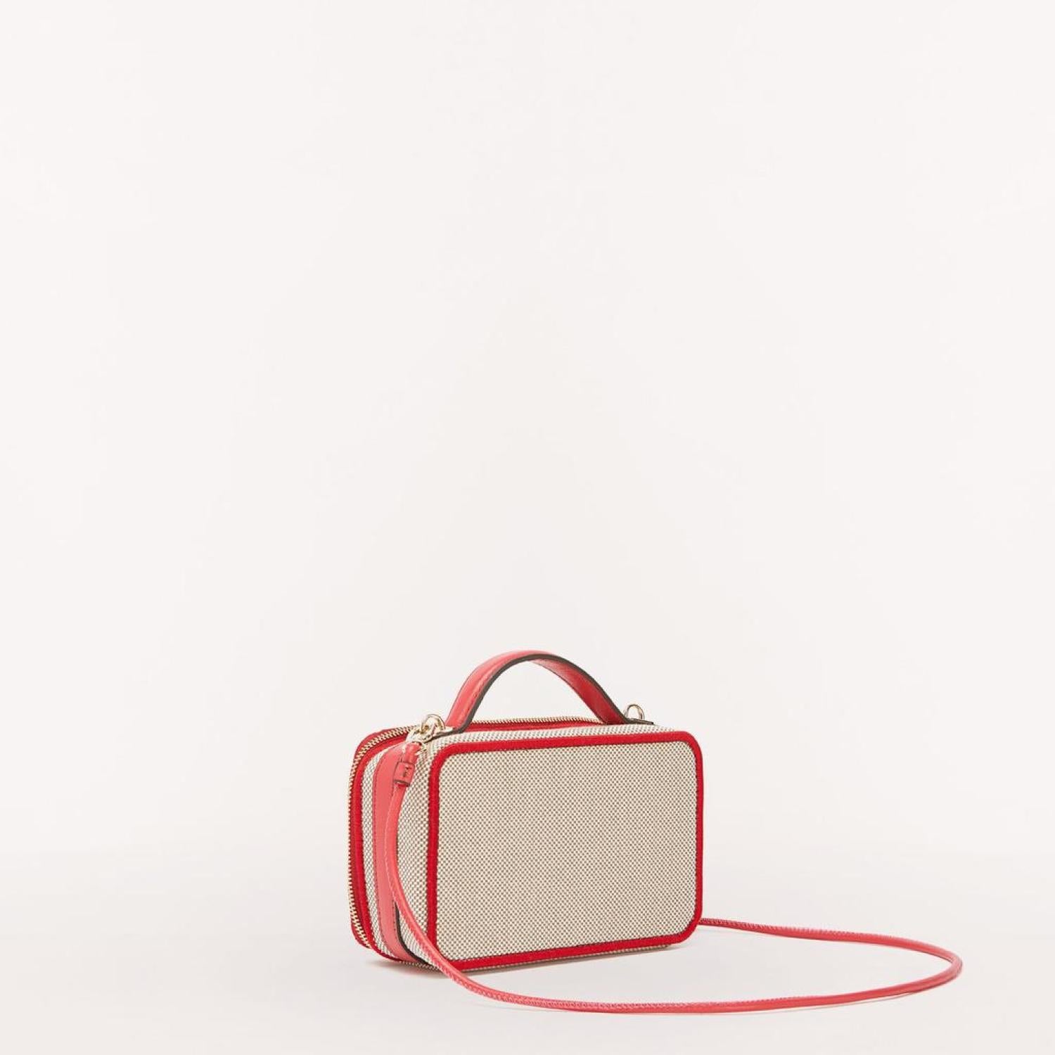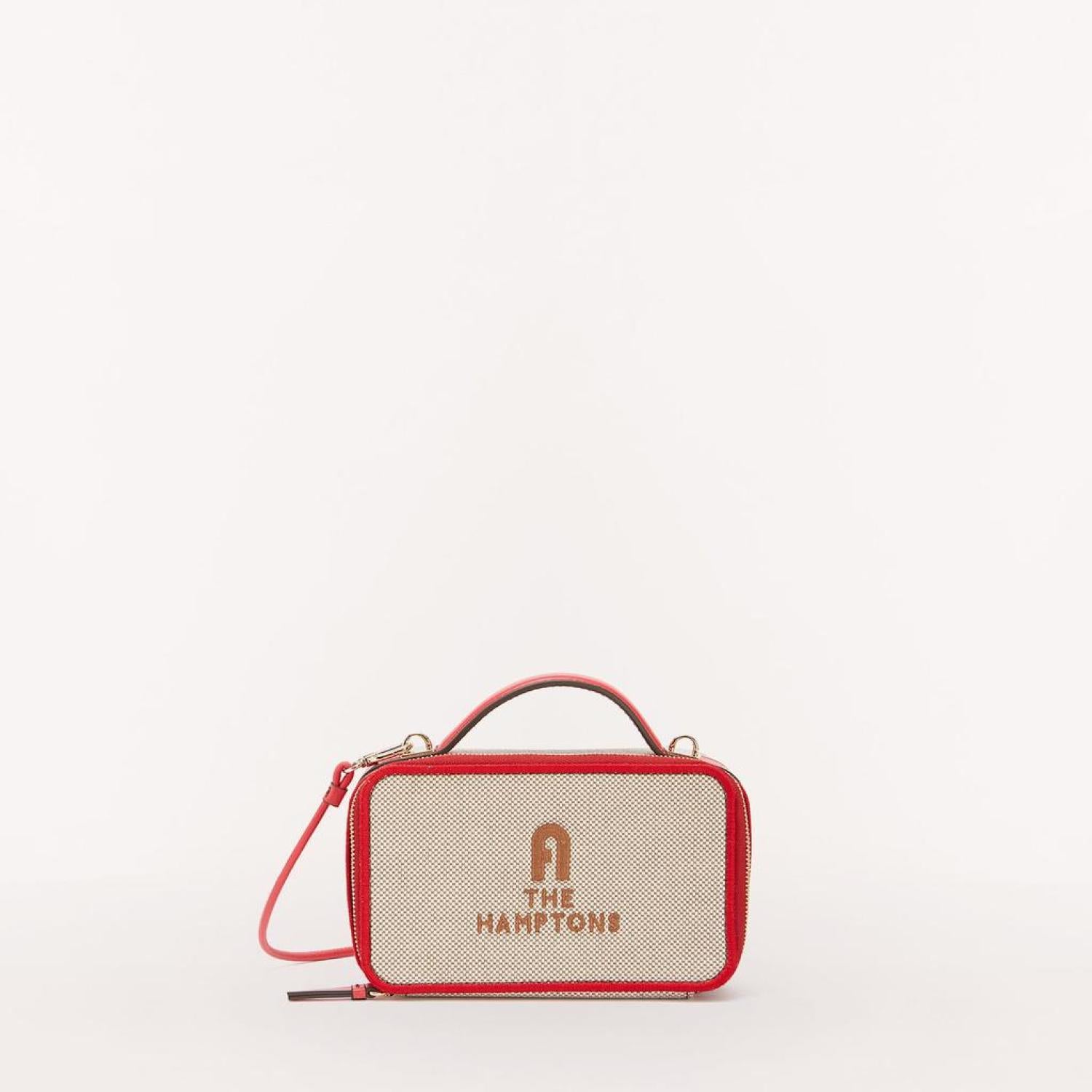 Furla Archive is a mini crossbody bag made of canvas fabric. Featuring a fixed metal chain shoulder strap, the model is finished with an elegant "The Hamptons" print and a mini Furla logo punched on the front. An elegant and chic accessory in which you can store small items and personal belongings. - Zipped closure- Leather top handle- Three lined inner compartments for credit cards and IDs- Galvanised light gold finishes Dimensions 6.5 x 3.94 x 2.17 (w x h x d)