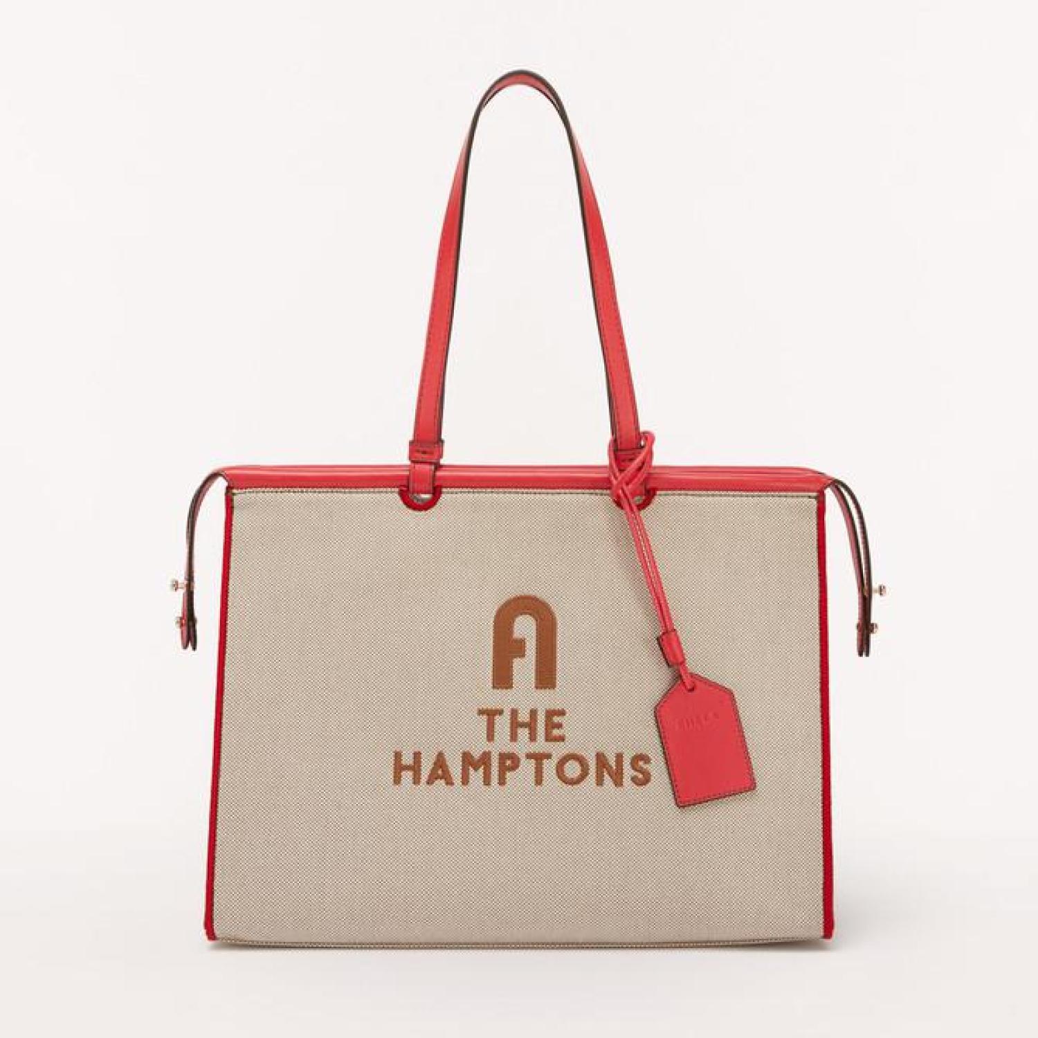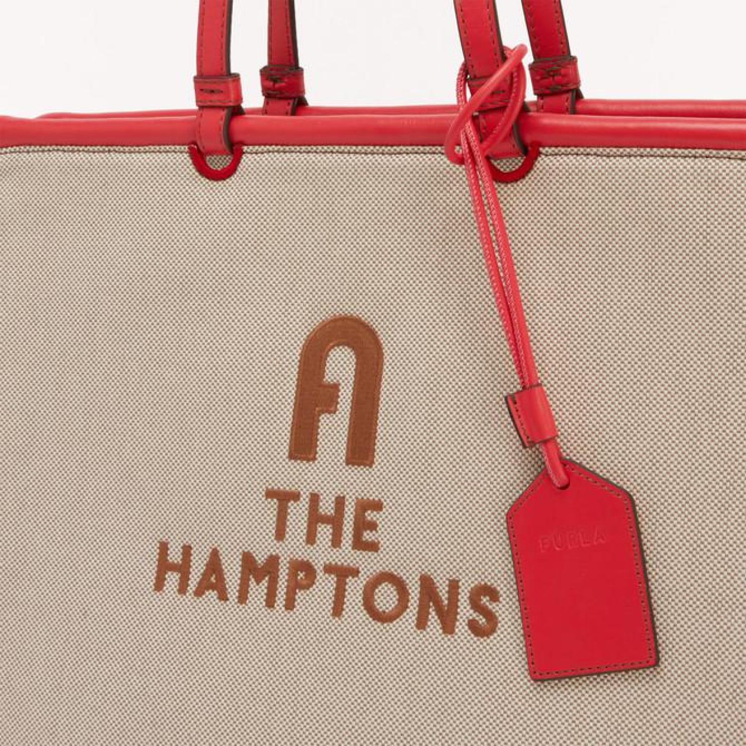 Furla Archive is a large handbag made of canvas fabric. The double-handle model features leather details, and is made unique and distinctive by the "The Hamptons" embroidery on the front. A lightweight and elegant accessory in which you can store all your personal belongings.