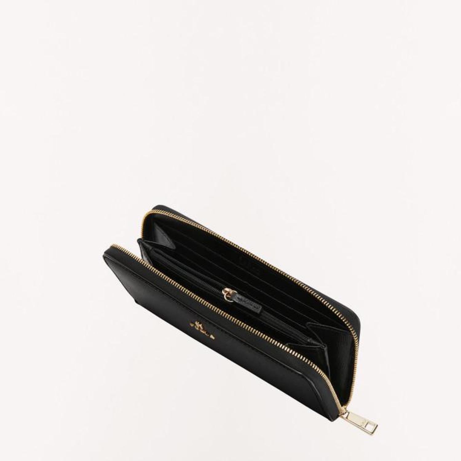 Furla Camelia is a wallet with a zip-around closure made of printed leather. The large accessory allows you to properly organise your ID cards, banknotes and coins in its numerous compartments. - Eight inner credit card and ID card slots - Two side pockets - Two large compartments for banknotes and receipts - One inner zipped coin pocket Mini Furla lettering with Arch logo punched on the front Dimensions 7.68 x 3.54 x 0.75 (w x h x d) material Textured Leather composition 100% Leather Plating Gold Height 3.54 in product code WP00313_ARE000_1007_O6000