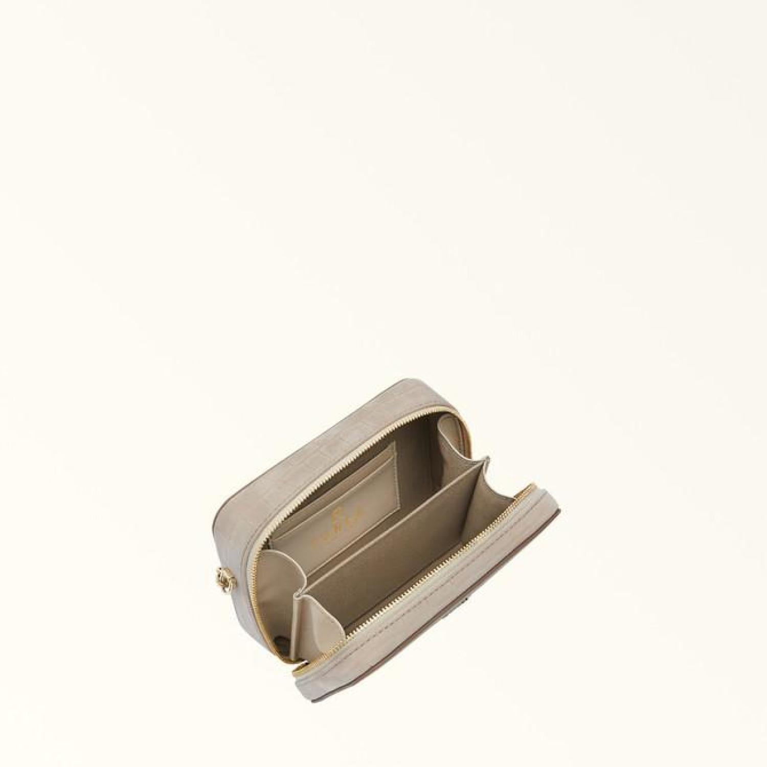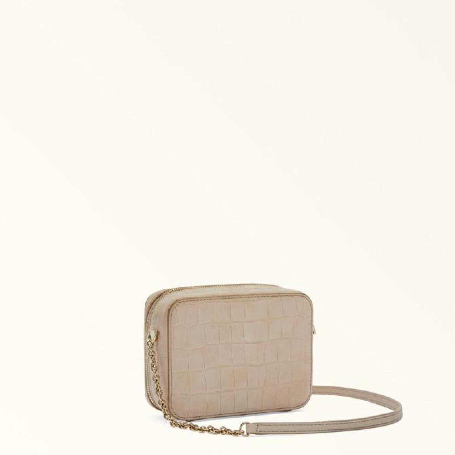 • For your trips into the city, the Furla Camelia camera case is the perfect choice. Its small size makes it the ideal companion, whether it is worn crossbody or over the shoulder, and the leather panel on the chain strap adds a shimmering touch to the casual elegance and velvety allure of the luxurious crocodile-effect print nubuck leather.