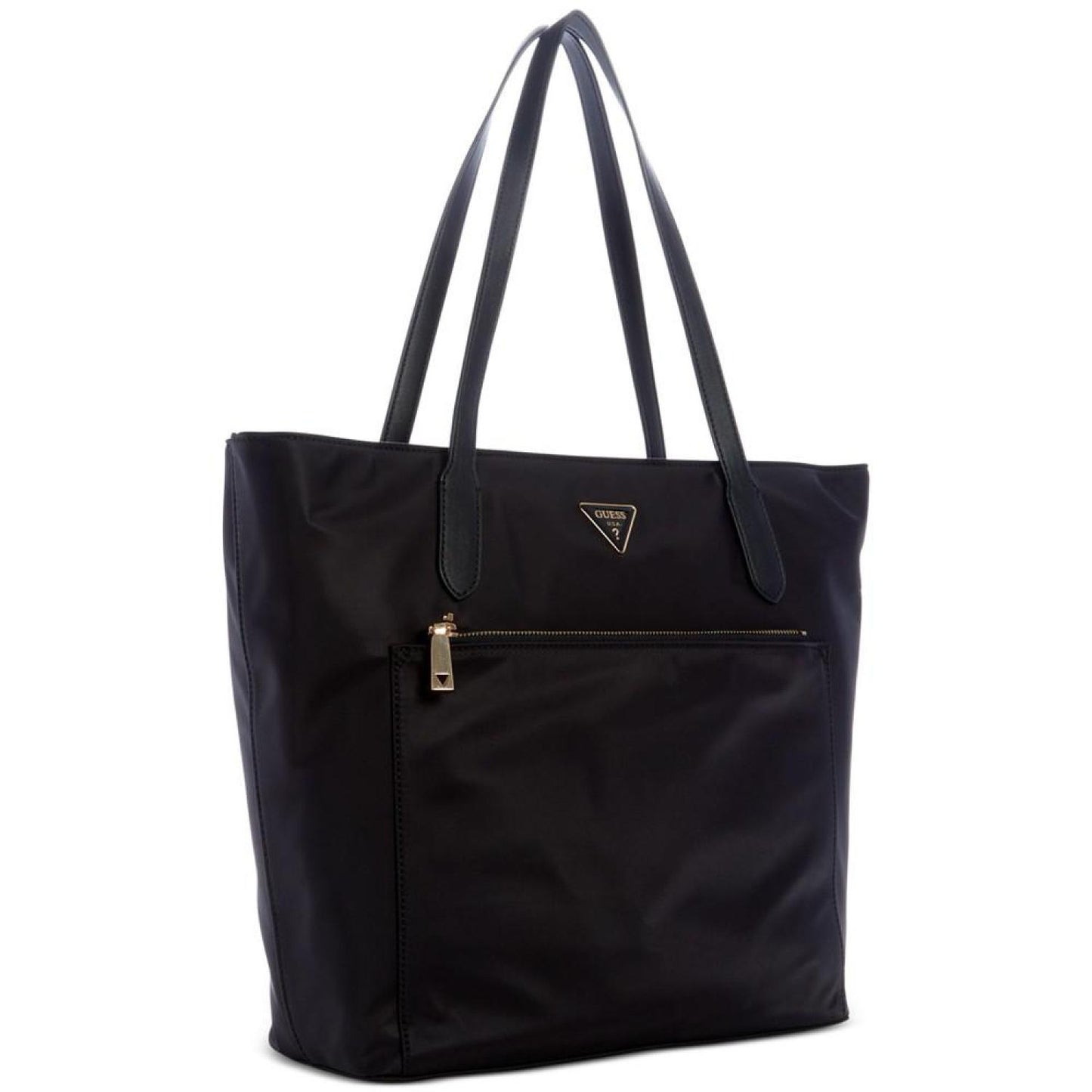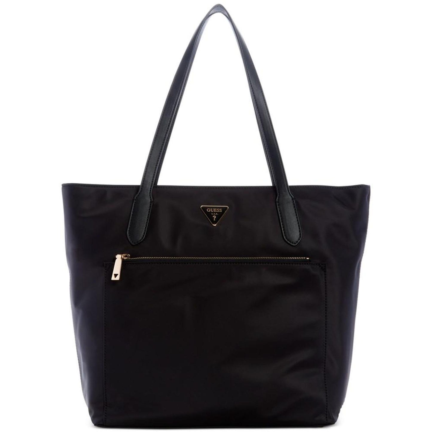 Elegant and practical, the Jaxi Top Zip Tote by GUESS is a perfect companion for any adventure. WHY YOU'LL LOVE IT: a nylon bag is your go-to bag, ready for any day, any weather. It's lightweight, durable and water-resistant! Medium sized bag; 12-1/2"W x 11-3/4"H x 4-3/4"D (width is measured across the bottom of bag); 1.68lbs approx. weight Silhouette is based off 5'9" model 9-1/2"L handles Zippered closure Gold-tone hardware, exterior zip pocket Interior zip & slip pocket Fits all phones & iPad Nylon; trim: faux leather Wipe clean Imported