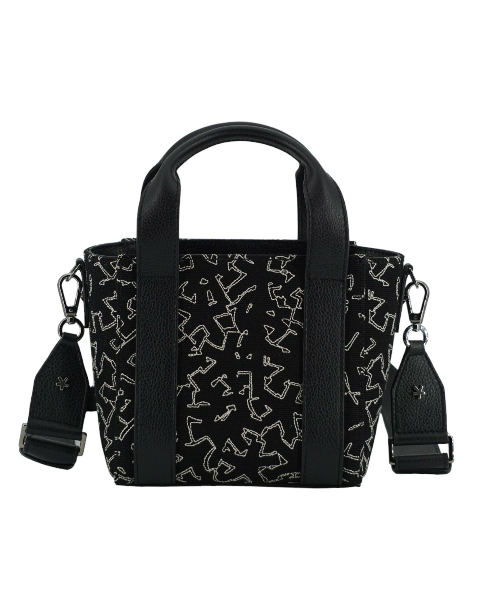 Details: Small tote shoulder bag realised in leather and canvas. With leather top handle strap and removable and adjustable leather shoulder strap. With logo details. One main compartment with small internal slip pocket.