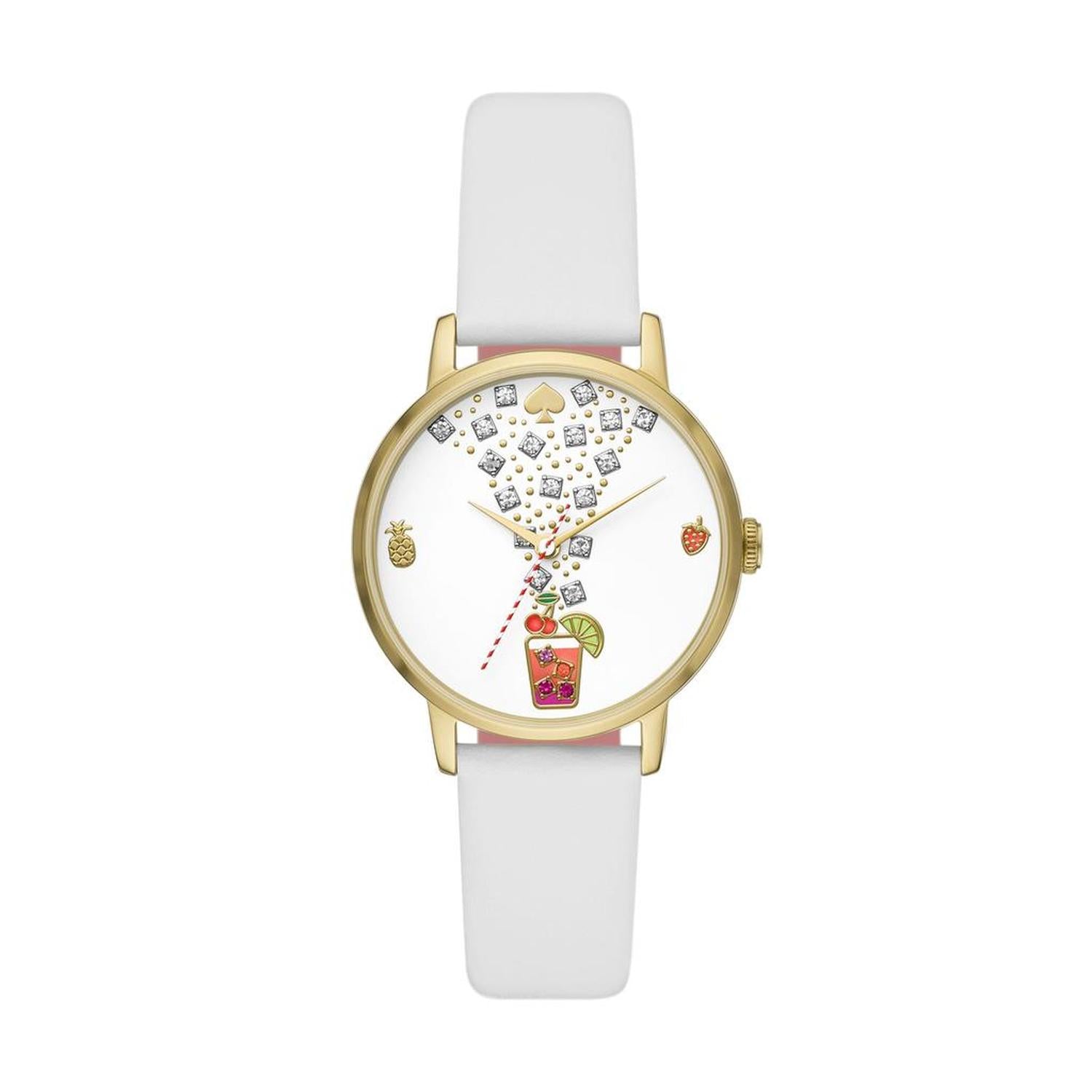 cheers! our new metro watch is embellished with a delectable tropical cocktail. 34mm case, 16mm band width, mineral crystal, quartz movement with 3-hand analog display, imported. round stainless steel case, with a white dial. white, leather band. water resistant up to 30m - will withstand splashes in water.