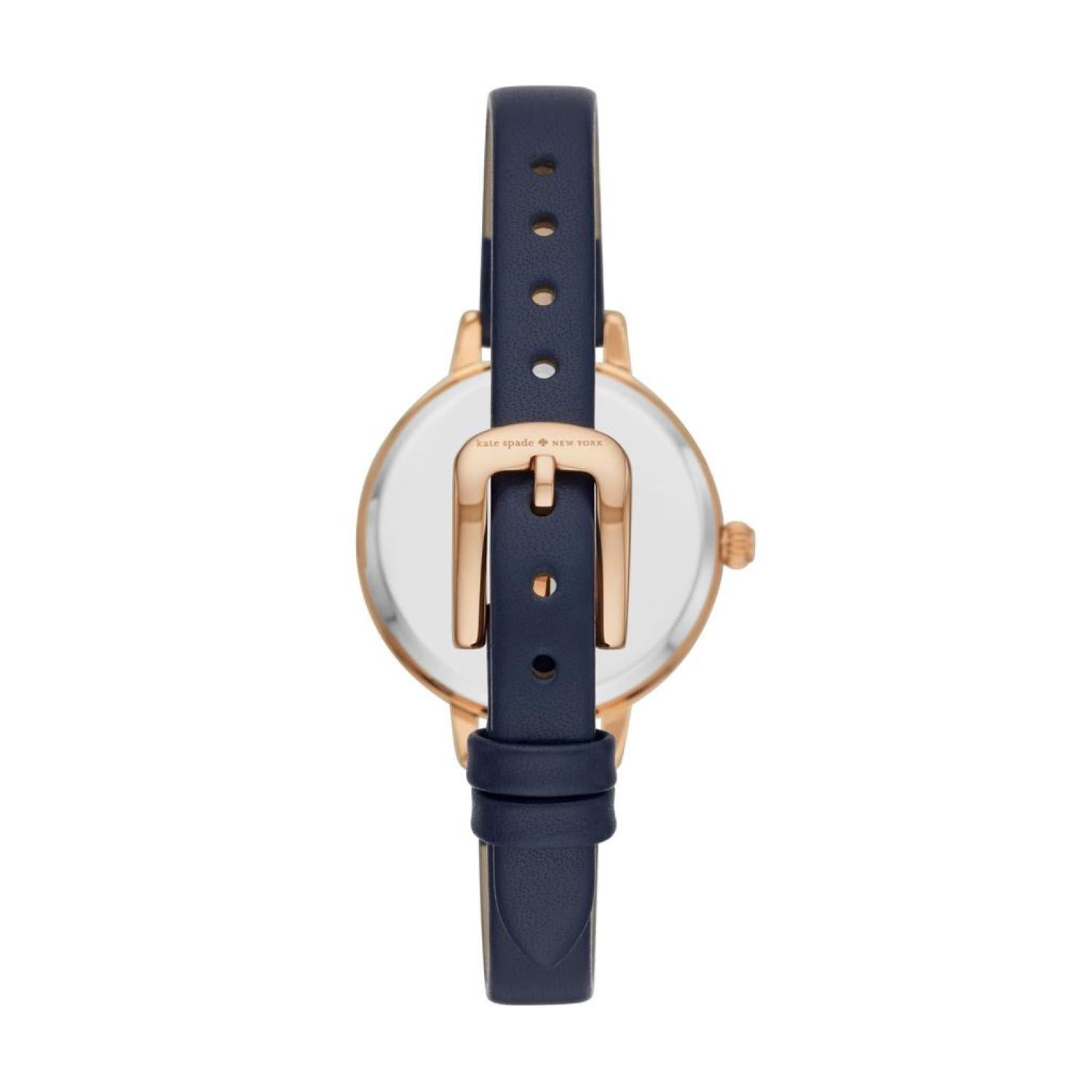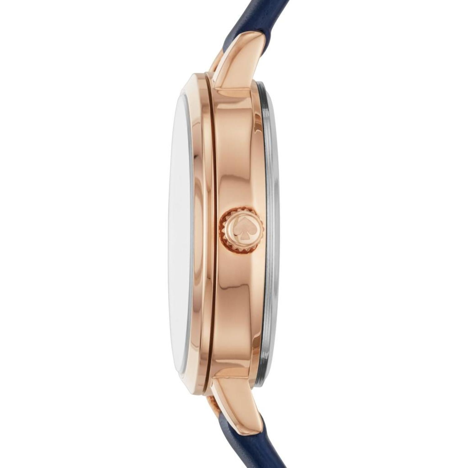 • kate spade's metro 30mm watch features a navy glossy dial with rose gold-tone stick indexes, three-hand movement and navy leather strap. 30mm case, 10mm band width, mineral crystal, Quartz movement with 3-hand analog display, imported. Round alloy case, with a blue dial. Blue, leather band. Water resistant up to 30m - Will withstand splashes in water