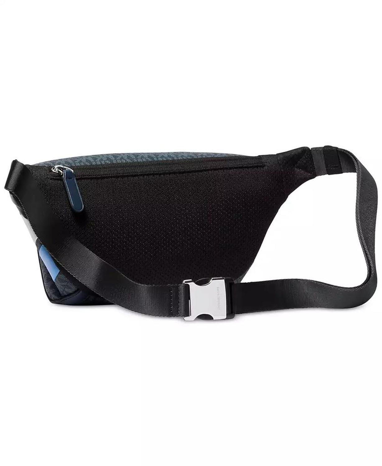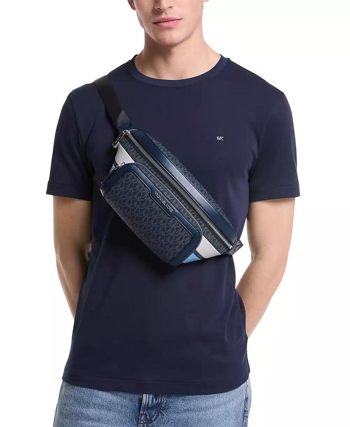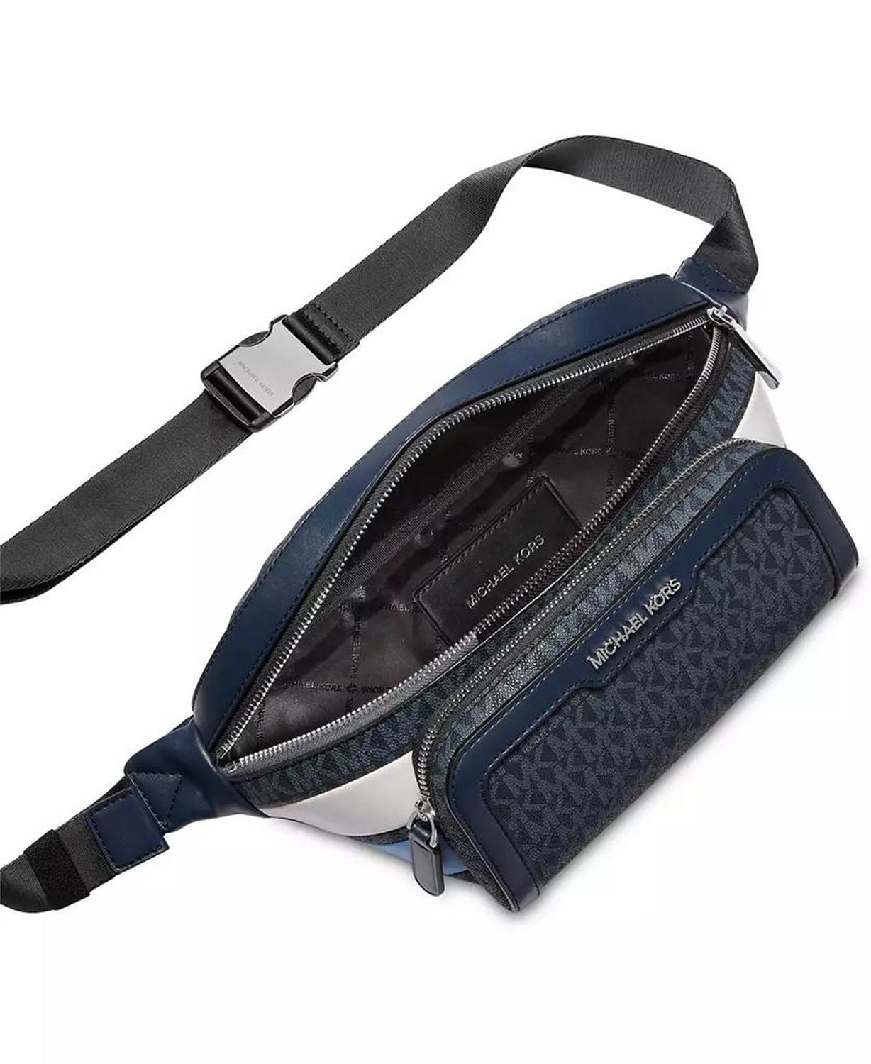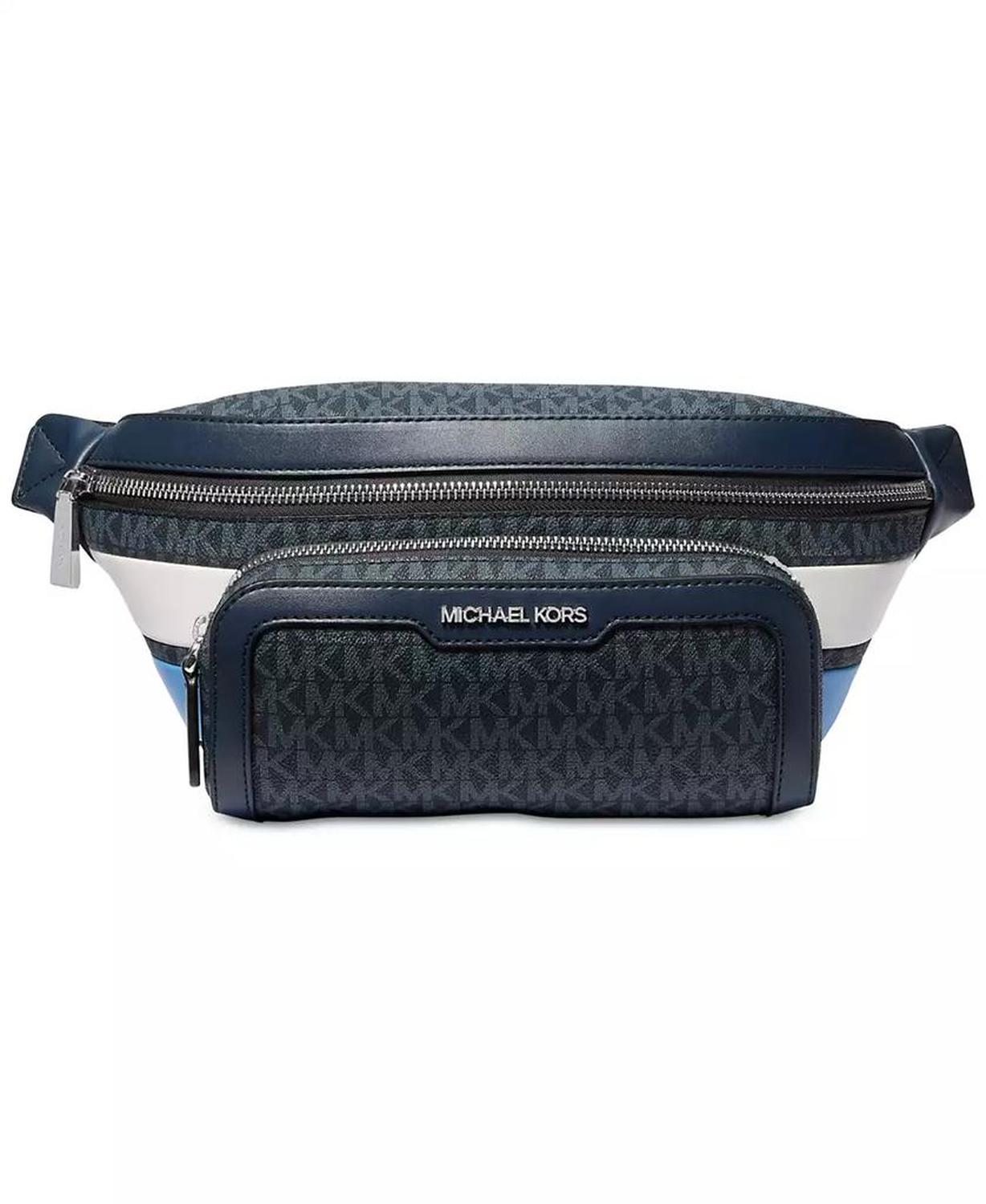 A bold new look in hands-free organization, this Michael Kors belt bag surrounds colorblocked leather with a sleek monogram print. Approx. dimensions: 4-1/8"L x 2-1/2"W x 5-7/10"H Approx. 51" strap Top zipper closure Colorblocked exterior with monogram print; front zip pocket Lined interior with slip pocket 100% leather; lining: 100% polyester Spot clean Imported