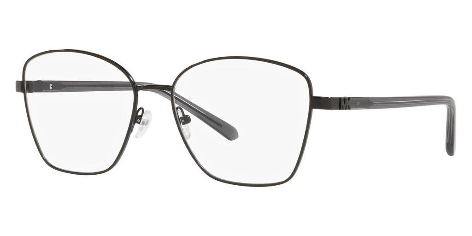 The Michael Kors women's Opticals measure at 54 mm lens width, 16 mm bridge width, and 140 mm arm length. The frame is square-shaped shiny black metal. Made in China (MK3052-1005)